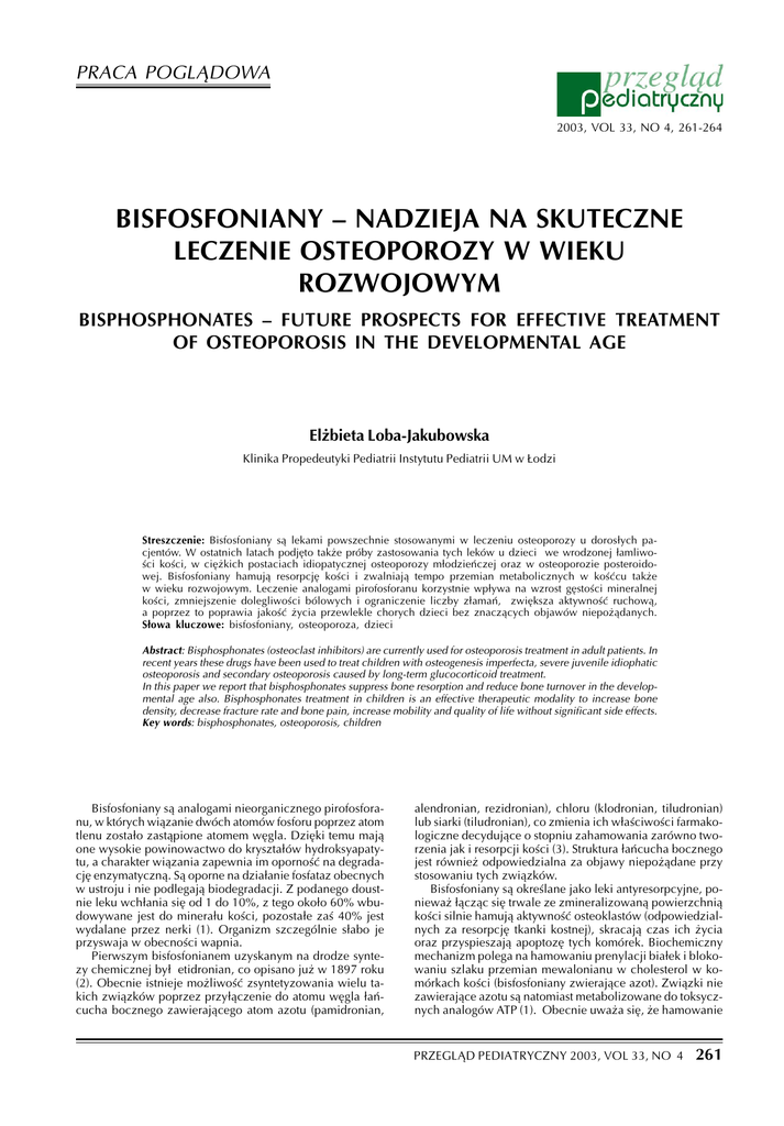 PRACA POGL¥DOWA 2003, VOL 33, NO 4, 261-264 BISFOSFONIANY – NADZIEJA NA SKUTECZNE LECZENIE OSTEOPOROZY W WIEKU ROZWOJOWYM BISPHOSPHONATES – FUTURE PROSPECTS FOR EFFECTIVE TREATMENT OF OSTEOPOROSIS IN THE DEVELOPMENTAL AGE El¿bieta Loba-Jakubowska Klinika Propedeutyki Pediatrii Instytutu Pediatrii UM w £odzi Streszczenie: Bisfosfoniany s¹ lekami powszechnie stosowanymi w leczeniu osteoporozy u doros³ych pacjentów. W ostatnich latach podjêto tak¿e próby zastosowania tych leków u dzieci we wrodzonej ³amliwoœci koœci, w ciê¿kich postaciach idiopatycznej osteoporozy m³odzieñczej oraz w osteoporozie posteroidowej. Bisfosfoniany hamuj¹ resorpcjê koœci i zwalniaj¹ tempo przemian metabolicznych w koœæcu tak¿e w wieku rozwojowym. Leczenie analogami pirofosforanu korzystnie wp³ywa na wzrost gêstoœci mineralnej koœci, zmniejszenie dolegliwoœci bólowych i ograniczenie liczby z³amañ, zwiêksza aktywnoœæ ruchow¹, a poprzez to poprawia jakoœæ ¿ycia przewlekle chorych dzieci bez znacz¹cych objawów niepo¿¹danych. S³owa kluczowe: bisfosfoniany, osteoporoza, dzieci Abstract: Bisphosphonates (osteoclast inhibitors) are currently used for osteoporosis treatment in adult patients. In recent years these drugs have been used to treat children with osteogenesis imperfecta, severe juvenile idiophatic osteoporosis and secondary osteoporosis caused by long-term glucocorticoid treatment. In this paper we report that bisphosphonates suppress bone resorption and reduce bone turnover in the developmental age also. Bisphosphonates treatment in children is an effective therapeutic modality to increase bone density, decrease fracture rate and bone pain, increase mobility and quality of life without significant side effects. Key words: bisphosphonates, osteoporosis, children Bisfosfoniany s¹ analogami nieorganicznego pirofosforanu, w których wi¹zanie dwóch atomów fosforu poprzez atom tlenu zosta³o zast¹pione atomem wêgla. Dziêki temu maj¹ one wysokie powinowactwo do kryszta³ów hydroksyapatytu, a charakter wi¹zania zapewnia im opornoœæ na degradacjê enzymatyczn¹. S¹ oporne na dzia³anie fosfataz obecnych w ustroju i nie podlegaj¹ biodegradacji. Z podanego doustnie leku wch³ania siê od 1 do 10%, z tego oko³o 60% wbudowywane jest do minera³u koœci, pozosta³e zaœ 40% jest wydalane przez nerki (1). Organizm szczególnie s³abo je przyswaja w obecnoœci wapnia. Pierwszym bisfosfonianem uzyskanym na drodze syntezy chemicznej by³ etidronian, co opisano ju¿ w 1897 roku (2). Obecnie istnieje mo¿liwoœæ zsyntetyzowania wielu takich zwi¹zków poprzez przy³¹czenie do atomu wêgla ³añcucha bocznego zawieraj¹cego atom azotu (pamidronian, alendronian, rezidronian), chloru (klodronian, tiludronian) lub siarki (tiludronian), co zmienia ich w³aœciwoœci farmakologiczne decyduj¹ce o stopniu zahamowania zarówno tworzenia jak i resorpcji koœci (3). Struktura ³añcucha bocznego jest równie¿ odpowiedzialna za objawy niepo¿¹dane przy stosowaniu tych zwi¹zków. Bisfosfoniany s¹ okreœlane jako leki antyresorpcyjne, poniewa¿ ³¹cz¹c siê trwale ze zmineralizowan¹ powierzchni¹ koœci silnie hamuj¹ aktywnoœæ osteoklastów (odpowiedzialnych za resorpcjê tkanki kostnej), skracaj¹ czas ich ¿ycia oraz przyspieszaj¹ apoptozê tych komórek. Biochemiczny mechanizm polega na hamowaniu prenylacji bia³ek i blokowaniu szlaku przemian mewalonianu w cholesterol w komórkach koœci (bisfosfoniany zwieraj¹ce azot). Zwi¹zki nie zawieraj¹ce azotu s¹ natomiast metabolizowane do toksycznych analogów ATP (1). Obecnie uwa¿a siê, ¿e hamowanie PRZEGL¥D PEDIATRYCZNY 2003, VOL 33, NO 4 261 Loba-Jakubowska E. resorpcji tkanki kostnej odbywa siê nie tylko bezpoœrednio poprzez oddzia³ywanie na komórki koœciogubne, ale te¿ poœrednio poprzez osteoblasty. Pod wp³ywem bisfosfonianów osteoblasty hamuj¹ syntezê niektórych cytokin, te zaœ mog¹ byæ przyczyn¹ zahamowania rekrutacji prekursorów osteoklastów i ich fuzji w dojrza³e wieloj¹drzaste komórki koœciogubne (1). Poza tym uwalniany z komórek koœciotwórczych pod wp³ywem bisfosfonianów czynnik o niskim ciê¿arze molekularnym hamuje aktywnoœæ dojrza³ych osteoklastów i osteoklastogenezê. Leki te zwiêkszaj¹ tak¿e syntezê bia³ek, kolagenu typu I oraz aktywnoœæ fosfatazy zasadowej i iloœæ wytworzonej tkanki kostnej. Hamuj¹ tak¿e apoptozê osteoblastów wywo³an¹ stosowaniem glikokortykosteroidów (1). Ci sami autorzy pisz¹ te¿ o ich hamuj¹cym wp³ywie (in vitro) na wzrost i rozpuszczanie kryszta³ów apatytu poprzez zmniejszenie wytr¹cania fosforanów wapnia z roztworów, blokowanie transformacji bezpostaciowych fosforanów wapnia do hydroksyapatytów oraz opóŸnianie agregacji kryszta³ów apatytowych do wiêkszych skupisk. Wiek XX to coraz szersze zastosowanie tych leków w leczeniu schorzeñ kostnych, przede wszystkim osteoporozy postmenopauzalnej i starczej (3, 4). Opisuje siê, szczególnie u kobiet, zmniejszenie iloœci z³amañ, poprawê jakoœci ¿ycia oraz wzrost gêstoœci mineralnej koœci. Natomiast u pacjentów ze zmianami nowotworowymi w uk³adzie kostnym bisfosfoniany stosowane s¹ tak¿e w diagnostyce przerzutów oraz w celu zmniejszenia przewlek³ych dolegliwoœci bólowych (1, 5). Coraz czêœciej w ostatnich latach s¹ one stosowane te¿ u dzieci w leczeniu ciê¿kich postaci osteoporozy wieku rozwojowego oraz wrodzonej ³amliwoœci koœci (6, 7). W ostatnim okresie podjêto równie¿ próby zastosowania bisfosfonianów u dzieci z osteoporoz¹ (OP) wtórn¹ spowodowan¹ d³ugotrwa³ym unieruchomieniem lub przewlek³¹ steroidoterapi¹ oraz nadmiernym uwapnieniem tkanek miêkkich. Leczenie wrodzonej ³amliwoœci koœci jest szczególnie trudne. Genetycznie uwarunkowany defekt w syntezie kolagenu, manifestuj¹cy siê klinicznie zwiêkszon¹ podatnoœci¹ na z³amania, wymaga przede wszystkim opieki ortopedycznej i rehabilitacyjnej (w póŸniejszym okresie). Z