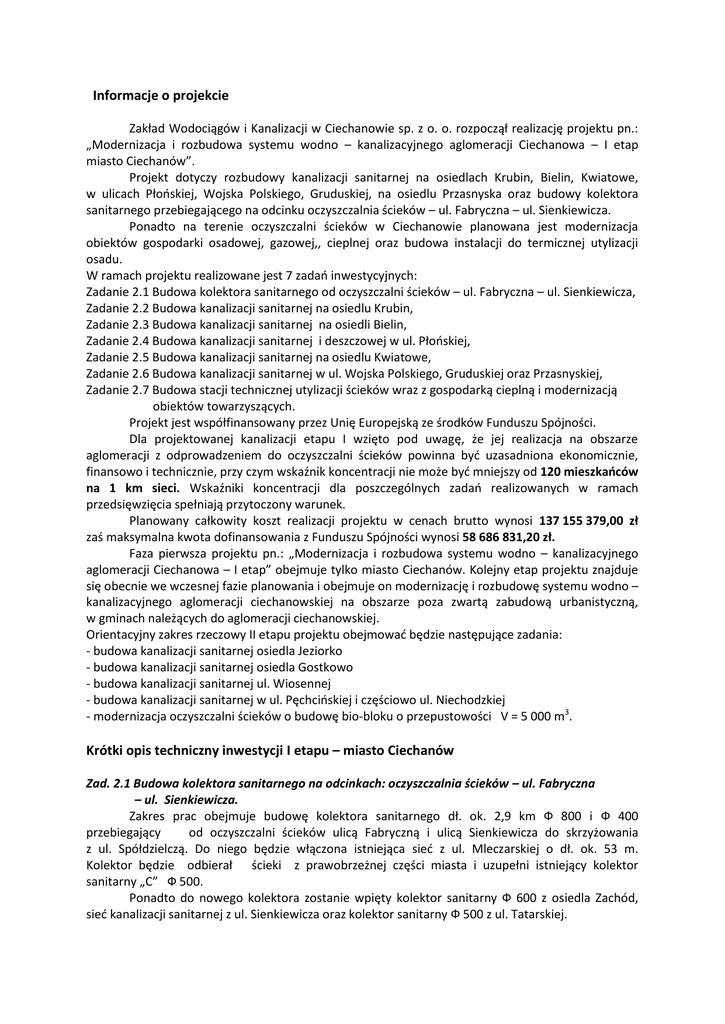 Informacje o projekcie Zakład Wodociągów i Kanalizacji w Ciechanowie sp. z o. o. rozpoczął realizację projektu pn.: „Modernizacja i rozbudowa systemu wodno – kanalizacyjnego aglomeracji Ciechanowa – I etap miasto Ciechanów”. Projekt dotyczy rozbudowy kanalizacji sanitarnej na osiedlach Krubin, Bielin, Kwiatowe, w ulicach Płońskiej, Wojska Polskiego, Gruduskiej, na osiedlu Przasnyska oraz budowy kolektora sanitarnego przebiegającego na odcinku oczyszczalnia ścieków – ul. Fabryczna – ul. Sienkiewicza. Ponadto na terenie oczyszczalni ścieków w Ciechanowie planowana jest modernizacja obiektów gospodarki osadowej, gazowej,, cieplnej oraz budowa instalacji do termicznej utylizacji osadu. W ramach projektu realizowane jest 7 zadań inwestycyjnych: Zadanie 2.1 Budowa kolektora sanitarnego od oczyszczalni ścieków – ul. Fabryczna – ul. Sienkiewicza, Zadanie 2.2 Budowa kanalizacji sanitarnej na osiedlu Krubin, Zadanie 2.3 Budowa kanalizacji sanitarnej na osiedli Bielin, Zadanie 2.4 Budowa kanalizacji sanitarnej i deszczowej w ul. Płońskiej, Zadanie 2.5 Budowa kanalizacji sanitarnej na osiedlu Kwiatowe, Zadanie 2.6 Budowa kanalizacji sanitarnej w ul. Wojska Polskiego, Gruduskiej oraz Przasnyskiej, Zadanie 2.7 Budowa stacji technicznej utylizacji ścieków wraz z gospodarką cieplną i modernizacją obiektów towarzyszących. Projekt jest współfinansowany przez Unię Europejską ze środków Funduszu Spójności. Dla projektowanej kanalizacji etapu I wzięto pod uwagę, że jej realizacja na obszarze aglomeracji z odprowadzeniem do oczyszczalni ścieków powinna być uzasadniona ekonomicznie, finansowo i technicznie, przy czym wskaźnik koncentracji nie może być mniejszy od 120 mieszkańców na 1 km sieci. Wskaźniki koncentracji dla poszczególnych zadań realizowanych w ramach przedsięwzięcia spełniają przytoczony warunek. Planowany całkowity koszt realizacji projektu w cenach brutto wynosi 137 155 379,00 zł zaś maksymalna kwota dofinansowania z Funduszu Spójności wynosi 58 686 831,20 zł. Faza pierwsza projektu pn.: „Modernizacja i rozbudowa systemu wodno – kanalizacyjnego aglomeracji Ciechanowa – I etap” obejmuje tylko miasto Ciechanów. Kolejny etap projektu znajduje się obecnie we wczesnej fazie planowania i obejmuje on modernizację i rozbudowę systemu wodno – kanalizacyjnego aglomeracji ciechanowskiej na obszarze poza zwartą zabudową urbanistyczną, w gminach należących do aglomeracji ciechanowskiej. Orientacyjny zakres rzeczowy II etapu projektu obejmować będzie następujące zadania: - budowa kanalizacji sanitarnej osiedla Jeziorko - budowa kanalizacji sanitarnej osiedla Gostkowo - budowa kanalizacji sanitarnej ul. Wiosennej - budowa kanalizacji sanitarnej w ul. Pęchcińskiej i częściowo ul. Niechodzkiej - modernizacja oczyszczalni ścieków o budowę bio-bloku o przepustowości V = 5 000 m3. Krótki opis techniczny inwestycji I etapu – miasto Ciechanów Zad. 2.1 Budowa kolektora sanitarnego na odcinkach: oczyszczalnia ścieków – ul. Fabryczna – ul. Sienkiewicza. Zakres prac obejmuje budowę kolektora sanitarnego dł. ok. 2,9 km Ф 800 i Ф 400 przebiegający od oczyszczalni ścieków ulicą Fabryczną i ulicą Sienkiewicza do skrzyżowania z ul. Spółdzielczą. Do niego będzie włączona istniejąca sieć z ul. Mleczarskiej o dł. ok. 53 m. Kolektor będzie odbierał ścieki z prawobrzeżnej części miasta i uzupełni istniejący kolektor sanitarny „C” Ф 500. Ponadto do nowego kolektora zostanie wpięty kolektor sanitarny Ф 600 z osiedla Zachód, sieć kanalizacji sanitarnej z ul. Sienkiewicza oraz kolektor sanitarny Ф 500 z ul. Tatarskiej. Zad. 2.2 Budowa kanalizacji sanitarnej na osiedlu Krubin – inwestycja zrealizowana w okresie 26.10.2010 r. do 23.01.2012 r. Zakres prac obejmował budowę kanalizacji sanitarnej na osiedlu Krubin w systemie grawitacyjnym o dł. 4,8 km, przewody tłoczne – dł. 0,52 km i 128 szt. przyłączy o dł. 1,2 km . Projektowana kanalizacja o łącznej długości 6,5 km włączona została do istniejącego kolektora sanitarnego Ф 600 przy skrzyżowaniu ulic Ludowej i Sońskiej. Ponadto wybudowano dwie przepompownie ścieków na terenie Domu Pomocy Społecznej przy ul. Kruczej oraz Specjalistycznego Szpitala Wojewódzkiego przy ul. Długiej. Zad. 2.3 Budowa kanalizacji sanitarnej na osiedlu Bielin. Przewiduje się budowę kanalizacji o łącznej dł. ok., 7,45 km w systemie grawitacyjnym (ok. 4,7 km), tłocznym (ok. 0,8 km), ok. 208 przyłączy do posesji o dł. ok. 1,95 km i związane z tym przepompownie ścieków. Zad. 2.4 Budowa kanalizacji sanitarnej w ul. Płońskiej – w trakcie przetargu Projekt techniczny przewiduje budowę kanalizacji sanitarnej grawitacyjnej dł. ok. 1,55 km i tłocznej ok. 0,32 km o łącznej dł. ok. 1,9 km z ok. 76 przyłączami o dł. ok. 1,0 km, w sumie ok. 2,9 km i związane z tym przepompownie ścieków. Zostanie rozłączona sieć kanalizacji sanitarne od kanalizacji deszczowej. Ulegnie też przebudowie i naprawie odcinek kanalizacji sanitarnej w ul. Płońskiej wykonany z rur kamionkowych i betonowych Ф 200 poprzez wyłożenie rękawem żywicznym lub wymianę dł. ok. 0,5 km . Zad. 2.5 Budowa kanalizacji sanitarnej na osiedlu Kwiatowe Przewiduje się budowę kanalizacji o dł. ok. 3,2 km w systemie grawitacyjnym oraz ok. 145 przyłączy o dł. ok. 1,1 km dla osiedla Kwiatowe, ponadto dla 2 odcinków ulic odprowadzenie ścieków będzie wymagało zastosowania pompowni lokalnych i rurociągów tłocznych (ok. 0,8 km). Razem nowej kanalizacji wybuduje się ok. 5,0 km. Projektowana kanalizacja zakończona będzie pompownią zlokalizowaną przy ul. Wesołej tłoczącej ścieki do istniejącej kanalizacji w ul. Śmiecińskiej. Przewiduje się wymianę, ze względu na zły stan techniczny, rurociągu w ul. Mławskiej Ф 300 na odcinku od przepompowni ścieków do wjazdu na dworzec PKP o dł. ok. 210 m . Zad. 2.6 Budowa kanalizacji sanitarnej w 