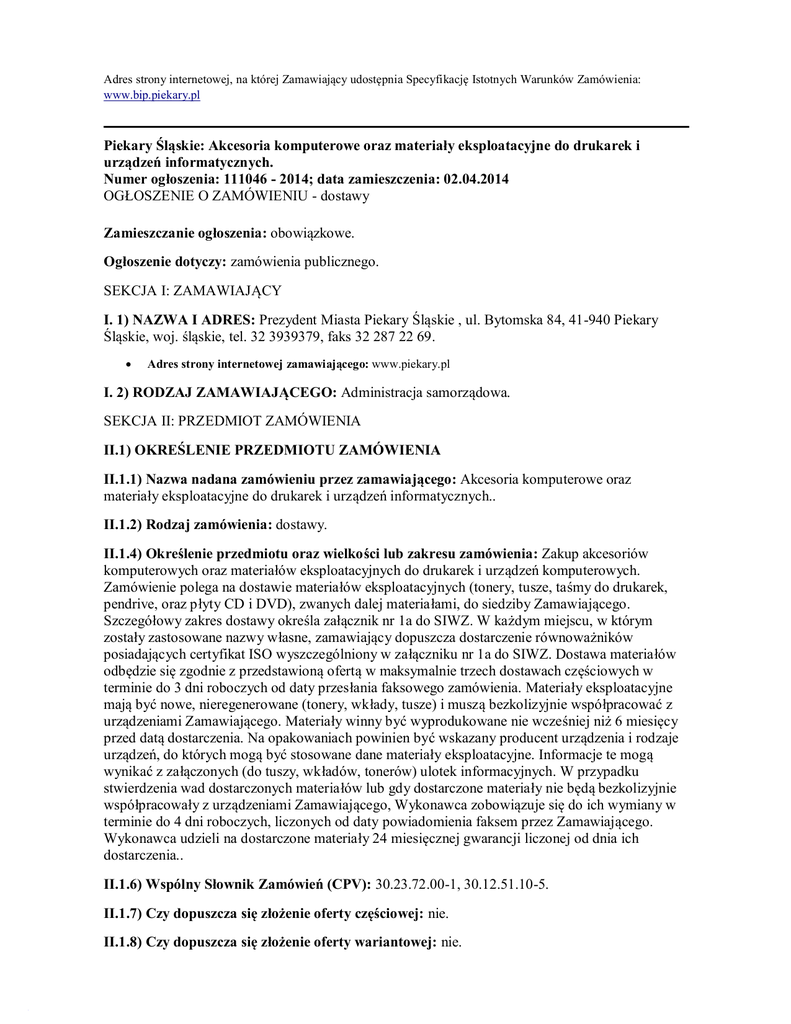 Adres strony internetowej, na której Zamawiający udostępnia Specyfikację Istotnych Warunków Zamówienia: www.bip.piekary.pl Piekary Śląskie: Akcesoria komputerowe oraz materiały eksploatacyjne do drukarek i urządzeń informatycznych. Numer ogłoszenia: 111046 - 2014; data zamieszczenia: 02.04.2014 OGŁOSZENIE O ZAMÓWIENIU - dostawy Zamieszczanie ogłoszenia: obowiązkowe. Ogłoszenie dotyczy: zamówienia publicznego. SEKCJA I: ZAMAWIAJĄCY I. 1) NAZWA I ADRES: Prezydent Miasta Piekary Śląskie , ul. Bytomska 84, 41-940 Piekary Śląskie, woj. śląskie, tel. 32 3939379, faks 32 287 22 69. • Adres strony internetowej zamawiającego: www.piekary.pl I. 2) RODZAJ ZAMAWIAJĄCEGO: Administracja samorządowa. SEKCJA II: PRZEDMIOT ZAMÓWIENIA II.1) OKREŚLENIE PRZEDMIOTU ZAMÓWIENIA II.1.1) Nazwa nadana zamówieniu przez zamawiającego: Akcesoria komputerowe oraz materiały eksploatacyjne do drukarek i urządzeń informatycznych.. II.1.2) Rodzaj zamówienia: dostawy. II.1.4) Określenie przedmiotu oraz wielkości lub zakresu zamówienia: Zakup akcesoriów komputerowych oraz materiałów eksploatacyjnych do drukarek i urządzeń komputerowych. Zamówienie polega na dostawie materiałów eksploatacyjnych (tonery, tusze, taśmy do drukarek, pendrive, oraz płyty CD i DVD), zwanych dalej materiałami, do siedziby Zamawiającego. Szczegółowy zakres dostawy określa załącznik nr 1a do SIWZ. W każdym miejscu, w którym zostały zastosowane nazwy własne, zamawiający dopuszcza dostarczenie równoważników posiadających certyfikat ISO wyszczególniony w załączniku nr 1a do SIWZ. Dostawa materiałów odbędzie się zgodnie z przedstawioną ofertą w maksymalnie trzech dostawach częściowych w terminie do 3 dni roboczych od daty przesłania faksowego zamówienia. Materiały eksploatacyjne mają być nowe, nieregenerowane (tonery, wkłady, tusze) i muszą bezkolizyjnie współpracować z urządzeniami Zamawiającego. Materiały winny być wyprodukowane nie wcześniej niż 6 miesięcy przed datą dostarczenia. Na opakowaniach powinien być wskazany producent urządzenia i rodzaje urządzeń, do których mogą być stosowane dane materiały eksploatacyjne. Informacje te mogą wynikać z załączonych (do tuszy, wkładów, tonerów) ulotek informacyjnych. W przypadku stwierdzenia wad dostarczonych materiałów lub gdy dostarczone materiały nie będą bezkolizyjnie współpracowały z urządzeniami Zamawiającego, Wykonawca zobowiązuje się do ich wymiany w terminie do 4 dni roboczych, liczonych od daty powiadomienia faksem przez Zamawiającego. Wykonawca udzieli na dostarczone materiały 24 miesięcznej gwarancji liczonej od dnia ich dostarczenia.. II.1.6) Wspólny Słownik Zamówień (CPV): 30.23.72.00-1, 30.12.51.10-5. II.1.7) Czy dopuszcza się złożenie oferty częściowej: nie. II.1.8) Czy dopuszcza się złożenie oferty wariantowej: nie. II.2) CZAS TRWANIA ZAMÓWIENIA LUB TERMIN WYKONANIA: Okres w miesiącach: 6. SEKCJA III: INFORMACJE O CHARAKTERZE PRAWNYM, EKONOMICZNYM, FINANSOWYM I TECHNICZNYM III.1) WADIUM Informacja na temat wadium: nie dotyczy III.2) ZALICZKI III.4) INFORMACJA O OŚWIADCZENIACH LUB DOKUMENTACH, JAKIE MAJĄ DOSTARCZYĆ WYKONAWCY W CELU POTWIERDZENIA SPEŁNIANIA WARUNKÓW UDZIAŁU W POSTĘPOWANIU ORAZ NIEPODLEGANIA WYKLUCZENIU NA PODSTAWIE ART. 24 UST. 1 USTAWY III.4.1) W zakresie wykazania spełniania przez wykonawcę warunków, o których mowa w art. 22 ust. 1 ustawy, oprócz oświadczenia o spełnianiu warunków udziału w postępowaniu należy przedłożyć: III.4.2) W zakresie potwierdzenia niepodlegania wykluczeniu na podstawie art. 24 ust. 1 ustawy, należy przedłożyć: • oświadczenie o braku podstaw do wykluczenia; • aktualny odpis z właściwego rejestru lub z centralnej ewidencji i informacji o działalności gospodarczej, jeżeli odrębne przepisy wymagają wpisu do rejestru lub ewidencji, w celu wykazania braku podstaw do wykluczenia w oparciu o art. 24 ust. 1 pkt 2 ustawy, wystawiony nie wcześniej niż 6 miesięcy przed upływem terminu składania wniosków o dopuszczenie do udziału w postępowaniu o udzielenie zamówienia albo składania ofert; III.4.3) Dokumenty podmiotów zagranicznych Jeżeli wykonawca ma siedzibę lub miejsce zamieszkania poza terytorium Rzeczypospolitej Polskiej, przedkłada: III.4.3.1) dokument wystawiony w kraju, w którym ma siedzibę lub miejsce zamieszkania potwierdzający, że: • nie otwarto jego likwidacji ani nie ogłoszono upadłości - wystawiony nie wcześniej niż 6 miesięcy przed upływem terminu składania wniosków o dopuszczenie do udziału w postępowaniu o udzielenie zamówienia albo składania ofert; III.4.4) Dokumenty dotyczące przynależności do tej samej grupy kapitałowej • lista podmiotów należących do tej samej grupy kapitałowej w rozumieniu ustawy z dnia 16 lutego 2007 r. o ochronie konkurencji i konsumentów albo informacji o tym, że nie należy do grupy kapitałowej; III.6) INNE DOKUMENTY Inne dokumenty niewymienione w pkt III.4) albo w pkt III.5) Wypełniony formularz oferty (załącznik nr 1 do SIWZ) oraz formularz cenowy zawierający ceny jednostkowe poszczególnych materiałów - załącznik nr 1a do SIWZ SEKCJA IV: PROCEDURA IV.1) TRYB UDZIELENIA ZAMÓWIENIA IV.1.1) Tryb udzielenia zamówienia: przetarg nieograniczony. IV.2) KRYTERIA OCENY OFERT IV.2.1) Kryteria oceny ofert: najniższa cena. IV.4) INFORMACJE ADMINISTRACYJNE IV.4.1) Adres strony internetowej, na której jest dostępna specyfikacja istotnych warunków zamówienia: www.bip.piekary.pl Specyfikację istotnych warunków zamówienia można uzyskać pod adresem: Urząd Miasta Piekary Śląskie ul. Bytomska 84 41-940 Piekary Śląskie Biuro Zamówień Publicznych , pok.218. IV.4.4) Termin składania wniosków o dopuszczenie do udziału w postępowaniu lub ofert: 10.04.2014 godzina 11:30, miejsce: Urząd Miasta Piekary Śląskie ul. Bytomska 84 41-940 Piekary Śląskie Biuro Zamówień Publicznych , pok.218. IV
