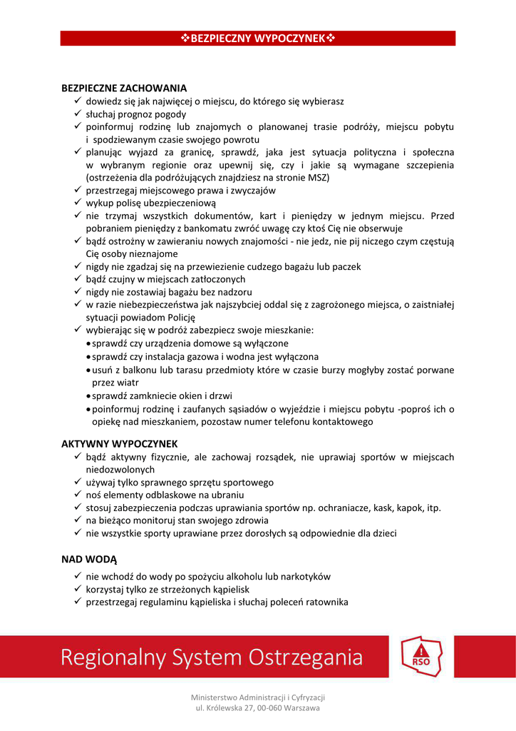 vBEZPIECZNY WYPOCZYNEKv BEZPIECZNE ZACHOWANIA ü dowiedz się jak najwięcej o miejscu, do którego się wybierasz ü słuchaj prognoz pogody ü poinformuj rodzinę lub znajomych o planowanej trasie podróży, miejscu pobytu i spodziewanym czasie swojego powrotu ü planując wyjazd za granicę, sprawdź, jaka jest sytuacja polityczna i społeczna w wybranym regionie oraz upewnij się, czy i jakie są wymagane szczepienia (ostrzeżenia dla podróżujących znajdziesz na stronie MSZ) ü przestrzegaj miejscowego prawa i zwyczajów ü wykup polisę ubezpieczeniową ü nie trzymaj wszystkich dokumentów, kart i pieniędzy w jednym miejscu. Przed pobraniem pieniędzy z bankomatu zwróć uwagę czy ktoś Cię nie obserwuje ü bądź ostrożny w zawieraniu nowych znajomości - nie jedz, nie pij niczego czym częstują Cię osoby nieznajome ü nigdy nie zgadzaj się na przewiezienie cudzego bagażu lub paczek ü bądź czujny w miejscach zatłoczonych ü nigdy nie zostawiaj bagażu bez nadzoru ü w razie niebezpieczeństwa jak najszybciej oddal się z zagrożonego miejsca, o zaistniałej sytuacji powiadom Policję ü wybierając się w podróż zabezpiecz swoje mieszkanie: · sprawdź czy urządzenia domowe są wyłączone · sprawdź czy instalacja gazowa i wodna jest wyłączona · usuń z balkonu lub tarasu przedmioty które w czasie burzy mogłyby zostać porwane przez wiatr · sprawdź zamkniecie okien i drzwi · poinformuj rodzinę i zaufanych sąsiadów o wyjeździe i miejscu pobytu -poproś ich o opiekę nad mieszkaniem, pozostaw numer telefonu kontaktowego AKTYWNY WYPOCZYNEK ü bądź aktywny fizycznie, ale zachowaj rozsądek, nie uprawiaj sportów w miejscach niedozwolonych ü używaj tylko sprawnego sprzętu sportowego ü noś elementy odblaskowe na ubraniu ü stosuj zabezpieczenia podczas uprawiania sportów np. ochraniacze, kask, kapok, itp. ü na bieżąco monitoruj stan swojego zdrowia ü nie wszystkie sporty uprawiane przez dorosłych są odpowiednie dla dzieci NAD WODĄ ü nie wchodź do wody po spożyciu alkoholu lub narkotyków ü korzystaj tylko ze strzeżonych kąpielisk ü przestrzegaj regulaminu kąpieliska i słuchaj poleceń ratownika Ministerstwo Administracji i Cyfryzacji ul. Królewska 27, 00-060 Warszawa ü ü ü ü ü ü unikaj pływania samemu nie skacz na głowę do nieznanej wody nie zanurzaj się gwałtownie w wodzie po długim przebywaniu na słońcu zawsze bądź w pobliżu gdy Twoje dziecko wchodzi do wody pływając łodzią, kajakiem, rowerem wodnym miej na sobie kamizelkę ratunkową korzystając ze sprzętu pływającego sprawdzaj prognozy pogody i nie lekceważ sygnałów o niebezpieczeństwie W GÓRACH ü planując wyjście w góry sprawdź informacje o szlakach i warunkach panujących w górach ü wybierając trasę weź pod uwagę możliwości wszystkich uczestników wyprawy ü w góry wychodź rano, najlepiej w grupie ü wychodząc na wycieczkę, zostaw wiadomość, dokąd i którędy się udajesz i kiedy zamierzasz wrócić ü nigdy nie schodź ze szlaku i nie oddalaj się od grupy ü weź ze sobą zapas wody i jedzenia, naładowany telefon komórkowy (zapisz numer ratunkowy do GOPR/TOPR), ciepłe i nieprzemakalne ubranie na wypadek zmiany pogody, latarkę (najlepiej na dynamo), mapę, podręczną apteczkę i zapałki zapakowane tak, by nie zamokły ü pamiętaj o odpowiednim ubraniu i wygodnych butach, dostosowanych do terenu i pogody; ü w przypadku pogorszenia pogody zawróć z trasy W LESIE ü stosuj się do zaleceń na tablicach informacyjnych i znakach ü na dłuższą wycieczkę i biwak w lesie zabierz ze sobą zapas wody i jedzenia, nieprzemakalne ubranie, naładowany telefon komórkowy, latarkę (najlepiej na dynamo), mapę, podręczną apteczkę i zapałki zapakowane tak, by nie zamokły ü biwakuj i rozpalaj ogniska tylko w wyznaczonych miejscach, opuszczając obozowisko pozostaw po sobie porządek ü nie zakłócaj ciszy, nie niszcz siedlisk, nie zrywaj roślin chronionych ü nie zbieraj grzybów, jeśli nie jesteś pewny czy są jadalne ü nie jedz nieznanych owoców, niektóre na pozór wyglądające na jadalne są silnie trujące, np. wilcza jagoda, konwalia majowa, zimowit jesienny czy tojad ü uważaj na kleszcze i owady - chroń się przed nimi odpowiednim ubraniem i preparatami odstraszającymi ü uważaj na dzikie zwierzęta, staraj się unikać kontaktu z nimi ü ubierz się odpowiednio do warunków pogodowych ü pamiętaj, że zmrok w lesie zapada co najmniej pół godziny szybciej niż na otwartej przestrzeni ü alarmuj gdy zauważysz pożar w lesie Ministerstwo Administracji i Cyfryzacji ul. Królewska 27, 00-060 Warszawa ZIMA ü ubieraj się odpowiednio do temperatury ü używaj kasku do sportów zimowych ü jazdę na łyżwach trenuj tylko na lodowisku - nie wchodź na zamarznięte zbiorniki wodne ü zjeżdżaj na sankach w miejscach bezpiecznych położonych daleko od jezdni i zbiorników wodnych ü do sportów zimowych wybieraj przygotowane i oznakowane miejsca, odpowiednie do twoich umiejętności ü zawsze czytaj instrukcje i regulaminy stoków narciarskich ü w zimie zmrok zapada szybko – noś elementy odblaskowe ü ucz dzieci bezpiecznych zabaw na śniegu TELEFONY ALARMOWE W RAZIE NIEBEZPIECZEŃSTWA: è è è è 112 – ogólnopolski i europejski numer ratunkowy 999 – Pogotowie Ratunkowe 998 – Straż Pożarna 997 – Policja è 984 lub 601-100-100 – numer ratunkowy nad wodą (WOPR i MOPR) è 985 lub 601-100-300 – numer ratunkowy w górach (TOPR i GOPR) Ministerstwo Administracji i Cyfryzacji ul. Królewska 27, 00-060 Warszawa