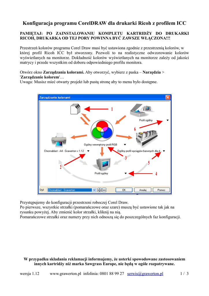 Konfiguracja programu CorelDRAW dla drukarki Ricoh z profilem ICC PAMIĘTAJ: PO ZAINSTALOWANIU KOMPLETU KARTRIDŻY DO DRUKARKI RICOH, DRUKARKA OD TEJ PORY POWINNA BYĆ ZAWSZE WŁĄCZONA!!! Przestrzeń kolorów programu Corel Draw musi być ustawiona zgodnie z przestrzenią kolorów, w której profil Ricoh ICC był stworzony. Pozwoli to na realistyczne odwzorowanie kolorów wyświetlanych na monitorze. Dokładność kolorów wyświetlanych na monitorze zależy od jakości matrycy i przede wszystkim od doboru odpowiedniego profilu monitora. Otwórz okno Zarządzania kolorami. Aby otworzyć, wybierz z paska – Narzędzia > 'Zarządzanie kolorem'… Uwaga: Musisz mieć otwarty projekt lub pustą stronę aby to menu było dostępne. 1 6 3 2 5 4 Przystępujemy do konfiguracji przestrzeni roboczej Corel Draw. Po pierwsze, wszystkie strzałki (pomarańczowe oraz szare) muszą być ustawione tak jak na rysunku powyżej. Aby zmienić kolor strzałki, kliknij na nią. Pomarańczowe strzałki oraz numery przy nich odnoszą się do poszczególnych faz konfiguracji. W przypadku składania reklamacji informujemy, że usterki spowodowane zastosowaniem innych kartridży niż marka Sawgrass Europe, nie będą w ogóle rozpatrywane. wersja 1.12 www.grawerton.pl infolinia: 0801 88 99 27 [email protected] 1/ 3 1. Import-Eksport: kliknij rysunek papieru aby otworzyć okno Zaawansowane ustawienia importu/eksport. Ta opcja pokazuje jakie ustawienia Corel Draw będzie stosował podczas importowania i eksportowania plików. 1.W sekcji Import wybierz Zawsze konwertuj używając,a następnie wybierz Internal RGB – Fraser (1998) z rozwijanego menu. 2.W sekcji Eksportuj wybierz Zawsze konwertuj używając, a następnie wybierz Internal RGB – Fraser (1998) z rozwijanego menu. 2. Pod drukarką wybierz Chromablast A4 - Grawerton v 1.12 Uwaga: Jeśli nie znalazłeś tej nazwy profilu wybierz opcję” Pobierz profil z dysku” a następnie wskaż ścieżkę folderów( jak poniżej) w zależności od rodzaju systemu operacyjnego na Twoim komputerze. Win 95,98,98se,ME----- do ----C:/Windows/System/Color Win NT4----do---- C:/winnt/system32/color Win 2000---do----C:/winnt/system32/spool/drivers/color Win XP, Vista ----do----C:/windows/system32/spool/drivers/color 3. Wybierz: Ogólny wewnętrzny profil RGB. 4. Monitor: wybierz profil ogólny 5. Scanner: wybierz profil ogólny. 6. Separations Printer: nie wymaga ustawienia w przypadku tego typu druku. W przypadku składania reklamacji informujemy, że usterki spowodowane zastosowaniem innych kartridży niż marka Sawgrass Europe, nie będą w ogóle rozpatrywane. wersja 1.12 www.grawerton.pl infolinia: 0801 88 99 27 [email protected] 2/ 3 Przestrzeń kolorów CorelDraw oraz profilu ICC zostały tak ustawione, aby wykorzystywały identyczne przestrzenie kolorów, w jakich profil został wygenerowany. Możesz teraz normalnie pracować z twoją grafiką. Drukowanie przy użyciu profilu Ricoh ICC w CorelDraw Kiedy Twój projekt jest gotowy do druku, otwórz okno drukowania Plik > Drukuj Wybierz Ustawienia drukarskie (punkt 1) i zaznacz Odbicie lustrzane (punkt 2), aby twój obraz powrócił do wyjściowego ułożenia po nadruku na produkt końcowy. Teraz możesz drukować. W przypadku składania reklamacji informujemy, że usterki spowodowane zastosowaniem innych kartridży niż marka Sawgrass Europe, nie będą w ogóle rozpatrywane. wersja 1.12 www.grawerton.pl infolinia: 0801 88 99 27 [email protected] 3/ 3