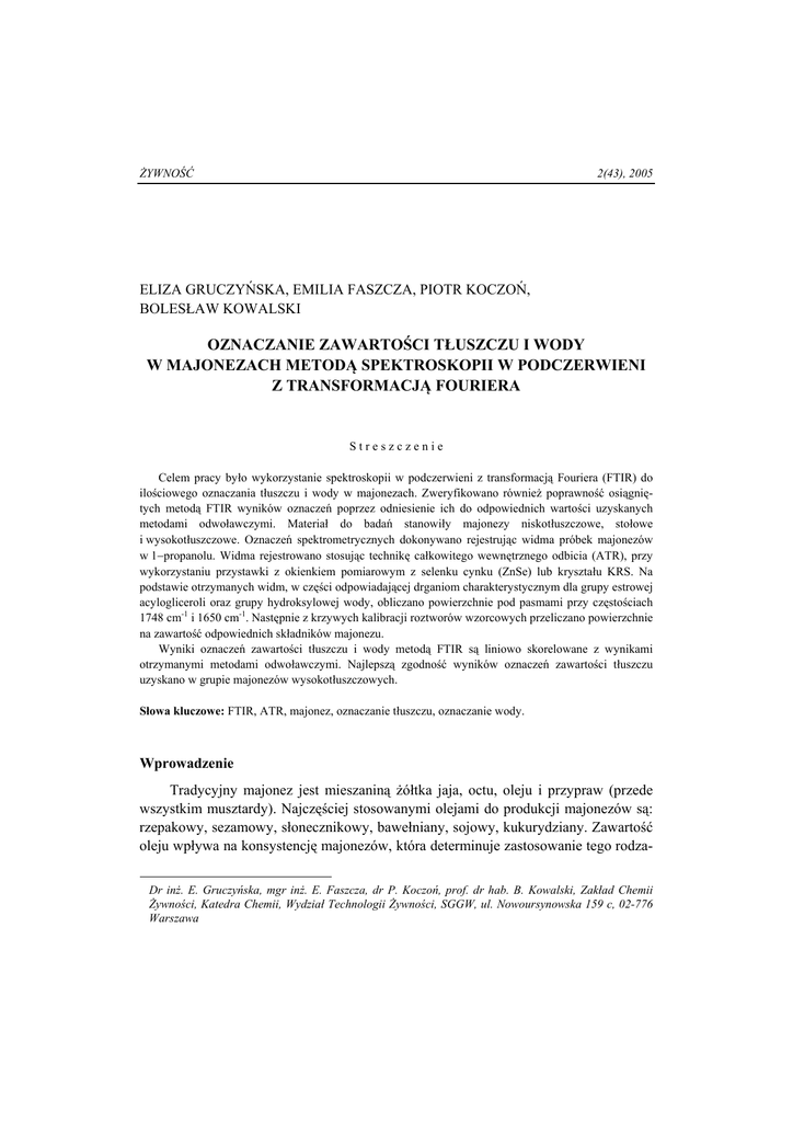 ŻYWNOŚĆ 2(43), 2005 ELIZA GRUCZYŃSKA, EMILIA FASZCZA, PIOTR KOCZOŃ, BOLESŁAW KOWALSKI OZNACZANIE ZAWARTOŚCI TŁUSZCZU I WODY W MAJONEZACH METODĄ SPEKTROSKOPII W PODCZERWIENI Z TRANSFORMACJĄ FOURIERA Streszczenie Celem pracy było wykorzystanie spektroskopii w podczerwieni z transformacją Fouriera (FTIR) do ilościowego oznaczania tłuszczu i wody w majonezach. Zweryfikowano również poprawność osiągniętych metodą FTIR wyników oznaczeń poprzez odniesienie ich do odpowiednich wartości uzyskanych metodami odwoławczymi. Materiał do badań stanowiły majonezy niskotłuszczowe, stołowe i wysokotłuszczowe. Oznaczeń spektrometrycznych dokonywano rejestrując widma próbek majonezów w 1propanolu. Widma rejestrowano stosując technikę całkowitego wewnętrznego odbicia (ATR), przy wykorzystaniu przystawki z okienkiem pomiarowym z selenku cynku (ZnSe) lub kryształu KRS. Na podstawie otrzymanych widm, w części odpowiadającej drganiom charakterystycznym dla grupy estrowej acylogliceroli oraz grupy hydroksylowej wody, obliczano powierzchnie pod pasmami przy częstościach 1748 cm-1 i 1650 cm-1. Następnie z krzywych kalibracji roztworów wzorcowych przeliczano powierzchnie na zawartość odpowiednich składników majonezu. Wyniki oznaczeń zawartości tłuszczu i wody metodą FTIR są liniowo skorelowane z wynikami otrzymanymi metodami odwoławczymi. Najlepszą zgodność wyników oznaczeń zawartości tłuszczu uzyskano w grupie majonezów wysokotłuszczowych. Słowa kluczowe: FTIR, ATR, majonez, oznaczanie tłuszczu, oznaczanie wody. Wprowadzenie Tradycyjny majonez jest mieszaniną żółtka jaja, octu, oleju i przypraw (przede wszystkim musztardy). Najczęściej stosowanymi olejami do produkcji majonezów są: rzepakowy, sezamowy, słonecznikowy, bawełniany, sojowy, kukurydziany. Zawartość oleju wpływa na konsystencję majonezów, która determinuje zastosowanie tego rodzaDr inż. E. Gruczyńska, mgr inż. E. Faszcza, dr P. Koczoń, prof. dr hab. B. Kowalski, Zakład Chemii Żywności, Katedra Chemii, Wydział Technologii Żywności, SGGW, ul. Nowoursynowska 159 c, 02-776 Warszawa 96 Eliza Gruczyńska, Emilia Faszcza, Piotr Koczoń, Bolesław Kowalski ju wyrobów spożywczych. Majonezy do sałat mają konsystencję płynną, natomiast przeznaczone do dekoracji potraw powinny być półstałe [9, 11]. Typowy majonez zawiera 70–80% tłuszczu i mimo wysokiej zawartości tłuszczu w stosunku do wody, jest on emulsją typu olej w wodzie. Majonez, sklasyfikowany jako trwała emulsja, zostaje wytworzony, gdy przyłożona siła ścinania powoduje rozproszenie fazy olejowej w postaci kropelek w fazie wodnej. Amfifilowy charakter emulgatora (np. lecytyny z żółtka jaja) sprzyja utrzymaniu pożądanej stabilności emulsji. Właściwa jakość majonezów jest warunkowana odpowiednią obróbką składników fazy wodnej i tłuszczowej w warunkach specyficznych procesów ścinania [3]. Stale rosnące wymagania konsumentów i zalecenia dietetyków sprawiają, że na rynku dostępna jest szeroka gama majonezów, zróżnicowanych pod względem zawartości tłuszczu. Zastosowanie szybkiej, niezawodnej metody ilościowego oznaczania zawartości tłuszczu i wody w tego typu produktach jest kluczowe w kontroli jakości. Występują bowiem znaczne trudności w oznaczeniach tłuszczu i wody w stabilnych emulsjach spożywczych, utworzonych dzięki właściwej kombinacji sił ścinania w połączeniu z efektem działania emulgatora [2]. Badania wykonywane przez zespół z Uniwersytetu McGill w Kanadzie [13, 14] dowodzą, że metoda spektroskopii w podczerwieni z zastosowaniem transformacji Fouriera jest alternatywą dla wielu chemicznych metod analizy żywności. Zawartość tłuszczu i wody w majonezach może być monitorowana za pomocą spektrometrii FTIR/ATR [7]. Celem takich badań jest przede wszystkim wykluczenie niekorzystnych zmian w produkcie, jak np. rozpad emulsji, ale także umożliwienie producentowi szybkiej ingerencji w proces produkcji w trakcie jego przebiegu [13]. Metoda FTIR/ATR umożliwia posługiwanie się próbkami produktów żywnościowych mającymi postać ciał stałych, cieczy czy past, dając przy tym powtarzalne wyniki [8]. Do wykonania dokładnego oznaczenia zaleca się dobór odpowiedniego rozpuszczalnika, w którym rozpuszczeniu ulegają triacyloglicerole oraz woda [7]. To założenie spełnia 1–propanol, który stosowany jest przy oznaczeniach w majonezach, maśle orzechowym, itp. Dokonywane są pomiary absorpcji promieniowania IR przez wiązania estrowe przy częstości 1748 cm-1 oraz wiązania H–OH przy 1650 cm-1, po tym jak odjęte zostanie pasmo pochodzące od rozpuszczalnika. Na podstawie krzywych kalibracji odczytuje się dane ilościowe dotyczące tłuszczu i wody w emulsji. Kalibracja polega na określeniu absorbancji mieszanin o znanej zawartości tłuszczu i wody na podstawie wysokości lub powierzchni pasm, przy charakterystycznych częstościach. Mieszaniny takie są sporządzane z czystych składników, zmieszanych w różnych proporcjach w 1-propanolu bądź poprzez dodanie do rozpuszczalnika znanej ilości produktu o wcześniej sprawdzonej (metodami odwoławczymi) zawartości oznaczanych składników. Analiza próbki masła, margaryny czy majonezu trwa 5–7 min, przy czym rzeczywisty czas pracy aparatu to zaledwie 30 s [16]. Ze względu na OZNACZANIE ZAWARTOŚCI TŁUSZCZU I WODY W MAJONEZACH METODĄ SPEKTROSKOPII... 97 prostą procedurę przygotowywania mieszanin standardowych metoda FTIR/ATR odnosi się do kontrolowania zawartości tłuszczu i wody także w emulsjach typu w/o [13]. W technikach spektroskopowych, mimo że ciągle jeszcze mało powszechnych w kontroli jakości tłuszczów, tkwi niewątpliwie duży potencjał, czyniący z nich funkcjonalne, wygodne narzędzia w badaniach lipidów [17]. Spektroskopia w podczerwieni może być stosowana zarówno do określania właściwości chemicznych tłuszczów (liczby: jodowa, zmydla