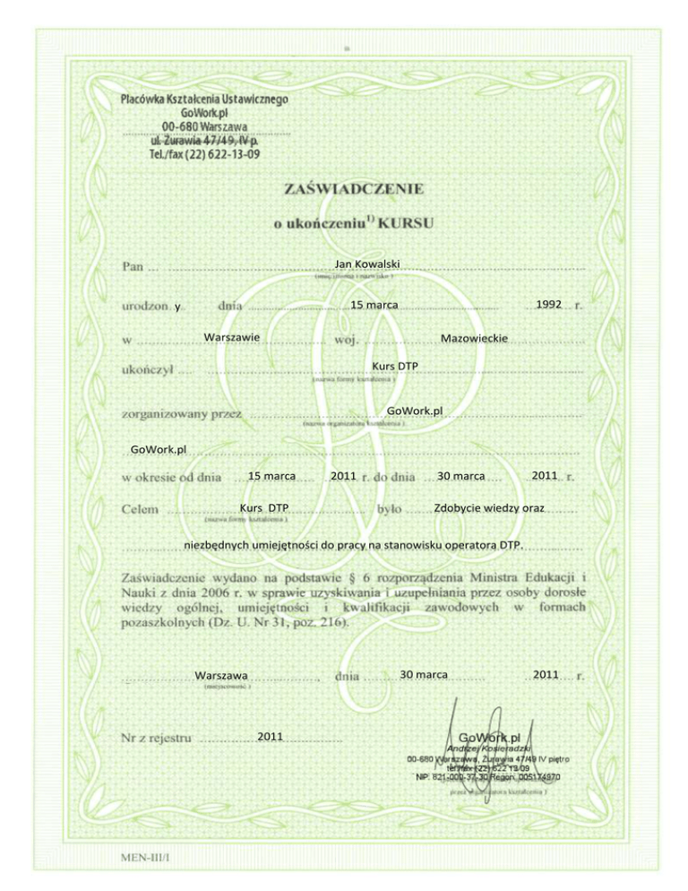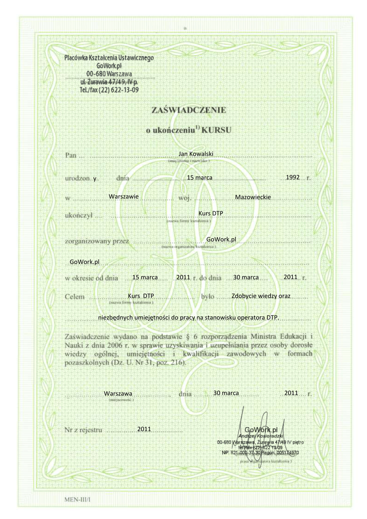 Jan Kowalski 1992 15 marca y Warszawie Mazowieckie Kurs DTP K GoWork.pl K GoWork.pl 15 marca 30 marca 2011 K 2011 K wiedzy oraz Zdobycie K Kurs DTP K K niezbędnych umiejętności do pracy na stanowisku operatora DTP. K 30 marca Warszawa K 2011 2011 Lp. 1 2 3 Nazwa zajęć edukacyjnych Czym jest DTP? Grafika wektorowa Grafika rastrowa Oprogramowanie wykorzystywane do DTP Projektowanie materiałów reklamowych Teoria procesów DTP Zasady tworzenia reklamy i identyfikacji Wizerunku zleceniodawcy Kompozycja materiałów reklamowych Zasady doboru barw Podstawowe zasady projektowania i składu tekstu Kroje pisma, zasady doboru czcionek Zasady dobrego łamania tekstu Topografia książki Korekta i znaki korektorskie InDesign Przygotowywanie dokumentu InDesign Ekran InDesign Praca z tekstem Praca z grafiką Arkusze stylów Praca z kolorem Skład publikacji Drukowanie i przygotowanie do naświetlania QuarkXPress Do czego służy Zapoznanie z interfejsem programu Omówienie preferencji podstawowych Tworzenie nowego dokumentu Wprowadzanie tekstu Edycja obiektów Tabulatory Tabele Obrazy Linie Obiekty graficzne Beziera Posługiwanie się arkuszami stylów Kolory Znajdź i zamień Książki Wymiar godzin Zajęć edukacyjnych 10 20 20