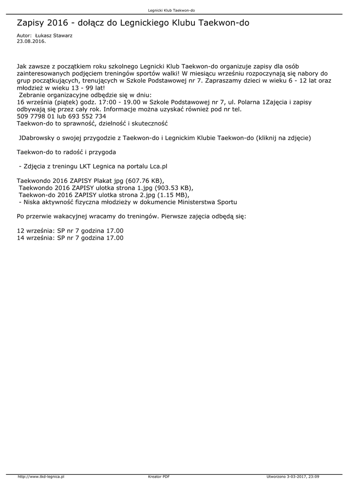 Legnicki Klub Taekwon-do Zapisy 2016 - dołącz do Legnickiego Klubu Taekwon-do Autor: Łukasz Stawarz 23.08.2016. Jak zawsze z początkiem roku szkolnego Legnicki Klub Taekwon-do organizuje zapisy dla osób zainteresowanych podjęciem treningów sportów walki! W miesiącu wrześniu rozpoczynają się nabory do grup początkujących, trenujących w Szkole Podstawowej nr 7. Zapraszamy dzieci w wieku 6 - 12 lat oraz młodzież w wieku 13 - 99 lat! Zebranie organizacyjne odbędzie się w dniu: 16 września (piątek) godz. 17:00 - 19.00 w Szkole Podstawowej nr 7, ul. Polarna 1Zajęcia i zapisy odbywają się przez cały rok. Informacje można uzyskać również pod nr tel. 509 7798 01 lub 693 552 734 Taekwon-do to sprawność, dzielność i skuteczność JDabrowsky o swojej przygodzie z Taekwon-do i Legnickim Klubie Taekwon-do (kliknij na zdjęcie) Taekwon-do to radość i przygoda - Zdjęcia z treningu LKT Legnica na portalu Lca.pl Taekwondo 2016 ZAPISY Plakat jpg (607.76 KB), Taekwondo 2016 ZAPISY ulotka strona 1.jpg (903.53 KB), Taekwon-do 2016 ZAPISY ulotka strona 2.jpg (1.15 MB), - Niska aktywność fizyczna młodzieży w dokumencie Ministerstwa Sportu Po przerwie wakacyjnej wracamy do treningów. Pierwsze zajęcia odbędą się: 12 września: SP nr 7 godzina 17.00 14 września: SP nr 7 godzina 17.00 http://www.tkd-legnica.pl Kreator PDF Utworzono 3-03-2017, 23:09