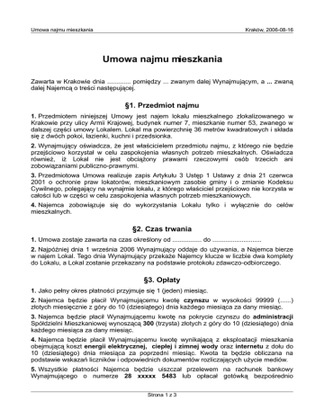 Umowa najmu mieszkania Kraków, 2006-08-16 Umowa najmu mieszkania Zawarta w Krakowie dnia ............. pomiędzy ... zwanym dalej Wynajmującym, a ... zwaną dalej Najemcą o treści następującej. §1. Przedmiot najmu 1. Przedmiotem niniejszej Umowy jest najem lokalu mieszkalnego zlokalizowanego w Krakowie przy ulicy Armii Krajowej, budynek numer 7, mieszkanie numer 53, zwanego w dalszej części umowy Lokalem. Lokal ma powierzchnię 36 metrów kwadratowych i składa się z dwóch pokoi, łazienki, kuchni i przedsionka. 2. Wynajmujący oświadcza, że jest właścicielem przedmiotu najmu, z którego nie będzie przejściowo korzystał w celu zaspokojenia własnych potrzeb mieszkalnych. Oświadcza również, iż Lokal nie jest obciążony prawami rzeczowymi osób trzecich ani zobowiązaniami publiczno-prawnymi. 3. Przedmiotowa Umowa realizuje zapis Artykułu 3 Ustęp 1 Ustawy z dnia 21 czerwca 2001 o ochronie praw lokatorów, mieszkaniowym zasobie gminy i o zmianie Kodeksu Cywilnego, polegający na wynajmie lokalu, z którego właściciel przejściowo nie korzysta w całości lub w części w celu zaspokojenia własnych potrzeb mieszkaniowych. 4. Najemca zobowiązuje się do wykorzystania Lokalu tylko i wyłącznie do celów mieszkalnych. §2. Czas trwania 1. Umowa zostaje zawarta na czas określony od ................ do ........................... 2. Najpóźniej dnia 1 września 2006 Wynajmujący oddaje do używania, a Najemca bierze w najem Lokal. Tego dnia Wynajmujący przekaże Najemcy klucze w liczbie dwa komplety do Lokalu, a Lokal zostanie przekazany na podstawie protokołu zdawczo-odbiorczego. §3. Opłaty 1. Jako pełny okres płatności przyjmuje się 1 (jeden) miesiąc. 2. Najemca będzie płacił Wynajmującemu kwotę czynszu w wysokości 99999 (......) złotych miesięcznie z góry do 10 (dziesiątego) dnia każdego miesiąca za dany miesiąc. 3. Najemca będzie płacił Wynajmującemu kwotę na pokrycie czynszu do administracji Spółdzielni Mieszkaniowej wynoszącą 300 (trzysta) złotych z góry do 10 (dziesiątego) dnia każdego miesiąca za dany miesiąc. 4. Najemca będzie płacił Wynajmującemu kwotę wynikającą z eksploatacji mieszkania obejmującą koszt energii elektrycznej, ciepłej i zimnej wody oraz internetu z dołu do 10 (dziesiątego) dnia miesiąca za poprzedni miesiąc. Kwota ta będzie obliczana na podstawie wskazań liczników i odpowiednich dokumentów rozliczających użycie mediów. 5. Wszystkie płatności Najemca będzie uiszczał przelewem na rachunek bankowy Wynajmującego o numerze 28 xxxxx 5483 lub opłacał gotówką bezpośrednio Strona 1 z 3 Umowa najmu mieszkania Kraków, 2006-08-16 Wynajmującemu lub osobie trzeciej mającej pisemne pełnomocnictwo Wynajmującego. 6. W przypadku zwłoki w płatności czynszu najmu, czynszu do administracji lub opłat eksploatacyjnych Najemca jest obowiązany do zapłaty odsetek za zwłokę w ustawowej wysokości. 7. Wynajmujący pobiera kaucję w kwocie 999999 (.......) złotych na zabezpieczenie ewentualnych zaległości w płatnościach oraz kosztów napraw, które w świetle niniejszej umowy obciążają Najemcę. Kaucja podlega zwrotowi w ciągu miesiąca od dnia opróżnienia Lokalu. Cała kwota kaucji musi być zapłacona najpóźniej do dnia przekazania lokalu Najemcy. §4. Warunki korzystania 1. Najemca jest obowiązany utrzymywać lokal oraz pomieszczenia do używania których jest uprawniony, we właściwym stanie technicznym, higienicznym i sanitarnym określonym odrębnymi przepisami oraz przestrzegać porządku domowego. Najemca jest także obowiązany dbać i chronić przed uszkodzeniem lub dewastacją części budynku przeznaczone do wspólnego użytku. 2. Najemca zobowiązuje się do przeprowadzenia bieżących konserwacji i remontów oraz napraw wszelkich szkód powstałych z jego winy lub zaniedbania na własny koszt. 3. Najemca może wprowadzić w lokalu ulepszenia tylko za zgodą Wynajmującego i na podstawie pisemnej umowy określającej sposób rozliczeń z tego tytułu. Wszelkie zmiany w wyglądzie mieszkania jak również zmiany budowlane wewnątrz mieszkania muszą być uprzednio konsultowane z Wynajmującym, który może się na nie zgodzić, wydając stosowne pozwolenie na piśmie. Bez pisemnej zgody Najemcy nie wolno niczego zmieniać w wyglądzie mieszkania. 4. W razie awarii wywołującej szkodę lub zagrażającej bezpośrednio powstaniem szkody Najemca jest obowiązany niezwłocznie udostępnić Lokal w celu jej usunięcia. Jeżeli Najemca jest nieobecny lub odmawia udostępnienia Lokalu, Wynajmujący ma prawo wejść do Lokalu. 5. Najemca zobowiązuje się udostępnić Wynajmującemu lokal w celu dokonania okresowego, a w uzasadnionych wypadkach również doraźnego, przeglądu stanu i wyposażenia technicznego lokalu po uprzednim ustaleniu terminu spotkania przez strony. 6. Najemca nie ponosi odpowiedzialności za zmiany i zniszczenia w lokalu powstałe na skutek naturalnego zużycia. 7. Wynajmujący nie ponosi odpowiedzialności za mienie Najemcy pozostawione w Lokalu. 8. W Lokalu nie można przetrzymywać zwierząt. §5. Zakończenie, wypowiedzenie 1. Nie później niż na miesiąc naprzód, na koniec miesiąca kalendarzowego, Wynajmujący może wypowiedzieć stosunek prawny, jeżeli Najemca: a) wykorzystuje Lokal w sposób sprzeczny z Umową lub niezgodnie z jego przeznaczeniem lub zaniedbuje obowiązki, dopuszczając do powstania szkód b) niszczy urządzenia przeznaczone do wspólnego korzystania przez mieszkańców albo wykracza w sposób rażący lub uporczywy przeciwko porządkowi domowemu, czyniąc uciążliwym korzystanie z innych lokali i mimo pisemnego upomnienia nie Strona 2 z 3 Umowa najmu mieszkania Kraków, 2006-08-16 zaniechał tych działań c) jest w zwłoce z zapłatą czynszu lub innych opłat za używanie Lokalu co najmniej za trzy pełne okresy płatności pomimo uprzedzenia go na piśmie o zamiarze wypowiedzenia stosunku prawnego i wyznaczenia 