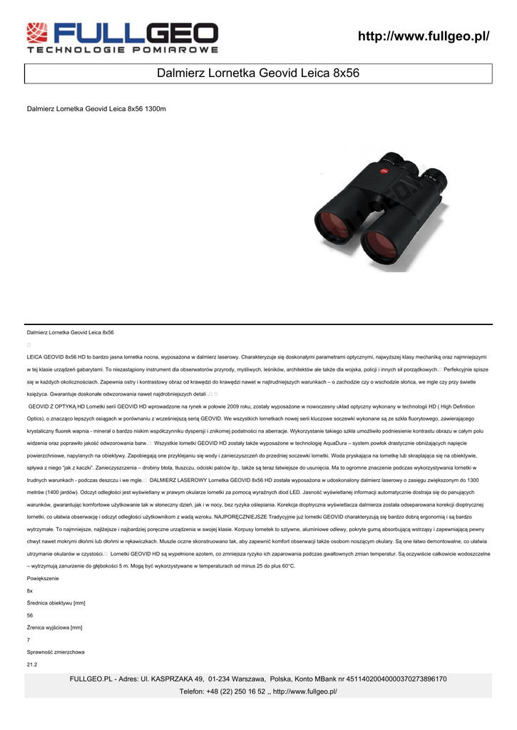 http://www.fullgeo.pl/ Dalmierz Lornetka Geovid Leica 8x56 Dalmierz Lornetka Geovid Leica 8x56 1300m Dalmierz Lornetka Geovid Leica 8x56 LEICA GEOVID 8x56 HD to bardzo jasna lornetka nocna, wyposażona w dalmierz laserowy. Charakteryzuje się doskonałymi parametrami optycznymi, najwyższej klasy mechaniką oraz najmniejszymi w tej klasie urządzeń gabarytami. To niezastąpiony instrument dla obserwatorów przyrody, myśliwych, leśników, architektów ale także dla wojska, policji i innych sił porządkowych. Perfekcyjnie spisze się w każdych okolicznościach. Zapewnia ostry i kontrastowy obraz od krawędzi do krawędzi nawet w najtrudniejszych warunkach – o zachodzie czy o wschodzie słońca, we mgle czy przy świetle księżyca. Gwarantuje doskonałe odwzorowania nawet najdrobniejszych detali . GEOVID Z OPTYKĄ HD Lornetki serii GEOVID HD wprowadzone na rynek w połowie 2009 roku, zostały wyposażone w nowoczesny układ optyczny wykonany w technologii HD ( High Definition Optics), o znacząco lepszych osiągach w porównaniu z wcześniejszą serią GEOVID. We wszystkich lornetkach nowej serii kluczowe soczewki wykonane są ze szkła fluorytowego, zawierającego krystaliczny fluorek wapnia - minerał o bardzo niskim współczynniku dyspersji i znikomej podatności na aberracje. Wykorzystanie takiego szkła umożliwiło podniesienie kontrastu obrazu w całym polu widzenia oraz poprawiło jakość odwzorowania barw. Wszystkie lornetki GEOVID HD zostały także wyposażone w technologię AquaDura – system powłok drastycznie obniżających napięcie powierzchniowe, napylanych na obiektywy. Zapobiegają one przyklejaniu się wody i zanieczyszczeń do przedniej soczewki lornetki. Woda pryskająca na lornetkę lub skraplająca się na obiektywie, spływa z niego “jak z kaczki”. Zanieczyszczenia – drobiny błota, tłuszczu, odciski palców itp., także są teraz łatwiejsze do usunięcia. Ma to ogromne znaczenie podczas wykorzystywania lornetki w trudnych warunkach - podczas deszczu i we mgle. DALMIERZ LASEROWY Lornetka GEOVID 8x56 HD została wyposażona w udoskonalony dalmierz laserowy o zasięgu zwiększonym do 1300 metrów (1400 jardów). Odczyt odległości jest wyświetlany w prawym okularze lornetki za pomocą wyraźnych diod LED. Jasność wyświetlanej informacji automatycznie dostraja się do panujących warunków, gwarantując komfortowe użytkowanie tak w słoneczny dzień, jak i w nocy, bez ryzyka oślepiania. Korekcja dioptryczna wyświetlacza dalmierza została odseparowana korekcji dioptrycznej lornetki, co ułatwia obserwację i odczyt odległości użytkownikom z wadą wzroku. NAJPORĘCZNIEJSZE Tradycyjnie już lornetki GEOVID charakteryzują się bardzo dobrą ergonomią i są bardzo wytrzymałe. To najmniejsze, najlżejsze i najbardziej poręczne urządzenia w swojej klasie. Korpusy lornetek to sztywne, aluminiowe odlewy, pokryte gumą absorbującą wstrząsy i zapewniającą pewny chwyt nawet mokrymi dłońmi lub dłońmi w rękawiczkach. Muszle oczne skonstruowano tak, aby zapewnić komfort obserwacji także osobom noszącym okulary. Są one łatwo demontowalne, co ułatwia utrzymanie okularów w czystości. Lornetki GEOVID HD są wypełnione azotem, co zmniejsza ryzyko ich zaparowania podczas gwałtownych zmian temperatur. Są oczywiście całkowicie wodoszczelne – wytrzymują zanurzenie do głębokości 5 m. Mogą być wykorzystywane w temperaturach od minus 25 do plus 60°C. Powiększenie 8x Średnica obiektywu [mm] 56 Żrenica wyjściowa [mm] 7 Sprawność zmierzchowa 21.2 FULLGEO.PL - Adres: Ul. KASPRZAKA 49, 01-234 Warszawa, Polska, Konto MBank nr 45114020040000370273896170 Telefon: +48 (22) 250 16 52 ,, http://www.fullgeo.pl/ Pole widzenia na dystansie 1000m http://www.fullgeo.pl/ 118 / 1000 m Odstęp źrenicy [mm] 18.5 Regulacja rozstawu źrenic [mm] 56-74 Kąt widzenia [°] 6.8 Minimalna odległość ogniskowania [m] 5.6 Korekcja dioptryczna +/- 3.5 dioptrii Efektywny zasięg dalmierza [m] 10-1300 Dokładność dalmierza w zależności od odległości: +/- 1 m na dystansie do 350m +/- 2 m na dystansie do 700m +/- 0.5% na dystansie od 700m Odczyt pomiaru 4-znakowy wyświetlacz LED z automatyczną regulacją jasności Czas pomiaru do 1.4 s Laser bezpieczny dla oka, na światło niewidzialne, spełniający normy EN i FDA class 1 Muszle oczne Tak Muszle oczne (uwagi) z trzystopniową regulacją, zdejmowane Wewnętrzne ogniskowanie z centralnym mechanizmem ogniskującym Tak Konstrukcja optyczna 7 elementów optycznych Konstrukcja optyczna (uwagi) z powłokami przeciwodblaskowymi z technologią Leica HDC / Leica AquaDura Pryzmat dachowy z powłoką P40 z korekcją fazową Korpus odlew z aluminium wypełniony azotem, wykończony elastyczną powłoką gumową w kolorze czarnym Wodoszczelność do głębokości 5m Zasilanie bateria litowa CR2 (3V) Wydajność baterii ok. 2000 pomiarów(w temperaturze 20°C) Wymiary (długość x wysokość x szerokość) [mm] 135 x 182 x 68 Waga [g] 1100 W zestawie FULLGEO.PL - Adres: Ul. KASPRZAKA 49, 01-234 Warszawa, Polska, Konto MBank nr 45114020040000370273896170 Telefon: +48 (22) 250 16 52 ,, http://www.fullgeo.pl/ neoprenowy pasek, futerał z Cordury, osłona okularów i obiektywów Gwarancja http://www.fullgeo.pl/ 2 lata Zestaw zawiera Dalmierz - lornetka osłona okularów i obiektywów futerał Cordura neoprenowy pasek na rekę bateria zasilająca dalmierz gwarancja Leica Camera okres trwania gwarancji - 2 lat FULLGEO.PL - Adres: Ul. KASPRZAKA 49, 01-234 Warszawa, Polska, Konto MBank nr 45114020040000370273896170 Telefon: +48 (22) 250 16 52 ,, http://www.fullgeo.pl/ http://www.fullgeo.pl/ FULLGEO.PL - Adres: Ul. KASPRZAKA 49, 01-234 Warszawa, Polska, Konto MBank nr 45114020040000370273896170 Telefon: +48 (22) 250 16 52 ,, http://www.fullgeo.pl/