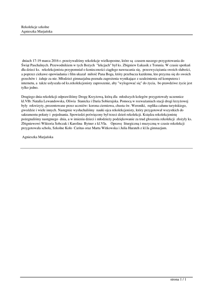 Rekolekcje szkolne Agnieszka Marjańska dniach 17-19 marca 2016 r. przeżywaliśmy rekolekcje wielkopostne, które są czasem naszego przygotowania do Świąt Paschalnych. Przewodnikiem w tych Bożych "lekcjach" był ks. Zbigniew Łukasik z Torunia. W czasie spotkań dla dzieci ks. rekolekcjonista przypomniał o konieczności ciągłego nawracania się, przezwyciężania swoich słabości, a poprzez ciekawe opowiadania i film ukazał miłość Pana Boga, który przebacza każdemu, kto przyzna się do swoich grzechów i żałuje za nie. Młodzież gimnazjalna poznała zagrożenia wynikające z uzależnienia od komputera i internetu, a także usłyszała od ks.rekolekcjonisty zaproszenie, aby "wylogować się" do życia, bo prawdziwe życie jest tylko jedno. Drugiego dnia rekolekcji odprawiliśmy Drogę Krzyżową, którą dla młodszych kolegów przygotowały uczennice kl.VIb: Natalia Lewandowska, Oliwia Stanicka i Daria Sobierajska. Pomocą w rozważaniach stacji drogi krzyżowej były rekwizyty, prezentowane przez uczniów: korona cierniowa, chusta św. Weroniki, replika całunu turyńskiego, gwoździe i wiele innych. Następnie wysłuchaliśmy nauki ojca rekolekcjonisty, który przygotował wszystkich do sakramentu pokuty i pojednania. Spowiedzi poświęcony był trzeci dzień rekolekcji. Księdza rekolekcjonistę pożegnaliśmy następnego dnia, a w imieniu dzieci i młodzieży podziękowanie za trud głoszenia rekolekcji złożyły ks. Zbigniewowi Wiktoria Sobczak i Karolina Bytner z kl.VIa. Oprawę liturgiczną i muzyczną w czasie rekolekcji przygotowała schola, Szkolne Koło Caritas oraz Marta Witkowska i Julia Harateh z kl.Ia gimnazjum. Agnieszka Marjańska strona 1 / 1