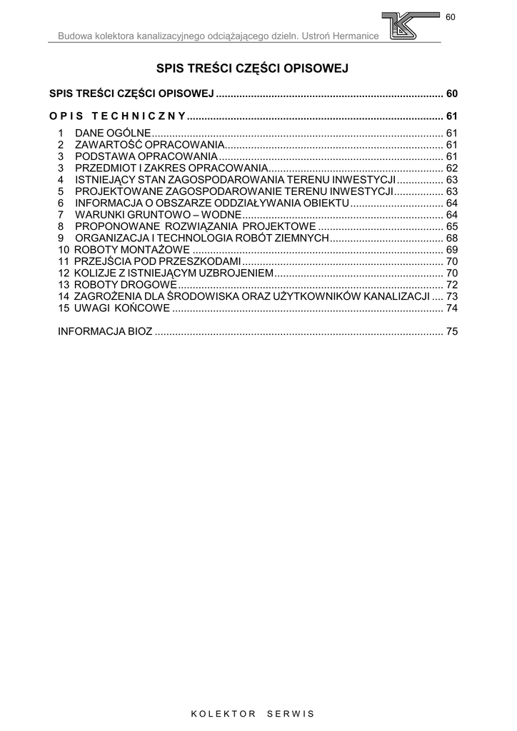 60 Budowa kolektora kanalizacyjnego odciąŜającego dzieln. Ustroń Hermanice SPIS TREŚCI CZĘŚCI OPISOWEJ SPIS TREŚCI CZĘŚCI OPISOWEJ .............................................................................. 60 O P I S T E C H N I C Z N Y ........................................................................................ 61 1 2 3 3 4 5 6 7 8 9 10 11 12 13 14 15 DANE OGÓLNE .................................................................................................... 61 ZAWARTOŚĆ OPRACOWANIA........................................................................... 61 PODSTAWA OPRACOWANIA ............................................................................. 61 PRZEDMIOT I ZAKRES OPRACOWANIA............................................................ 62 ISTNIEJĄCY STAN ZAGOSPODAROWANIA TERENU INWESTYCJI ................ 63 PROJEKTOWANE ZAGOSPODAROWANIE TERENU INWESTYCJI ................. 63 INFORMACJA O OBSZARZE ODDZIAŁYWANIA OBIEKTU ................................ 64 WARUNKI GRUNTOWO – WODNE ..................................................................... 64 PROPONOWANE ROZWIĄZANIA PROJEKTOWE ........................................... 65 ORGANIZACJA I TECHNOLOGIA ROBÓT ZIEMNYCH ....................................... 68 ROBOTY MONTAśOWE ...................................................................................... 69 PRZEJŚCIA POD PRZESZKODAMI ..................................................................... 70 KOLIZJE Z ISTNIEJĄCYM UZBROJENIEM .......................................................... 70 ROBOTY DROGOWE ........................................................................................... 72 ZAGROśENIA DLA ŚRODOWISKA ORAZ UśYTKOWNIKÓW KANALIZACJI .... 73 UWAGI KOŃCOWE ............................................................................................. 74 INFORMACJA BIOZ ................................................................................................... 75 KOLEKTOR SERWIS 61 Budowa kolektora kanalizacyjnego odciąŜającego dzieln. Ustroń Hermanice OPIS TECHNICZNY 1 DANE OGÓLNE • • Inwestor Zadanie inwestycyjne • • Faza opracowania Temat opracowania – Miasto Ustroń, ul. Rynek 1, 43 – 450 Ustroń – Budowa kolektora kanalizacyjnego odciąŜającego dzielnicę Ustroń Hermanice wraz z kanalizacją rozdzielczą i przyłączami do budynków mieszkalnych obejmującego tereny mieszkaniowe w rejonie ulic Skoczowskiej, Sztwiertni, Laskowej i Granicznej w Ustroniu – Projekt budowlany, – Budowa kolektora kanalizacyjnego odciąŜającego dzielnicę Ustroń Hermanice . 2 ZAWARTOŚĆ OPRACOWANIA Niniejsze opracowanie jest projektem budowlanym w myśl Ustawy z dnia 7 lipca 1994 r. Prawo Budowlane (Dz.U.2013.1409 z późn. zmianami) i spełnia wymogi dla tego rodzaju opracowań ujęte w Rozporządzenie Ministra Transportu, Budownictwa I Gospodarki Morskiej z dnia 25 kwietnia 2012 r. w sprawie szczegółowego zakresu i formy projektu budowlanego (Dz.U.2012.462). Niniejszy projekt budowlany zawiera : − Część formalną w skład której wchodzi : a) zestawienie działek objętych opracowaniem (ujęte na pierwszej stronie), b) oświadczenia i dokumenty projektanta i sprawdzającego, c) decyzje, opinie i uzgodnienia branŜowe, − Część projektową w skład którego wchodzi : a) opis techniczny, b) informacja dotycząca BIOZ, c) projekt zagospodarowania terenu, d) część rysunkowa - pozostała, 3 • • • • • • • • PODSTAWA OPRACOWANIA Umowa z Zamawiającym, Decyzja o środowiskowych uwarunkowaniach zgody na realizację przedsięwzięcia nr SR.6220.00034.2012 wydana przez Burmistrza Miasta Ustroń, Decyzja nr L-7/2015 o ustaleniu lokalizacji inwestycji celu publicznego wydana przez Burmistrza Miasta Ustroń, Zaktualizowane mapy sytuacyjno - wysokościowe terenu opracowania w skali 1:500, „Dokumentacja badań podłoŜa gruntowego dotycząca warunków gruntowo – wodnych występujących w podłoŜu projektowanego kolektora kanalizacji sanitarnej, Warunki techniczne odprowadzenia ścieków wydane przez Wodociągi Ziemi Cieszyńskiej, Uzgodnienia z Inwestorem, Uzgodnienia z właścicielami terenów i wizje lokalne, KOLEKTOR SERWIS 62 Budowa kolektora kanalizacyjnego odciąŜającego dzieln. Ustroń Hermanice • • 3 Uzgodnienia branŜowe, Obowiązujące przepisy i normy, PRZEDMIOT I ZAKRES OPRACOWANIA Przedmiot niniejszego opracowania stanowi projekt budowlany budowy kolektora kanalizacji sanitarnej z rur PCW SN8 o średnicy Dn400mm w systemie grawitacyjnym, którego funkcją ma być odciąŜenie dzielnicy Ustroń Hermanice. Kolektor zaprojektowano od przejęcia ścieków z istniejącej sieci kanalizacji sanitarnej o średnicy Dn200mm, zlokalizowanej na terenie działki nr 227/30 poprzez studnię oznaczoną na PZT numerem SK68, następnie poprowadzono w pasie drogowym ulicy Skoczowskiej do wysokości posesji nr 146 (działka nr 73/4). Na wysokości ww. posesji kolektor poprowadzono po terenach działek prywatnych o numerach ewidencyjnych 73/4, 62/6, 62/19, następnie na odcinku od studni SK10 do SK11 kanał zaprojektowano w ulicy Krótkiej (działka nr 685/3) i dalej po terenie działki nr 49/12 będącej działką prywatną. Na skraju omawianej działki kolektor zaprojektowano w pasie drogowym drogi wojewódzkiej nr 941 (ul. Katowicka) i dokonano przejścia poprzecznego ww. drogi. Na terenie działki nr 17/12 projektuje się włączenie kanału Dn400mm do istniejącego systemu kanalizacyjnego poprzez studnię oznaczoną na PZT jako SK1. Zakres opracowania obejmuje projekt kolektora grawitacyjnego wraz z uzbrojeniem, studniami kanalizacyjnymi oraz odcinki sieci od kolektora do granic poszczególnych działek drogowych, występujących po trasie. Zakresem objęta jest takŜe budowa przyłączy kanalizacyjnych w celu odprowadzenia ścieków z posesji objętych przedmiotem zlecenia. Zakres projektu kolektora kanalizacyjnego w pasie drogowym drogi wojewódzki
