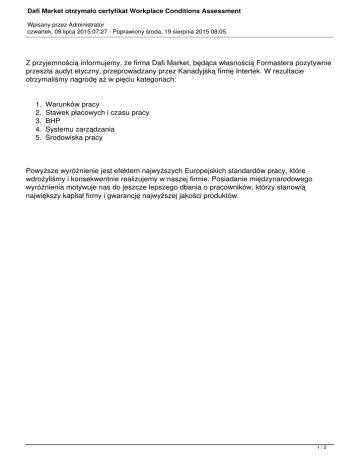 Dafi Market otrzymało certyfikat Workplace Conditions Assessment Wpisany przez Administrator czwartek, 09 lipca 2015 07:27 - Poprawiony środa, 19 sierpnia 2015 08:05 Z przyjemnością informujemy, że firma Dafi Market, będąca własnością Formastera pozytywnie przeszła audyt etyczny, przeprowadzany przez Kanadyjską firmę Intertek. W rezultacie otrzymaliśmy nagrodę aż w pięciu kategoriach: 1. 2. 3. 4. 5. Warunków pracy Stawek płacowych i czasu pracy BHP Systemu zarządzania Środowiska pracy Powyższe wyróżnienie jest efektem najwyższych Europejskich standardów pracy, które wdrożyliśmy i konsekwentnie realizujemy w naszej firmie. Posiadanie międzynarodowego wyróżnienia motywuje nas do jeszcze lepszego dbania o pracowników, którzy stanowią największy kapitał firmy i gwarancję najwyższej jakości produktów. 1/2 Dafi Market otrzymało certyfikat Workplace Conditions Assessment Wpisany przez Administrator czwartek, 09 lipca 2015 07:27 - Poprawiony środa, 19 sierpnia 2015 08:05 2/2