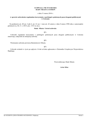 UCHWAŁA NR XVI/182/2016 RADY MIASTA USTROŃ z dnia 31 marca 2016 r. w sprawie uchwalenia regulaminu korzystania z parkingów położonych poza drogami publicznymi w Ustroniu Na podstawie art. 40 ust. 2 pkt 4, art. 41 ust. 1 oraz art. 42 ustawy z dnia 8 marca 1990 roku o samorządzie gminnym (t.j. Dz. U. z 2015, poz. 1515 ze zm.). Rada Miasta Ustroń uchwala: § 1. Uchwalić regulamin korzystania z parkingów położonych poza drogami publicznymi w Ustroniu stanowiący załącznik do niniejszej uchwały. § 2. Wykonanie uchwały powierza Burmistrzowi Miasta. § 3. Uchwała wchodzi w życie po upływie 14 dni od dnia ogłoszenia w Dzienniku Urzędowym Województwa Śląskiego. Przewodniczący Rady Miasta Artur Kluz Id: 6CD20D78-A29D-457B-B9D3-44533D569201. Podpisany Strona 1 Załącznik do Uchwały Nr XVI/182/2016 Rady Miasta Ustroń z dnia 31 marca 2016 r. Regulamin korzystania z parkingów położonych poza drogami publicznymi § 1. 1. Przedmiotem niniejszego regulaminu jest określenie zasad korzystania z parkingów położonych poza drogami publicznymi w Mieście Ustroń, zlokalizowanych: po obu stronach ul. A. Brody na wysokości Rynku, przy ul. Słonecznej, przy ul. Cieszyńskiej, przy ul Sportowej – koło mostu przy ul. Grażyńskiego, przy ul. Nadrzecznej, przy ul. 3 Maja – koło CPN. 2. Parkingi są gminnymi obiektami użyteczności publicznej. § 2. Zarządzającym parkingami jest Burmistrz Miasta Ustroń. § 3. 1. Przez postój pojazdu samochodowego w miejscu do tego wyznaczonym, osoba korzystająca z miejsca postojowego zawiera z Miastem Ustroń cywilnoprawną umowę najmu miejsca postojowego na czas postoju pojazdu. 2. Każda osoba korzystająca z miejsca postojowego poprzez wjazd na teren wyznaczony do postoju pojazdów samochodowych zobowiązuje się do przestrzegania postanowień niniejszego „Regulaminu”. § 4. 1. Parkingi są niestrzeżone, płatne. 2. Zarządzający nie ponosi odpowiedzialności za pozostawiony na parkingu pojazd, jego wyposażenie, rzeczy pozostawione przez użytkownika pojazdu oraz inne ewentualne szkody powstałe w czasie postoju. § 5. 1. Parkingi są czynne i opłaty za parkowanie pobierane są w godzinach od 800 do 1900 we wszystkie dni tygodnia za wyjątkiem parkingów przy ul. Słonecznej i 3 Maja, które to parkingi czynne są w okresie letnim tj. od 01.05. do 30.09 każdego roku, na których opłaty pobierane są tylko w weekendy (sobota, niedziela), święta oraz dni ustawowo wolne od pracy. 2. Stawki opłat za korzystanie z parkingów ustala Burmistrz Miasta Ustroń. § 6. Wjeżdżający na parkingi winni: 1. ustawić swój pojazd w miejscach do tego wyznaczonych i oznakowanych, 2. niezwłocznie po zaparkowaniu wykupić z góry u osoby obsługującej parking lub pobrać z parkomatu bilet opłaty parkingowej, za cały deklarowany czas postoju, 3. bilet parkingowy lub kartę parkingową osoby niepełnosprawnej umieścić w widocznym miejscu za przednią szybą wewnątrz pojazdu, w sposób umożliwiający ich odczytanie bez jakichkolwiek wątpliwości co do ich treści i ważności, 4. przestrzegać przepisów prawa o ruchu drogowym, stosować się do poziomych i pionowych znaków drogowych oraz poleceń obsługi parkingu lub innych osób posiadających uprawnienia w tym zakresie ( Straż Miejska, Policja, itp.), Id: 6CD20D78-A29D-457B-B9D3-44533D569201. Podpisany Strona 1 5. nie przekraczać prędkości – 10 km/godz. § 7. 1. Na terenach parkingów wyznacza się dodatkowe miejsca postojowe dla samochodów osób niepełnosprawnych. 2. Zwalnia się z opłaty osoby legitymujące się „kartą parkingową osoby niepełnosprawnej” parkujące wyłącznie na wyznaczonych stanowiskach. Postój pojazdu oznaczonego kartą osoby niepełnosprawnej poza wyznaczonymi miejscami płatny jest na zasadach ogólnych. § 8. Na terenach parkingów zabrania się: - pozostawiania pojazdu z uruchomionym silnikiem lub bez zamknięcia, - tankowania, mycia i wymiany oleju, - ustawiania pojazdów - ustawiania pojazdów w ze zmagazynowanymi substancjami łatwopalnymi i wybuchowymi, miejscach wydzielonych i oznakowanych dla innych pojazdów, - ustawiania pojazdów w sposób utrudniający ruch na parkingach, - działania niezgodnego z przepisami BHP i PPOŻ, - pozostawiania w pojeździe zwierząt w czasie postoju na miejscu parkingowym, - korzystania z parkingów niezgodnie z ich przeznaczeniem (przebywanie na parkingu jest dozwolone jedynie w związku z parkowaniem, w innych przypadkach pojazd zostanie usunięty z parkingu na koszt właściciela pojazdu). § 9. Do kontroli prawidłowości wnoszenia opłat upoważnieni są wyznaczeni przez Zarządzającego pracownicy Urzędu Miasta Ustroń, Straż Miejska, Policja, itp. § 10. 1. Użytkownik pojazdu ponosi odpowiedzialność za wszelkie szkody spowodowane przez pojazd lub inne szkody powstałe w związku z korzystaniem z miejsca parkingowego, w szczególności z tytułu zanieczyszczenia powierzchni parkingu na skutek wycieku z pojazdu płynów (oleju, płynu hamulcowego, chłodzącego, itp.). 2. O każdym przypadku nieprzestrzegania przez użytkownika pojazdu postanowień Regulaminu parkingu spełniającym znamiona czynu zabronionego bądź wykroczenia, Zarządzający zawiadomi właściwe organy ścigania. 3. Wszelkie uszkodzenia pojazdów na terenie parkingów należy zgłaszać Straży Miejskiej i Policji. § 11. Na terenie parkingu umieszcza się cennik obowiązujących opłat, Regulamin korzystania z parkingu oraz nr telefonów: 1. Straż Miejska - 33 8543483, 2. Policja - 997, 33 8542413, 3. Straż Pożarna - 998, 4. Pogotowie - 999. Id: 6CD20D78-A29D-457B-B9D3-44533D569201. Podpisany Strona 2