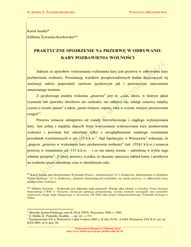 K. Juszka, E. Żywucka-Kozłowska Przerwa w odbywaniu kary ________________________________________________________________________ Karol Juszka* Elżbieta Żywucka-Kozłowska** PRAKTYCZNE SPOJRZENIE NA PRZERWĘ W ODBYWANIU KARY POZBAWIENIA WOLNOŚCI Jednym ze sposobów wstrzymania wykonania kary jest przerwa w odbywaniu kary pozbawienia wolności. Prezentację wyników przeprowadzonych badań dotyczących tej instytucji należy poprzedzić zarówno językowym jak i prawniczym znaczeniem omawianego terminu. Z językowego punktu widzenia „przerwa” jest to „czas, okres, w którym jakaś czynność lub zjawisko chwilowo nie zachodzi, nie odbywa się; odstęp czasowy między czymś a czymś; pauza” a także „puste miejsce, szpara, luka w czymś, miejsce przerywania czegoś”1. Przerwa oznacza odstępstwo od zasady bezzwłocznego i ciągłego wykonywania kary. Jest jedną z najdalej idących form wstrzymania wykonywania kary pozbawienia wolności i powinna być udzielana tylko z uwzględnieniem wąskiego rozumienia przesłanek wymienionych w art. 153 k.k.w.2. Sąd Apelacyjny w Warszawie3 wskazuje, że „pojęcie „przerwa w wykonaniu kary pozbawienia wolności” (art. 155§1 k.k.w.) oznacza przerwę w rozumieniu art. 153 k.k.w. – i co nie mniej istotne – udzieloną w trybie tego właśnie przepisu”. Z istoty przerwy wynika, że skazany opuszcza zakład karny i przebywa na wolności przez określony czas w określonym celu. * Karol Juszka jest absolwentem Wydziału Prawa i Administracji UJ w Krakowie, doktorantem w Katedrze Prawa Karnego UJ w Krakowie, autorem interesujących artykułów na temat przerwy w odbywaniu kary pozbawienia wolności. ** Elżbieta Żywucka – Kozłowska jest doktorem nauk prawnych. Pracuje jako adiunkt w Katedrze Prawa Karnego Materialnego UWM w Olsztynie, ukończyła aplikację prokuratorską, autorka licznych monografii oraz artykułów naukowych, biegły Sądu Okręgowego w Szczecinie. Od 2008 roku ekspert Międzynarodowego Trybunału Karnego w Hadze. 1 Słownik Języka Polskiego, tom II, Wyd. PWN, Warszawa 1988, s. 1001. Z. Hołda, K. Postulski, Kodeks ..., op. cit., s. 511. 3 Postanowienie SA w Warszawie z dnia 6 marca 2001 r, II Akz 91/01, A.OSA Warszawa 2/01 K-8, cyt. za: KZS 2001, nr 6, poz. 56. 2 _________________________________________________________________________________________________________ Prokuratura Okręgowa w Zielonej Górze http://www.zielona-gora.po.gov.pl/index.php?id=26 K. Juszka, E. Żywucka-Kozłowska Przerwa w odbywaniu kary ________________________________________________________________________ Grupa zagadnień związanych z przerwą w odbywaniu kary pozbawienia wolności jest często pomijana albo wręcz zapomniana przez doktrynę mimo, że stanowi w praktyce jeden z filarów resocjalizacji, czego potwierdzeniem jest systematyczny wzrost liczby postępowań dotyczących tej instytucji. Praktyczne spojrzenie na instytucję przerwy stanowiło punkt wyjścia do podjęcia badań nie przeprowadzonych dotychczas tak szeroko w Wydziale V Penitencjarnym Sądu Okręgowego w Krakowie w czasie obowiązywania k.k.w. z 1997 roku4. Przedmiotem badań była przerwa w odbywaniu kary pozbawienia wolności. Materiał badawczy obejmował 153 akta opatrzone sygnaturą Wydziału V Penitencjarnego Sądu Okręgowego w Krakowie dotyczące 90 osobowej, losowo wybranej grupy badawczej; skazanych, wobec których miały miejsce różne rozstrzygnięcia procesowe dotyczące orzekania w sprawach przerwy w odbywaniu kary pozbawienia wolności w latach 20022006. Kwestionariusz do badań aktowych zawierał wytyczne opracowane na podstawie analizy literatury przedmiotu, wyników dotychczasowych badań a także własnych wniosków i przemyśleń. Założono, że wytycznymi kwestionariusza będą następujące jednostki badawcze: osoba, sprawa, wyrok, dowód, argument. Kryteriami „osób i spraw”, „osób lub spraw” posłużono się przedstawiając płeć, wiek, stan cywilny, miejsce zamieszkania, wykształcenie, system odbywania kary, liczbę nagród i kar, zawód, formę kontaktów z rodziną, rodzaje przerw, czas trwania przerwy, wnioskodawca przerwy, argumenty wnioskodawcy przerwy, uczestnicy postępowania, rozstrzygnięcie procesowe sądu pierwszej instancji, składający zażalenie, rozstrzygnięcie procesowe sądu drugiej instancji. Prezentując przeszłość kryminalną skazanych przyjęto wyrok i osobę jako jednostkę badawczą. Analizując materiał dowodowy posłużono się dowodem jako jednostką badawczą. Uzasadnienia rozstrzygnięć procesowych badano według zawartych tam argumentów. Analizowane rozstrzygnięcia procesowe podzielono na postanowienia sądu pierwszej i drugiej instancji. Rozstrzygnięcia w pierwszej instancji to: udzielenie przerwy, odmowa udzielenia przerwy, umorzenie postępowania wykonawczego w sprawie przerwy, odwołanie przerwy, nie odwoływanie przerwy, pozostawienie wniosku o udzielenie przerwy bez rozpoznania. Rozstrzygnięcia w drugiej instancji to: utrzymanie w mocy 4 K. Juszka, Studia nad przerwą w odbywaniu kary pozbawienia wolności, Wydawnictwo Verba, Lublin 2007, s.42 i nast. _________________________________________________________________________________________________________ Prokuratura Okręgowa w Zielonej Górze http://www.zielona-gora.po.gov.pl/index.php?id=26 2 K. Juszka, E. Żywucka-Kozłowska Przerwa w odbywaniu kary ________________________________________________________________________ zaskarżonego postanowienia sądu pierwszej instancji, zmiana postanowienia i udzielenie przerwy, uchylenie postanowienia sądu pierwszej instancji i przekazanie sprawy do ponownego rozpoznania. Badania nie uwzględniają informacji o skazanych dostępnych jedynie w Aktach Osobowych „A” i „B” Charakterystykę badanych osób przed i w czasie osadzenia w jednostkach penitencjarnych wyznaczały płeć, wiek, stan cywilny, miejsce zamieszkania, wykształcenie, zawód, system odbywania kary oraz n