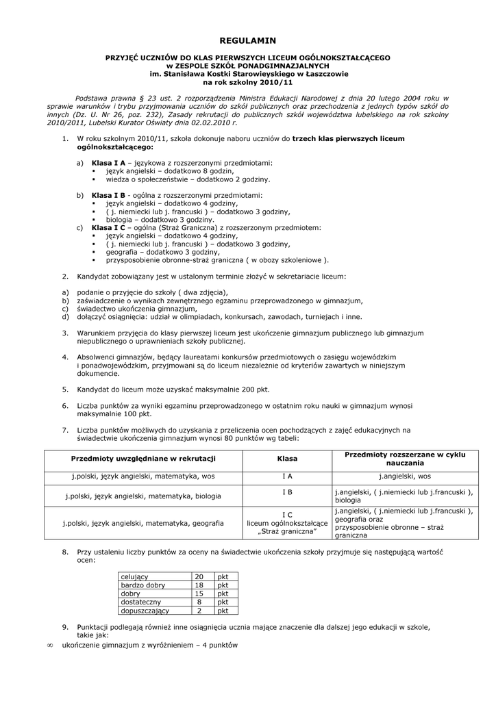 REGULAMIN PRZYJĘĆ UCZNIÓW DO KLAS PIERWSZYCH LICEUM OGÓLNOKSZTAŁCĄCEGO w ZESPOLE SZKÓŁ PONADGIMNAZJALNYCH im. Stanisława Kostki Starowieyskiego w Łaszczowie na rok szkolny 2010/11 Podstawa prawna § 23 ust. 2 rozporządzenia Ministra Edukacji Narodowej z dnia 20 lutego 2004 roku w sprawie warunków i trybu przyjmowania uczniów do szkół publicznych oraz przechodzenia z jednych typów szkół do innych (Dz. U. Nr 26, poz. 232), Zasady rekrutacji do publicznych szkół województwa lubelskiego na rok szkolny 2010/2011, Lubelski Kurator Oświaty dnia 02.02.2010 r. 1. W roku szkolnym 2010/11, szkoła dokonuje naboru uczniów do trzech klas pierwszych liceum ogólnokształcącego: a) Klasa I A – językowa z rozszerzonymi przedmiotami: język angielski – dodatkowo 8 godzin, wiedza o społeczeństwie – dodatkowo 2 godziny. b) Klasa I B - ogólna z rozszerzonymi przedmiotami: język angielski – dodatkowo 4 godziny, ( j. niemiecki lub j. francuski ) – dodatkowo 3 godziny, biologia – dodatkowo 3 godziny. Klasa I C – ogólna (Straż Graniczna) z rozszerzonym przedmiotem: język angielski – dodatkowo 4 godziny, ( j. niemiecki lub j. francuski ) – dodatkowo 3 godziny, geografia – dodatkowo 3 godziny, przysposobienie obronne-straż graniczna ( w obozy szkoleniowe ). c) 2. Kandydat zobowiązany jest w ustalonym terminie złożyć w sekretariacie liceum: a) b) c) d) podanie o przyjęcie do szkoły ( dwa zdjęcia), zaświadczenie o wynikach zewnętrznego egzaminu przeprowadzonego w gimnazjum, świadectwo ukończenia gimnazjum, dołączyć osiągnięcia: udział w olimpiadach, konkursach, zawodach, turniejach i inne. 3. Warunkiem przyjęcia do klasy pierwszej liceum jest ukończenie gimnazjum publicznego lub gimnazjum niepublicznego o uprawnieniach szkoły publicznej. 4. Absolwenci gimnazjów, będący laureatami konkursów przedmiotowych o zasięgu wojewódzkim i ponadwojewódzkim, przyjmowani są do liceum niezależnie od kryteriów zawartych w niniejszym dokumencie. 5. Kandydat do liceum może uzyskać maksymalnie 200 pkt. 6. Liczba punktów za wyniki egzaminu przeprowadzonego w ostatnim roku nauki w gimnazjum wynosi maksymalnie 100 pkt. 7. Liczba punktów możliwych do uzyskania z przeliczenia ocen pochodzących z zajęć edukacyjnych na świadectwie ukończenia gimnazjum wynosi 80 punktów wg tabeli: Przedmioty uwzględniane w rekrutacji Klasa Przedmioty rozszerzane w cyklu nauczania j.polski, język angielski, matematyka, wos IA j.angielski, wos IB j.angielski, ( j.niemiecki lub j.francuski ), biologia j.polski, język angielski, matematyka, biologia j.polski, język angielski, matematyka, geografia 8. • j.angielski, ( j.niemiecki lub j.francuski ), geografia oraz przysposobienie obronne – straż graniczna Przy ustaleniu liczby punktów za oceny na świadectwie ukończenia szkoły przyjmuje się następującą wartość ocen: celujący bardzo dobry dobry dostateczny dopuszczający 9. IC liceum ogólnokształcące „Straż graniczna” 20 18 15 8 2 pkt pkt pkt pkt pkt Punktacji podlegają również inne osiągnięcia ucznia mające znaczenie dla dalszej jego edukacji w szkole, takie jak: ukończenie gimnazjum z wyróżnieniem – 4 punktów • • • maksymalnie 10 pkt. za uzyskanie tytułu finalisty w konkursach o zasięgu co najmniej wojewódzkim, zgodnie z załącznikiem nr.1 ( 1 konkurs-4 pkt. ,2 konkursy-8 pkt., 3 i więcej konkursy-10 pkt.) maksymalnie 4 punkty (1 osiągnięcie – 2 pkt, 2 i więcej – 4 pkt.)za jedno z poniżej wskazanych osiągnięć: - zajęcie od I do III miejsca w zawodach sportowych organizowanych co najmniej na szczeblu powiatowym, - zajęcie od I do III miejsca lub uzyskanie tytułu laureata w konkursach lub zawodach artystycznych organizowanych co najmniej na szczeblu powiatowym, -zajęcie od I do III miejsca lub uzyskanie tytułu laureata w konkursach lub zawodach wiedzy lub innych konkursach tematycznych organizowanych co najmniej na szczeblu powiatowym, 2 punkty za jedno z poniŜej zapisanych na świadectwie ukończenia szkoły gimnazjalnej osiągnięć: a) działalność na rzecz innych ludzi, zwłaszcza w formie wolontariatu –aktywna współpraca z domem dziecka, hospicjum, organizacjami charytatywnymi, lub b) działalność na rzecz środowiska szkolnego, zwłaszcza w międzyszkolnych organach samorządów młodzieży, samorządzie szkolnym lub organizacjach młodzieżowych. 10. Dyrektor szkoły przyjmuje uczniów na podstawie decyzji komisji rekrutacyjno-kwalifikacyjnej powołanej w celu przeprowadzenia przyjęć uczniów do klas pierwszych. 11. Lista przyjętych kandydatów sporządzana jest według malejącej sumy punktów uzyskanych w postępowaniu rekrutacyjnym do wyczerpania limitu miejsc. 12. Do poszczególnych klas zgodnie ze składaną deklaracją przyjmowani są uczniowie, z ustalonej listy przyjętych, którzy uzyskali największą liczbę punktów, aż do wyczerpania limitu miejsc w klasie. 13. Kandydaci z listy przyjętych, którzy nie uzyskali wystarczającej ilości punktów, mogą być przyjęci do innej klasy za zgodą komisji rekrutacyjno – kwalifikacyjnej w przypadku wolnych miejsc w tej klasie. 14. Pierwszeństwo w przyjęciu do wybranej szkoły, w przypadku równorzędnych wyników uzyskanych w postępowaniu rekrutacyjno - kwalifikacyjnym mają uczniowie w kolejności: a) sieroty, osoby przebywające w placówkach opiekuńczo-wychowawczych oraz osoby umieszczone w rodzinach zastępczych, b) kandydaci o ukierunkowanych i udokumentowanych zdolnościach, którym ustalono indywidualny program lub tok nauki, c) kandydaci z problemami zdrowotnymi, ograniczającymi możliwości wyboru kierunku kształcenia ze względu na stan zdrowia, potwierdzonymi opinią poradni psychologiczno – pedagogicznej, w tym publicznej poradni specjalistycznej. 15. Przy równej ilości punktów uzyskanych przez kandydatów zastosowane zostaną następujące dodatkowe kryteria do uzyskania zróżnicowania kandydatów: a) kandy