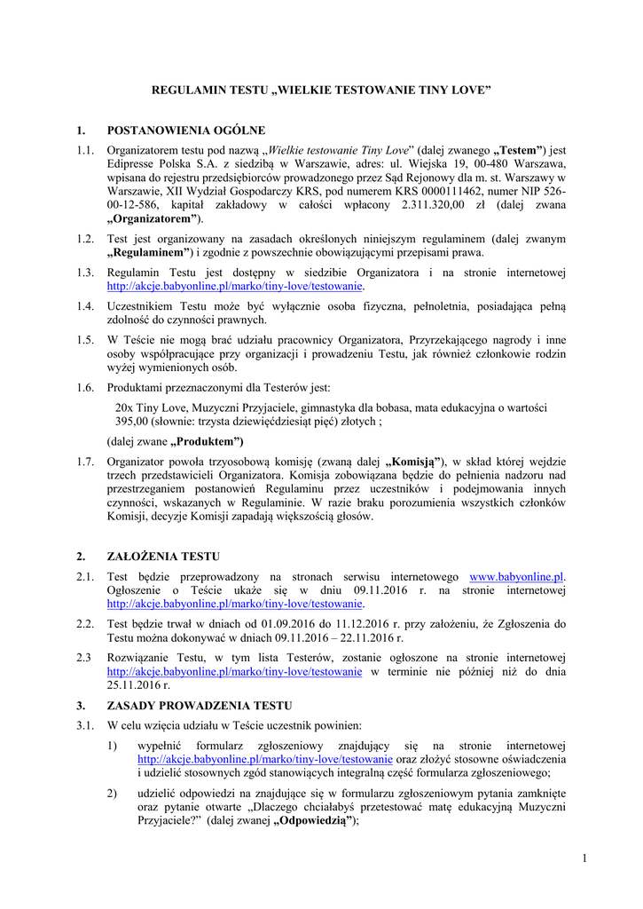 REGULAMIN TESTU „WIELKIE TESTOWANIE TINY LOVE” 1. POSTANOWIENIA OGÓLNE 1.1. Organizatorem testu pod nazwą „Wielkie testowanie Tiny Love” (dalej zwanego „Testem”) jest Edipresse Polska S.A. z siedzibą w Warszawie, adres: ul. Wiejska 19, 00-480 Warszawa, wpisana do rejestru przedsiębiorców prowadzonego przez Sąd Rejonowy dla m. st. Warszawy w Warszawie, XII Wydział Gospodarczy KRS, pod numerem KRS 0000111462, numer NIP 52600-12-586, kapitał zakładowy w całości wpłacony 2.311.320,00 zł (dalej zwana „Organizatorem”). 1.2. Test jest organizowany na zasadach określonych niniejszym regulaminem (dalej zwanym „Regulaminem”) i zgodnie z powszechnie obowiązującymi przepisami prawa. 1.3. Regulamin Testu jest dostępny w siedzibie Organizatora i na stronie internetowej http://akcje.babyonline.pl/marko/tiny-love/testowanie. 1.4. Uczestnikiem Testu może być wyłącznie osoba fizyczna, pełnoletnia, posiadająca pełną zdolność do czynności prawnych. 1.5. W Teście nie mogą brać udziału pracownicy Organizatora, Przyrzekającego nagrody i inne osoby współpracujące przy organizacji i prowadzeniu Testu, jak również członkowie rodzin wyżej wymienionych osób. 1.6. Produktami przeznaczonymi dla Testerów jest: 20x Tiny Love, Muzyczni Przyjaciele, gimnastyka dla bobasa, mata edukacyjna o wartości 395,00 (słownie: trzysta dziewięćdziesiąt pięć) złotych ; (dalej zwane „Produktem”) 1.7. Organizator powoła trzyosobową komisję (zwaną dalej „Komisją”), w skład której wejdzie trzech przedstawicieli Organizatora. Komisja zobowiązana będzie do pełnienia nadzoru nad przestrzeganiem postanowień Regulaminu przez uczestników i podejmowania innych czynności, wskazanych w Regulaminie. W razie braku porozumienia wszystkich członków Komisji, decyzje Komisji zapadają większością głosów. 2. ZAŁOŻENIA TESTU 2.1. Test będzie przeprowadzony na stronach serwisu internetowego www.babyonline.pl. Ogłoszenie o Teście ukaże się w dniu 09.11.2016 r. na stronie internetowej http://akcje.babyonline.pl/marko/tiny-love/testowanie. 2.2. Test będzie trwał w dniach od 01.09.2016 do 11.12.2016 r. przy założeniu, że Zgłoszenia do Testu można dokonywać w dniach 09.11.2016 – 22.11.2016 r. 2.3 Rozwiązanie Testu, w tym lista Testerów, zostanie ogłoszone na stronie internetowej http://akcje.babyonline.pl/marko/tiny-love/testowanie w terminie nie później niż do dnia 25.11.2016 r. 3. ZASADY PROWADZENIA TESTU 3.1. W celu wzięcia udziału w Teście uczestnik powinien: 1) wypełnić formularz zgłoszeniowy znajdujący się na stronie internetowej http://akcje.babyonline.pl/marko/tiny-love/testowanie oraz złożyć stosowne oświadczenia i udzielić stosownych zgód stanowiących integralną część formularza zgłoszeniowego; 2) udzielić odpowiedzi na znajdujące się w formularzu zgłoszeniowym pytania zamknięte oraz pytanie otwarte „Dlaczego chciałabyś przetestować matę edukacyjną Muzyczni Przyjaciele?” (dalej zwanej „Odpowiedzią”); 1 3) przesłać formularz zgłoszeniowy do Organizatora za pomocą znajdującego się na dole formularza przycisku „Wyślij zgłoszenie”. 3.2. Jeden uczestnik może wziąć udział w Teście tylko jeden raz. 3.3. Spośród wszystkich poprawnie przesłanych Odpowiedzi na pytanie otwarte, Komisja wybierze 20 najlepszych Odpowiedzi. Przy wyborze najlepszych Odpowiedzi Komisja będzie się kierować własnym uznaniem, biorąc pod uwagę walory artystyczne Odpowiedzi, w szczególności oryginalność i pomysłowość uczestnika – autora Odpowiedzi. Nie ma znaczenia kolejność zgłoszeń. 3.4. Testerami w liczbie 20 zostaną uczestnicy, których Odpowiedzi na pytania otwarte zostaną uznane przez Komisję za najlepsze zgodnie z pkt 3.3 powyżej, zwani dalej „Testerami”. Produkty zostaną przyznane po spełnieniu warunków określonych w Regulaminie. 3.5. Uczestnik oświadcza, że Odpowiedź na pytanie otwarte jest unikalną treścią, stworzoną przez niego specjalnie w celu wzięcia udziału w Teście, jak również, że nie jest publikowana w innych serwisach internetowych. 3.6. Uczestnik niniejszym oświadcza, że: (i) jest jedynym autorem Odpowiedzi zgłoszonej przez niego do Testu; (ii) Odpowiedź nie narusza praw osób trzecich; (iii) w przypadku, jeżeli Odpowiedź stanowi utwór, w rozumieniu ustawy z dnia 4 lutego 1994 r. o prawie autorskim i prawach pokrewnych, przysługują mu autorskie prawa majątkowe do Odpowiedzi, w zakresie niezbędnym do udzielenia licencji (iv) Odpowiedź nie stanowi opracowania w rozumieniu ustawy z dnia 4 lutego 1994 r. o prawie autorskim i prawach pokrewnych. 3.7. Odpowiedzi na pytania otwarte nie spełniające wymogów Regulaminu będą wykluczane z Testu przez Organizatora. 3.8. Do dnia 25.11.2016 r. Testerzy otrzymają prywatną wiadomość na skrzynkę pocztową podaną w formularzu zgłoszeniowym wraz z informacją o przyznaniu produktówi instrukcją dotyczącą dalszych etapów testowania. 3.9. Do dnia 05.12.2016 r. Testerzy otrzymają prywatną wiadomość na skrzynkę pocztową podaną w formularzu zgłoszeniowym z linkami do produktów w Katalogu Produktów Babyonline.pl, gdzie zobowiązani są napisać opinię w dniach 05.12.2016 – 11.12.2016 r. 3.10. W przypadku, jeżeli opinia określona w pkt. 3.9 stanowi utwór, w rozumieniu ustawy z dnia 4 lutego 1994 r. o prawie autorskim i prawach pokrewnych, Testerzy niniejszym udzielają Organizatorowi oraz Przyrzekającemu nagrody niewyłącznej, nieodpłatnej licencji do przesłanej opinii, zwanej dalej „Utworem”, bez ograniczeń czasowych lub terytorialnych, wraz z prawem do sublicenji na rzecz osób trzecich, na następujących polach eksploatacji: 1) zwielokrotnianie określoną techniką egzemplarzy Utworu, w tym techniką drukarską, reprograficzną, zapisu magnetycznego oraz techniką cyfrową; 2) wprowadzanie do obrotu, użyczenie lub najem oryginału albo egzemplarzy Utworu; 3) publiczne