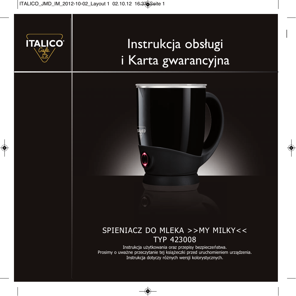 ITALICO_JMD_IM_2012-10-02_Layout 1 02.10.12 16:37 Seite 1 Instrukcja obsługi i Karta gwarancyjna SPIENIACZ DO MLEKA >>MY MILKY<< TYP 423008 Instrukcja użytkowania oraz przepisy bezpieczeństwa. Prosimy o uważne przeczytanie tej książeczki przed uruchomieniem urządzenia. Instrukcja dotyczy różnych wersji kolorystycznych. ITALICO_JMD_IM_2012-10-02_Layout 1 02.10.12 16:37 Seite 2 SPIS TREŚCI Informacje bezpieczeństwa użytkowania ............................. 3 Dane techniczne ................................................................ 4 Zawartość opakowania / zestawu ...................................... 5 Opis urządzenia ................................................................ 6 Pierwsze użycie ................................................................ 7 Spienianie mleka na ciepło ................................................ 8 Mieszanie / podgrzewanie mleka ........................................ 9 Spienianie mleka na zimno ..................................... 10 Wymiana mieszadełka ............................................ 11 Czyszczenie .......................................................... 12 Karta gwarancyjna ................................................ 13 Warunki gwarancji ................................................ 14 Informacja dla użytkowników ................................. 15 ITALICO_JMD_IM_2012-10-02_Layout 1 02.10.12 16:37 Seite 3 3 Spieniacz do mleka na zimno i na ciepło z funkcją podgrzewania i termoizolowaną obudową. Model My Milky. Typ 423008. INFORMACJE BEZPIECZEńSTWA UżYTKOWANIA Należy uważnie zapoznać się z poniższym podręcznikiem, gdyż zawiera on informacje o bezpieczeństwie użytkowania oraz wskazówki konserwacji Twojego urządzenia. Przechowuj tę instrukcję w bezpiecznym miejscu do późniejszego użycia. ITALICO nie ponosi odpowiedzialności za szkody wynikłe z nieprzestrzegania przepisów bezpieczeństwa. • Po rozpakowaniu urządzenia upewnij się, że nie jest ono uszkodzone. W razie jakichkolwiek wątpliwości nie włączaj urządzenia. Skontaktuj się ze swoim przedstawicielem ITALICO. • Przechowuj elementy opakowania (woreczki foliowe itp.) poza zasięgiem dzieci lub osób mogących stanowić potencjalne źródło zagrożenia. • Bezpieczeństwo elektryczne urządzenia może być zapewnione jedynie w przypadku zastosowania skutecznego uziemienia, zgodnego z obowiązującymi przepisami bezpieczeństwa elektrycznego. ITALICO nie ponosi odpowiedzialności za ewentualne szkody powstałe w wyniku użycia niewłaściwego podłączenia elektrycznego. • Przed podłączeniem wtyczki do gniazdka upewnij się, że napięcie elektryczne urządzenia jest zgodne z napięciem w Twoim mieszkaniu. W razie wątpliwości zwróć się o pomoc do fachowca. • Odradza się używania przedłużaczy, przejściówek i rozgałęziaczy sieciowych. W razie potrzeby korzystaj jedynie ze sprawdzonych urządzeń, które odpowiadają obowiązującym przepisom bezpieczeństwa i są kompatybilne z Twoim urządzeniem. Wszelkie próby instalacji urządzeń niezgodnych z powyższą specyfikacją mogą skutkować zagrożeniem Twojego bezpieczeństwa i wiążą się z unieważnieniem gwarancji. • Ze względów bezpieczeństwa należy zwrócić szczególną uwagę na poniższe zalecenia: - NIGDY nie korzystaj z urządzenia na dworze, - NIGDY nie wystawiaj urządzenia na działanie niekorzystnych warunków atmosferycznych (promienie słoneczne, opady deszczu itp.), - nie zezwalaj dzieciom bądź osobom nieupoważnionym na korzystanie z urządzenia, - aby odłączyć urządzenie od sieci, nie należy ciągnąć go za przewód zasilający, - NIGDY nie pozostawiaj urządzenia podłączonego do sieci bez nadzoru, - NIGDY nie zanurzaj urządzenia w wodzie lub jakichkolwiek innych cieczach, - podczas podgrzewania mleka wewnętrzna strona spieniacza będzie gorąca, dlatego należy unikać dotykania jej, - spieniacz do mleka może być używany jedynie z załączoną podstawką. • Urządzenie nie może być użytkowane przez osoby o zaburzonych zdolnościach fizycznych, sensorycznych lub psychicznych (w tym dzieci) oraz przez osoby cechujące się niewystarczającą wiedzą lub doświadczeniem w zakresie obsługi urządzenia, chyba że znajdą się one pod nadzorem osoby odpowiedzialnej za ich bezpieczeństwo lub otrzymają od niej instrukcje dotyczące prawidłowego korzystania z urządzenia. • To urządzenie nie jest zabawką. Z tego względu dzieci mogą z niego korzystać wyłącznie pod nadzorem osoby dorosłej. I • • • • • • • • • • IN • • W • • • • D M Ty N Cz M W W Po W ITALICO_JMD_IM_2012-10-02_Layout 1 02.10.12 16:37 Seite 4 INFORMACJE BEZPIECZEńSTWA UżYTKOWANIA 4 • W przypadku uszkodzenia podłączenia elektrycznego urządzenia nie należy dokonywać samodzielnych prób wymiany lub naprawy, gdyż stanowi to źródło potencjalnego zagrożenia. W celu przywrócenia urządzenia do stanu używalności należy skontaktować się z przedstawicielem ITALICO lub wykwalifikowanym fachowcem. • Gdy urządzenie nie działa lub nie działa prawidłowo, należy je wyłączyć. Nie należy podejmować prób otwierania urządzenia. W celu dokonania naprawy skontaktuj się ze swoim przedstawicielem ITALICO. • Urządzenie należy utylizować zgodnie z obowiązującymi przepisami prawnymi. Prosimy o stosowanie się do przepisów obowiązujących w Twoim miejscu zamieszkania. W żadnym wypadku nie wyrzucaj urządzenia do zwykłego kosza na śmieci! • Nie poruszaj włączonym urządzeniem. Odczekaj, aż spieniacz do mleka ostygnie, zanim zdecydujesz się przenieść go w inne miejsce lub wyczyścić. • Nigdy nie zanurzaj spieniacza, podstawki lub wtyczki w wodzie, gdyż grozi to porażeniem prądem elektrycznym. • Nie należy czyścić urządzenia pod bieżącą wodą ani w zmywarce. Nie stawiaj spieniacza w pobliżu zlewozmywaka ani na gorących powierzchniach. Jeśli urządzeni
