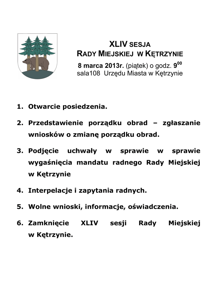 XLIV SESJA RADY MIEJSKIEJ W KĘTRZYNIE 8 marca 2013r. (piątek) o godz. 900 sala108 Urzędu Miasta w Kętrzynie 1. Otwarcie posiedzenia. 2. Przedstawienie porządku obrad – zgłaszanie wniosków o zmianę porządku obrad. 3. Podjęcie uchwały w sprawie w sprawie wygaśnięcia mandatu radnego Rady Miejskiej w Kętrzynie 4. Interpelacje i zapytania radnych. 5. Wolne wnioski, informacje, oświadczenia. 6. Zamknięcie w Kętrzynie. XLIV sesji Rady Miejskiej
