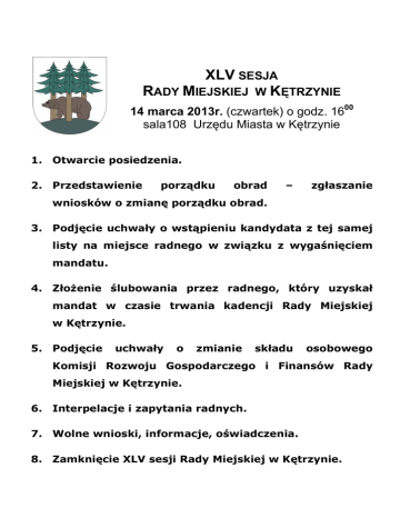 XLV SESJA RADY MIEJSKIEJ W KĘTRZYNIE 14 marca 2013r. (czwartek) o godz. 1600 sala108 Urzędu Miasta w Kętrzynie 1. Otwarcie posiedzenia. 2. Przedstawienie porządku obrad – zgłaszanie wniosków o zmianę porządku obrad. 3. Podjęcie uchwały o wstąpieniu kandydata z tej samej listy na miejsce radnego w związku z wygaśnięciem mandatu. 4. ZłoŜenie ślubowania przez radnego, który uzyskał mandat w czasie trwania kadencji Rady Miejskiej w Kętrzynie. 5. Podjęcie uchwały o zmianie składu osobowego Komisji Rozwoju Gospodarczego i Finansów Rady Miejskiej w Kętrzynie. 6. Interpelacje i zapytania radnych. 7. Wolne wnioski, informacje, oświadczenia. 8. Zamknięcie XLV sesji Rady Miejskiej w Kętrzynie.