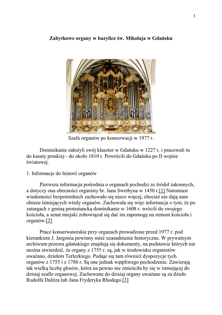 1 Zabytkowe organy w bazylice św. Mikołaja w Gdańsku Szafa organów po konserwacji w 1977 r. Dominikanie założyli swój klasztor w Gdańsku w 1227 r. i pracowali tu do kasaty pruskiej - do około 1810 r. Powrócili do Gdańska po II wojnie światowej. 1. Informacje do historii organów Pierwsza informacja pośrednia o organach pochodzi ze źródeł zakonnych, a dotyczy ona obecności organisty br. Jana Swethyna w 1450 r.[1] Natomiast wiadomości bezpośrednich zachowało się nieco więcej, chociaż nie dają nam obrazu istniejących wtedy organów. Zachowała się więc informacja o tym, że po zatargach z gminą protestancką dominikanie w 1608 r. wrócili do swojego kościoła, a senat miejski zobowiązał się dać im zapomogę na remont kościoła i organów.[2] Prace konserwatorskie przy organach prowadzone przed 1977 r. pod kierunkiem J. Jargonia powinny mieć uzasadnienie historyczne. W prywatnym archiwum przeora gdańskiego znajdują się dokumenty, na podstawie których nie można stwierdzić, że organy z 1755 r. są, jak w środowisku organistów uważano, dziełem Terlezkiego. Podaje się tam również dyspozycje tych organów z 1755 i z 1788 r. Są one jednak wątpliwego pochodzenie. Zawierają tak wielką liczbę głosów, która na pewno nie zmieściła by się w istniejącej do dzisiaj szafie organowej. Zachowane do dzisiaj organy uważane są za dzieło Rudolfa Dalitza lub Jana Fryderyka Rhodego.[3] 2 W czasie demontażu organów, przed 1977 r., odkryto iskrypcje, na podstawie których wiadomo, że naprawy organów były wykonywane w 1846 i 1866 r.[4] Przebudowy organów dokonała firma Goebela z Królewca w 1907 r. i ponownie w 1932 r. Po tej ostatniej przebudowie organy miały trakturę pneumatyczną. Kronpositiv ( pozytyw pod sklepieniem kościoła ) został przeniesiony na chór prawej nawy kościoła.[5] Remonty ze zniszczeń wojennych przeprowadzał Zbigniew Zając z Gdańska. Z lat 1953-60 zachowały się propozycje remontów organów takich firm jak: Mariana Sokołowskiego z Gdyni, Truszczyńskiego z Warszawy i Fryderyka Szwarca z Gdańska. Po 1960 r. m.in. F. Szwarc naprawiał Rurflet, miechy i wiatrownice, E. Penkała ze Stanowic koło Rybnika naprawił Dulcian. Podczas remontu wykonanego przez Romana Przytulskiego zastosowano kontuar wolno stojący i powiększono klawiaturę pedałową o 5 klawiszów.[6] Manuał I Bordon 16' Prinzipal 8' Gedackt 8' Hohlflöte 8' Gamba 8' Nasard 5 1/3' Octave 4' Gemshorn 4' Hohlflöte 4' Quinte 2 2/3' Superoctave 2' Superquinte 1/ 1/3' Septime None 1 1/7'+ 8/9' Mixtur 5-6x Scharf 3x Dulcian 16' Dyspozycja organów sprzed 1977 r.[7] Manuał III Manuał II Geigen-Prinzipal Flauto major 8' Aeoline 8' 8' Vox coel. 8' Quintaton 8' Prinzipal 4' Flöte 8' Flauto minor 4' Salicional 8' Prinzipal 4' Quinte 2 2/3' Waldflöte 2' Rohrflöte 4' Schalmei 8' Blockflöte 2' Sifflöte 1' Mixtur 3-5x Cymbel 2x Trompete 8' Pedał Untersatz 32' Prinzipal 16' Subbass 16' Violon 16' Octavbass 8' Octave 4' Choralbass 4' Wiet-Gedact 4' Kugelflöte 1' Terz-Cymbel 2x Posaune 16' Trompete 8' Schalmei 4' 2. Obecne organy Przed 1977 r. zapadła decyzja o konserwacji prospektu organów i rekonstrukcji dyspozycji do stan z XVIII w. Prace były wykonywane przez pracowników P.K.Z. w Gdańsku i przez dwie firmy organowe: Hamera z Hanoweru (R.F.N.) i Truszczyńskiego z Warszawy. Opiekę merytoryczną pełnił doc. J. Jargoń z Akademii Muzycznej w Krakowie. Pod koniec 1977 r. została 3 zakończona konserwacja i przebudowa tych organów. Od 1977 r. organy mają 35 głosów rozmieszczonych w dwóch manuałach i pedale. Klawiatury zostały wbudowane w przednią ścianę szafy. Jest to instrument o trakturze mechanicznej z wiatrownicami zasuwowo-klapowymi.[8] Według założeń miała to być rekonstrukcja dyspozycji z 1755 r. Podczas obioru organów po wykonanych pracach w 1977 r. jeden z członków komisji zapytał J. Jargonia: czy prace w organach - to rekonstrukcja, czy novum w starej szafie? Otrzymaliśmy odpowiedź, że jest to rekonstrukcja w 80 %. Jeżeli rzeczywiście rekonstrukcja - to czym uzasadniona? Pytanie miało związek ze relacjami studentów J. Jargonia z jego klasy organów - że właśnie profesor znalazł na terenie Niemiec publikację, w której były opisane organy z kościoła św. Mikołaja w Gdańsku. J. Jargoń wtedy odpowiedział pytającemu spośród komisji odbiorczej, że nie pamięta ani autora, ani tytułu tej publikacji. Odpowiedź wydała się dziwna, ponieważ pytany przez 3 lata sprawował opiekę merytoryczną na pracami i tak szybko zapomniał o ważnym materiale. Przecież na tej publikacji miała być oparta rekonstrukcja dyspozycji. Dlatego po obejrzeniu organów można stwierdzić było, że za wyjątkiem prospektu i piszczałek prospektowych, wszystko jest fabrycznie nowe ( Umówmy się, że zrekonstruowane.). Obecna zaś dyspozycja jest autorstwa J. Jargonia, (Panie świeć nad jego duszą!), a nawiązuje do dyspozycji z XVIII w. Niemniej jednak całość wykonanych prac, łącznie z dyspozycją, należy określić jako udany eksperyment. Instrument brzmi bardzo dobrze. Każda z sekcji jest odpowiednio obsadzona głosowo i bardzo dobrze zintonowana. Przy takim instrumencie ciśnie się na usta pytanie: dlaczego nie budować, jak dawniej, organów wyłącznie o trakturze mechanicznej? W tym instrumencie nie ma żadnych wspomagań elektromagnesów przy zasuwach registrowych i nie zastosowano skomplikowanej elektroniki dla wielu tzw. udogodnień. Wobec tego organista musi na koncert poprosić kogoś do zmieniania registrów i ewentualnie przewracania kartek nutowych. W czym problem ? Natomiast nie ma problemu z elektroniką, która w warunkach kościelnych jest niezawodna tylko do czasu. Prócz tego, elektronika ma coraz to nowe rozwiązania i bardzo dobrze, ale aparatu sterującego organów nie konstruuje się na 5 czy 10 lat. Dla porównania: proszę dzisiaj znaleźć części do lampowego telewizora. Mechanizmy t