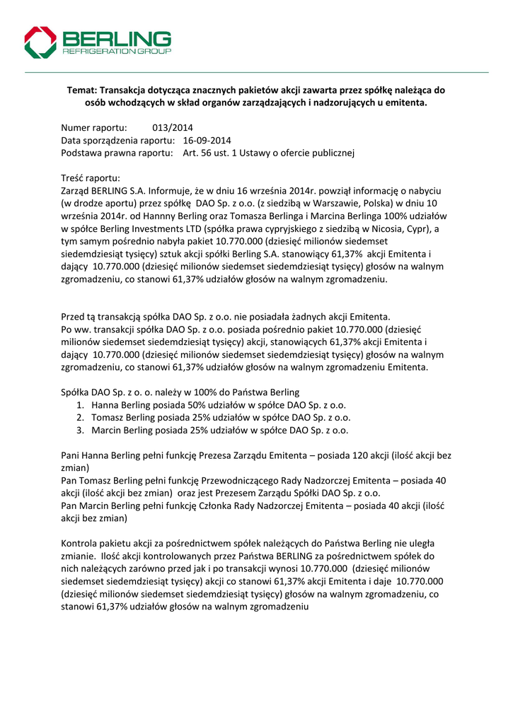 Temat: Transakcja dotycząca znacznych pakietów akcji zawarta przez spółkę należąca do osób wchodzących w skład organów zarządzających i nadzorujących u emitenta. Numer raportu: 013/2014 Data sporządzenia raportu: 16-09-2014 Podstawa prawna raportu: Art. 56 ust. 1 Ustawy o ofercie publicznej Treść raportu: Zarząd BERLING S.A. Informuje, że w dniu 16 września 2014r. powziął informację o nabyciu (w drodze aportu) przez spółkę DAO Sp. z o.o. (z siedzibą w Warszawie, Polska) w dniu 10 września 2014r. od Hannny Berling oraz Tomasza Berlinga i Marcina Berlinga 100% udziałów w spółce Berling Investments LTD (spółka prawa cypryjskiego z siedzibą w Nicosia, Cypr), a tym samym pośrednio nabyła pakiet 10.770.000 (dziesięć milionów siedemset siedemdziesiąt tysięcy) sztuk akcji spółki Berling S.A. stanowiący 61,37% akcji Emitenta i dający 10.770.000 (dziesięć milionów siedemset siedemdziesiąt tysięcy) głosów na walnym zgromadzeniu, co stanowi 61,37% udziałów głosów na walnym zgromadzeniu. Przed tą transakcją spółka DAO Sp. z o.o. nie posiadała żadnych akcji Emitenta. Po ww. transakcji spółka DAO Sp. z o.o. posiada pośrednio pakiet 10.770.000 (dziesięć milionów siedemset siedemdziesiąt tysięcy) akcji, stanowiących 61,37% akcji Emitenta i dający 10.770.000 (dziesięć milionów siedemset siedemdziesiąt tysięcy) głosów na walnym zgromadzeniu, co stanowi 61,37% udziałów głosów na walnym zgromadzeniu Emitenta. Spółka DAO Sp. z o. o. należy w 100% do Państwa Berling 1. Hanna Berling posiada 50% udziałów w spółce DAO Sp. z o.o. 2. Tomasz Berling posiada 25% udziałów w spółce DAO Sp. z o.o. 3. Marcin Berling posiada 25% udziałów w spółce DAO Sp. z o.o. Pani Hanna Berling pełni funkcję Prezesa Zarządu Emitenta – posiada 120 akcji (ilość akcji bez zmian) Pan Tomasz Berling pełni funkcję Przewodniczącego Rady Nadzorczej Emitenta – posiada 40 akcji (ilość akcji bez zmian) oraz jest Prezesem Zarządu Spółki DAO Sp. z o.o. Pan Marcin Berling pełni funkcję Członka Rady Nadzorczej Emitenta – posiada 40 akcji (ilość akcji bez zmian) Kontrola pakietu akcji za pośrednictwem spółek należących do Państwa Berling nie uległa zmianie. Ilość akcji kontrolowanych przez Państwa BERLING za pośrednictwem spółek do nich należących zarówno przed jak i po transakcji wynosi 10.770.000 (dziesięć milionów siedemset siedemdziesiąt tysięcy) akcji co stanowi 61,37% akcji Emitenta i daje 10.770.000 (dziesięć milionów siedemset siedemdziesiąt tysięcy) głosów na walnym zgromadzeniu, co stanowi 61,37% udziałów głosów na walnym zgromadzeniu Z zawiadomienia otrzymanego przez spółkę wynika, że Hanna Berling, Marcin Berling, Tomasz Berling oraz Spółki od nich zależne nie zamierzają zwiększyć udziału w ogólnej liczbie głosów spółki w okresie 12 miesięcy od złożenia tego zawiadomienia Podstawa prawna przekazania raportu: Art. 70 pkt. 1 ustawy o ofercie publicznej i warunkach wprowadzenia instrumentów finansowych do zorganizowanego systemu obrotu oraz o spółkach publicznych Art. 160 ust. 4 ustawy o obrocie instrumentami finansowymi Podpis osoby reprezentującej spółkę Data 16.09.2014 Imię i nazwisko Hanna Berling Stanowisko i funkcja Prezes Zarządu