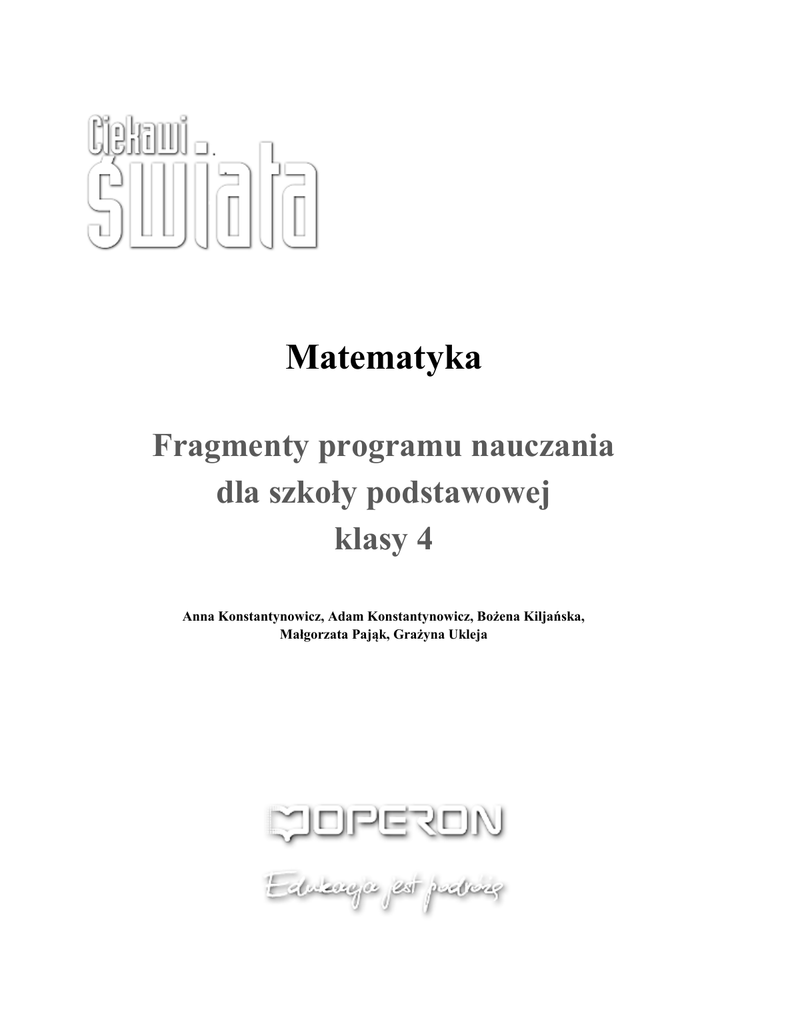 Matematyka Fragmenty programu nauczania dla szkoły podstawowej klasy 4 Anna Konstantynowicz, Adam Konstantynowicz, Bożena Kiljańska, Małgorzata Pająk, Grażyna Ukleja […] 2. Szczegółowe cele kształcenia i wychowania Celem kształcenia ogólnego w szkole podstawowej jest:  przyswojenie przez uczniów podstawowego zasobu wiadomości na temat faktów, zasad, teorii i praktyki, dotyczących przede wszystkim tematów i zjawisk bliskich ich doświadczeniom;  zdobycie przez uczniów umiejętności wykorzystywania posiadanych wiadomości podczas wykonywania zadań i rozwiązywania problemów;  ukształtowanie u uczniów postaw warunkujących sprawne i odpowiedzialne funkcjonowanie we współczesnym świecie. Cele kształcenia – wymagania ogólne I. Sprawność rachunkowa Uczeń wykonuje proste działania pamięciowe na liczbach naturalnych, całkowitych i ułamkach […] oraz potrafi wykorzystać te umiejętności w sytuacjach praktycznych. II. Wykorzystanie i tworzenie informacji Uczeń interpretuje i przetwarza informacje tekstowe, liczbowe, graficzne, rozumie i interpretuje odpowiednie pojęcia matematyczne, zna podstawową terminologię, formułuje odpowiedzi i prawidłowo zapisuje wyniki. III. Modelowanie matematyczne Uczeń dobiera odpowiedni model matematyczny do prostej sytuacji, stosuje poznane wzory i zależności, przetwarza tekst zadania na działania arytmetyczne i proste równania. IV. Rozumowanie i tworzenie strategii Uczeń prowadzi proste rozumowanie składające się z niewielkiej liczby kroków, ustala kolejność czynności (w tym obliczeń) prowadzących do rozwiązania problemu, wyciąga wnioski z kilku informacji podanych w różnej postaci. Treści nauczania – wymagania szczegółowe 1. Liczby naturalne w dziesiątkowym układzie pozycyjnym. Uczeń:  odczytuje i zapisuje liczby naturalne wielocyfrowe; […] 2. Działania na liczbach naturalnych. Uczeń:  dodaje i odejmuje w pamięci liczby naturalne dwucyfrowe, liczby wielocyfrowe w wypadkach takich, jak np. 230 + 80 lub 4600 – 1200; liczbę jednocyfrową dodaje do dowolnej liczby naturalnej i odejmuje od dowolnej liczby naturalnej; dodaje i odejmuje liczby naturalne wielocyfrowe pisemnie oraz za pomocą kalkulatora; […] 4. Ułamki zwykłe i dziesiętne. Uczeń:  opisuje część danej całości za pomocą ułamka;  przedstawia ułamek jako iloraz liczb naturalnych, a iloraz liczb naturalnych jako ułamek; […] 2 12. Obliczenia praktyczne. Uczeń:  wykonuje proste obliczenia zegarowe na godzinach, minutach i sekundach;  wykonuje proste obliczenia kalendarzowe na dniach, tygodniach, miesiącach, latach;  zamienia i prawidłowo stosuje jednostki długości: metr, centymetr, decymetr, milimetr, kilometr;  zamienia i prawidłowo stosuje jednostki masy: gram, kilogram, dekagram, tonę; […] 14. Zadania tekstowe. Uczeń:  czyta ze zrozumieniem prosty tekst zawierający informacje liczbowe;  wykonuje wstępne czynności ułatwiające rozwiązanie zadania, w tym rysunek pomocniczy lub wygodny dla siebie zapis informacji i danych z treści zadania;  dostrzega zależności między podanymi informacjami;  dzieli rozwiązanie zadania na etapy, stosując własne, poprawne, wygodne dla siebie strategie rozwiązania;  stosuje poznaną wiedzę z zakresu arytmetyki i geometrii oraz nabyte umiejętności rachunkowe, a także własne poprawne metody do rozwiązywania zadań osadzonych w kontekście praktycznym;  weryfikuje wynik zadania tekstowego, oceniając sensowność rozwiązania. […] 3. Treści edukacyjne (zgodne z treściami nauczania zawartymi w podstawie programowej) KLASA IV LICZBY NATURALNE Materiał nauczania Liczby a cyfry Przewidywane osiągnięcia Uczeń: – odróżnia pojęcie cyfry od liczby, – tworzy dowolną liczbę z danych cyfr, – odczytuje i zapisuje liczby naturalne wielocyfrowe. Dodawanie i odejmowanie Uczeń: w pamięci – wskazuje elementy dodawania i odejmowania: składniki, sumę, odjemną, odjemnik, różnicę, – dodaje liczbę jednocyfrową do dowolnej liczby naturalnej i odejmuje od dowolnej liczby naturalnej, – dodaje i odejmuje w pamięci liczby naturalne dwucyfrowe, – przedstawia liczbę w postaci sumy kilku składników, – stosuje wygodne dla siebie sposoby ułatwiające obliczenia, w tym przemienność i łączność dodawania […] Kalendarz i czas Uczeń: – wykonuje proste obliczenia zegarowe na godzinach, minutach i sekundach oraz proste obliczenia kalendarzowe na dniach, tygodniach, miesiącach, latach. UŁAMKI ZWYKŁE Materiał nauczania Przewidywane osiągnięcia Ułamek jako część całości Uczeń: – opisuje część danej całości za pomocą ułamka. 3 5. Opis założonych osiągnięć ucznia Zastosowanie przez nauczyciela wcześniej opisanych metod nauczania, form pracy i środków dydaktycznych oraz korzystanie z tego programu nauczania umożliwi uczniom zdobycie założonych osiągnięć niezbędnych na kolejnym etapie kształcenia. Liczby naturalne w dziesiątkowym układzie pozycyjnym Uczeń potrafi: odczytywać i zapisywać liczby naturalne wielocyfrowe porównywać liczby naturalne klasa IV V x x x Działania na liczbach naturalnych Uczeń potrafi: dodawać i odejmować w pamięci liczby naturalne dwucyfrowe, liczby wielocyfrowe w wypadkach takich, jak np. 230 + 80 lub 4600 – 1200; liczbę jednocyfrową dodawać do dowolnej liczby naturalnej i odejmować od dowolnej liczby naturalnej klasa IV V x x Ułamki zwykłe i dziesiętne Uczeń potrafi: opisywać część danej całości za pomocą ułamka przedstawiać ułamek jako iloraz liczb naturalnych, a iloraz liczb naturalnych jako ułamek klasa IV V x x x Obliczenia praktyczne Uczeń potrafi: wykonywać proste obliczenia zegarowe na godzinach, minutach i sekundach wykonywać proste obliczenia kalendarzowe na dniach, tygodniach, miesiącach, latach zamieniać i prawidłowo stosować jednostki długości: metr, centymetr, decymetr, milimetr, kilometr zamieniać i prawidłowo stosować jednostki mas