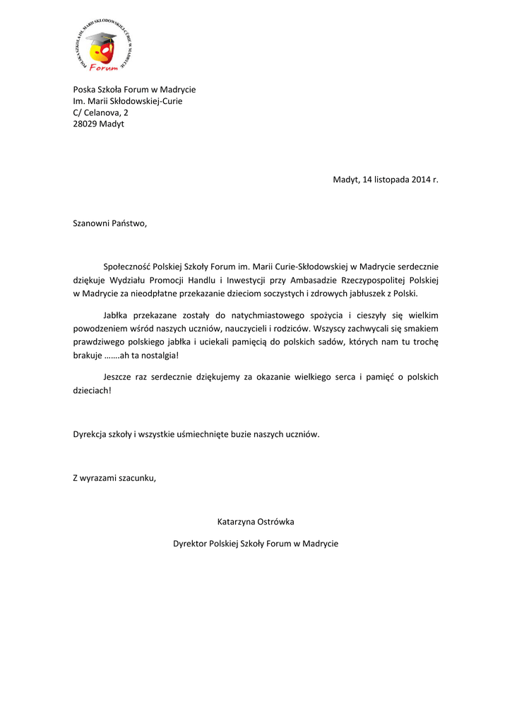 Poska Szkoła Forum w Madrycie Im. Marii Skłodowskiej-Curie C/ Celanova, 2 28029 Madyt Madyt, 14 listopada 2014 r. Szanowni Państwo, Społeczność Polskiej Szkoły Forum im. Marii Curie-Skłodowskiej w Madrycie serdecznie dziękuje Wydziału Promocji Handlu i Inwestycji przy Ambasadzie Rzeczypospolitej Polskiej w Madrycie za nieodpłatne przekazanie dzieciom soczystych i zdrowych jabłuszek z Polski. Jabłka przekazane zostały do natychmiastowego spożycia i cieszyły się wielkim powodzeniem wśród naszych uczniów, nauczycieli i rodziców. Wszyscy zachwycali się smakiem prawdziwego polskiego jabłka i uciekali pamięcią do polskich sadów, których nam tu trochę brakuje …….ah ta nostalgia! Jeszcze raz serdecznie dziękujemy za okazanie wielkiego serca i pamięć o polskich dzieciach! Dyrekcja szkoły i wszystkie uśmiechnięte buzie naszych uczniów. Z wyrazami szacunku, Katarzyna Ostrówka Dyrektor Polskiej Szkoły Forum w Madrycie