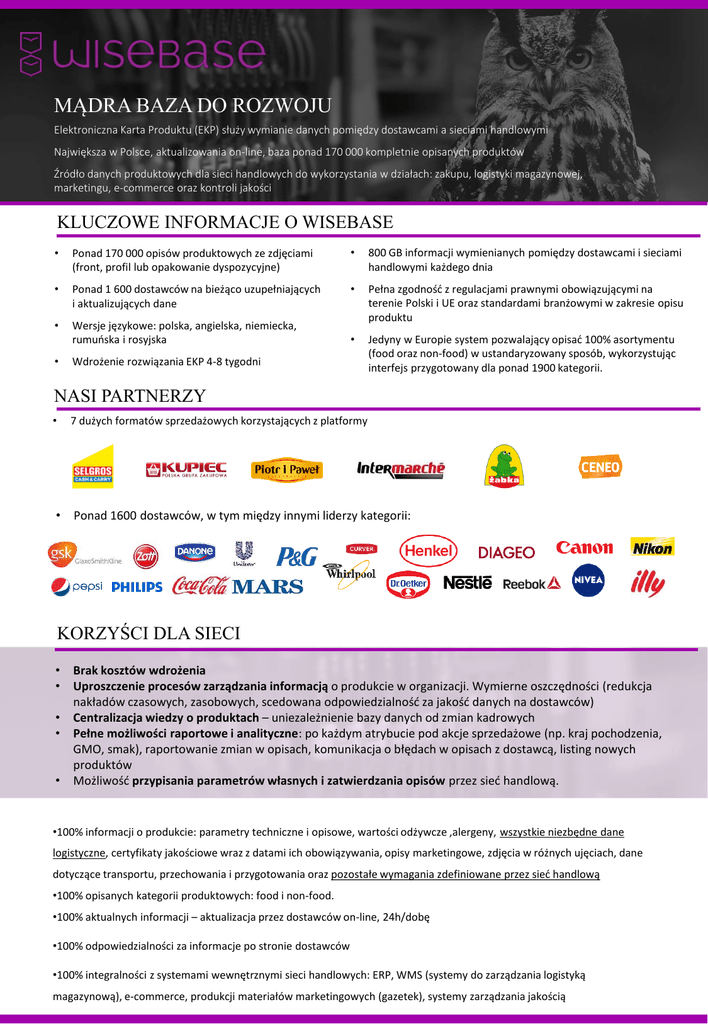 MĄDRA BAZA DO ROZWOJU Elektroniczna Karta Produktu (EKP) służy wymianie danych pomiędzy dostawcami a sieciami handlowymi Największa w Polsce, aktualizowania on-line, baza ponad 170 000 kompletnie opisanych produktów Źródło danych produktowych dla sieci handlowych do wykorzystania w działach: zakupu, logistyki magazynowej, marketingu, e-commerce oraz kontroli jakości KLUCZOWE INFORMACJE O WISEBASE • Ponad 170 000 opisów produktowych ze zdjęciami (front, profil lub opakowanie dyspozycyjne) • 800 GB informacji wymienianych pomiędzy dostawcami i sieciami handlowymi każdego dnia • Ponad 1 600 dostawców na bieżąco uzupełniających i aktualizujących dane • • Wersje językowe: polska, angielska, niemiecka, rumuńska i rosyjska Pełna zgodność z regulacjami prawnymi obowiązującymi na terenie Polski i UE oraz standardami branżowymi w zakresie opisu produktu • Jedyny w Europie system pozwalający opisać 100% asortymentu (food oraz non-food) w ustandaryzowany sposób, wykorzystując interfejs przygotowany dla ponad 1900 kategorii. • Wdrożenie rozwiązania EKP 4-8 tygodni NASI PARTNERZY • 7 dużych formatów sprzedażowych korzystających z platformy • Ponad 1600 dostawców, w tym między innymi liderzy kategorii: KORZYŚCI DLA SIECI • • • • • Brak kosztów wdrożenia Uproszczenie procesów zarządzania informacją o produkcie w organizacji. Wymierne oszczędności (redukcja nakładów czasowych, zasobowych, scedowana odpowiedzialność za jakość danych na dostawców) Centralizacja wiedzy o produktach – uniezależnienie bazy danych od zmian kadrowych Pełne możliwości raportowe i analityczne: po każdym atrybucie pod akcje sprzedażowe (np. kraj pochodzenia, GMO, smak), raportowanie zmian w opisach, komunikacja o błędach w opisach z dostawcą, listing nowych produktów Możliwość przypisania parametrów własnych i zatwierdzania opisów przez sieć handlową. •100% informacji o produkcie: parametry techniczne i opisowe, wartości odżywcze ,alergeny, wszystkie niezbędne dane logistyczne, certyfikaty jakościowe wraz z datami ich obowiązywania, opisy marketingowe, zdjęcia w różnych ujęciach, dane dotyczące transportu, przechowania i przygotowania oraz pozostałe wymagania zdefiniowane przez sieć handlową •100% opisanych kategorii produktowych: food i non-food. •100% aktualnych informacji – aktualizacja przez dostawców on-line, 24h/dobę •100% odpowiedzialności za informacje po stronie dostawców •100% integralności z systemami wewnętrznymi sieci handlowych: ERP, WMS (systemy do zarządzania logistyką magazynową), e-commerce, produkcji materiałów marketingowych (gazetek), systemy zarządzania jakością