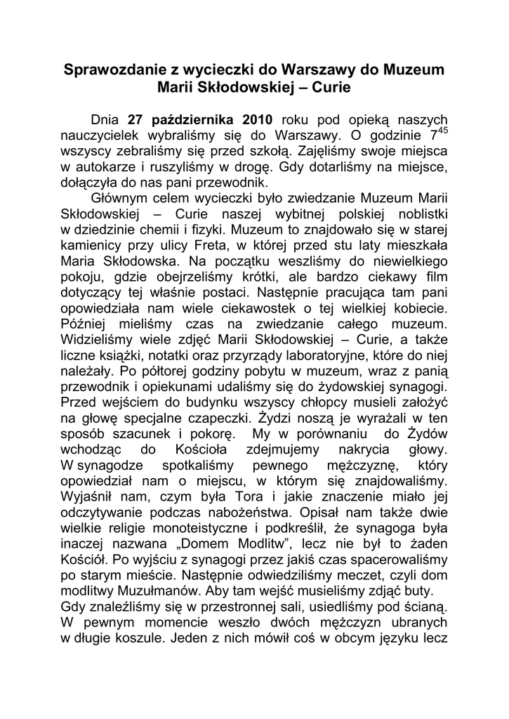Sprawozdanie z wycieczki do Warszawy do Muzeum Marii Skłodowskiej – Curie Dnia 27 października 2010 roku pod opieką naszych nauczycielek wybraliśmy się do Warszawy. O godzinie 745 wszyscy zebraliśmy się przed szkołą. Zajęliśmy swoje miejsca w autokarze i ruszyliśmy w drogę. Gdy dotarliśmy na miejsce, dołączyła do nas pani przewodnik. Głównym celem wycieczki było zwiedzanie Muzeum Marii Skłodowskiej – Curie naszej wybitnej polskiej noblistki w dziedzinie chemii i fizyki. Muzeum to znajdowało się w starej kamienicy przy ulicy Freta, w której przed stu laty mieszkała Maria Skłodowska. Na początku weszliśmy do niewielkiego pokoju, gdzie obejrzeliśmy krótki, ale bardzo ciekawy film dotyczący tej właśnie postaci. Następnie pracująca tam pani opowiedziała nam wiele ciekawostek o tej wielkiej kobiecie. Później mieliśmy czas na zwiedzanie całego muzeum. Widzieliśmy wiele zdjęć Marii Skłodowskiej – Curie, a także liczne książki, notatki oraz przyrządy laboratoryjne, które do niej należały. Po półtorej godziny pobytu w muzeum, wraz z panią przewodnik i opiekunami udaliśmy się do żydowskiej synagogi. Przed wejściem do budynku wszyscy chłopcy musieli założyć na głowę specjalne czapeczki. Żydzi noszą je wyrażali w ten sposób szacunek i pokorę. My w porównaniu do Żydów wchodząc do Kościoła zdejmujemy nakrycia głowy. W synagodze spotkaliśmy pewnego mężczyznę, który opowiedział nam o miejscu, w którym się znajdowaliśmy. Wyjaśnił nam, czym była Tora i jakie znaczenie miało jej odczytywanie podczas nabożeństwa. Opisał nam także dwie wielkie religie monoteistyczne i podkreślił, że synagoga była inaczej nazwana „Domem Modlitw”, lecz nie był to żaden Kościół. Po wyjściu z synagogi przez jakiś czas spacerowaliśmy po starym mieście. Następnie odwiedziliśmy meczet, czyli dom modlitwy Muzułmanów. Aby tam wejść musieliśmy zdjąć buty. Gdy znaleźliśmy się w przestronnej sali, usiedliśmy pod ścianą. W pewnym momencie weszło dwóch mężczyzn ubranych w długie koszule. Jeden z nich mówił coś w obcym języku lecz nic nie mogliśmy z tego zrozumieć. Później dowiedzieliśmy się, że było to nawoływanie do modlitwy. Na ścianach meczetu znajdowały się cytaty Koranu. W jednej ścianie była wnęka wyznaczająca kierunek Mekki. Natomiast na podłodze leżał ogromny dywan, który był wyszyty w różne orientalne wzory. Potem mieliśmy spotkania z Imamem, który pochodził z Syrii. Pokazał nam, w jaki sposób odczytuje się Koran i opowiedział o życiu Muzułmanina. Po całodniowym pobycie w Warszawie musieliśmy wracać do domu. W drodze powrotnej zajechaliśmy do McDonald’a. Wycieczka do Warszawy była bardzo ciekawa i pouczająca. Mamy nadzieję, że w przyszłym roku uda nam się zorganizować podobną wyprawę. Uczeń klasy Ib Piotr Milewski