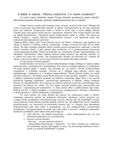 6-latek w szkole. Obawy rodziców. Co warto wiedzieć? O czym warto wiedzieć zanim Twoje dziecko przekroczy mury szkoły? Jak możesz pomóc dziecku szybciej zaaklimatyzować się w szkole? Nauka stanowi ważną część naszego życia, uczymy się przez całe życie. Dlatego tak ważne są pierwsze doświadczenia dziecka ze szkołą i przygotowanie go do tego momentu przez nas rodziców. Rozpoczęcie nauki w szkole to nowy etap w życiu małego dziecka i bardzo duży stres przed czymś nowym i nieznanym. Rodzicu! Aby Twoje dziecko nie bało się szkoły-porozmawiaj z dzieckiem przed rozpoczęciem nauki w szkole. Nie strasz go szkołą, ocenami i innymi dziećmi. Różnorodność uczniów i ich zachowań może być ciekawym doświadczeniem życiowym. Trudno polubić szkołę, jeśli Twoje dziecko słyszy od Ciebie-” Zobaczysz, jak pójdziesz do szkoły to dopiero Ci pokażą, nauczą, wychowają.” Trudno wówczas bez lęku iść do takiej szkoły. Do tego ważnego momentu należy dziecko powoli przygotować, zapoznać z trasą do szkoły, terenem szkoły, a jeśli istnieje taka możliwość, to z pomieszczeniem klasowym i nową panią nauczycielką. Warto też podzielić się z dzieckiem swoimi wspomnieniami z lat szkolnych. Opowiedzieć jakąś ciekawą historię pełną humoru, aby pokazać dziecku, że w szkole też może być wesoło. Tak przygotowane dziecko nie powinno iść z lękiem do szkoły, a pierwszy kontakt z nową rzeczywistością nie będzie dla niego szokiem. O czym jeszcze warto pamiętać? Każde dziecko rozwija się w swoim indywidualnym tempie, dlatego też należy unikać porównywania z rodzeństwem i rówieśnikami. Nie mówcie swojemu dziecku, że oczekujecie od niego samych piątek i szóstek. Nie stresujcie go „na starcie” swoimi oczekiwaniami związanymi z wysokimi ocenami. Cieszcie się z każdego jego sukcesu, nawet tego najmniejszego, wspierajcie je w każdym niepowodzeniu. Wasze dziecko będzie się wtedy rozwijać właściwie. Nie będzie przed Wami ukrywać swoich porażek, smutków i złych ocen. Z pełnym zaufaniem przyjdzie podzielić się radością i kłopotem, dając Wam w ten sposób możliwość mądrego wspierania i prawdziwego partnerstwa w rodzinie. Należy zachęcać dziecko do samodzielności, nie wyręczać go podczas prostych czynności samoobsługowych, pozwolić mu dojrzeć do szkoły. Na tym etapie rozwoju dziecka pani nauczycielka jest jedynym z najważniejszych autorytetów- w domu należy dbać o podtrzymanie tego stanu. Dobrze jest być w stałym kontakcie z wychowawcą, współpracować i utrwalać z dzieckiem w domu poznane w szkole wiadomości i umiejętności. Po czym poznać czy moje dziecko jest gotowe do rozpoczęcia nauki w szkole? Analizując gotowość dziecka do spełniania obowiązku szkolnego, należy przyjrzeć się, z jednej strony przebiegowi dotychczasowego rozwoju dziecka (np. jak przebiegał wczesny rozwój dziecka, kiedy dziecko zaczęło chodzić, mówić, itp., jak adaptowało się do warunków przedszkolnych, czy chorowało na przewlekłe choroby itp.), a z drugiej, jego aktualnemu funkcjonowaniu (jak radzi sobie w przedszkolu, czy jest zainteresowany czynnościami związanymi z przygotowaniem do nauki, jak radzi sobie w nowych i trudnych sytuacjach). Istotnymi czynnikami, jakie należy brać pod uwagę są: wiek dziecka, typ układu nerwowego i cechy temperamentu (np. czy jest dzieckiem spokojnym czy żywiołowym), poziom rozwoju dziecka : - fizyczny – czy jest sprawne ruchowo, - emocjonalno-motywacyjny i społeczny – czy łatwo rozstaje się z rodzicem, czy kontroluje emocje, jak reaguje na stres, czy przestrzega ustalonych norm i zasad, czy potrafi współdziałać w grupie, - poznawczy – jak dziecko radzi sobie z zadaniami wymagającymi wnioskowania, rozumowania, -językowy – czy dziecko mówi prawidłowo, czy potrafi wypowiadać się zdaniami poprawnie pod względem językowym), - a przede wszystkim stosowane przez nie sposoby regulacji emocji, kształtujące się na podstawie jego wcześniejszych doświadczeń emocjonalnospołecznych. Pewne postawy rodziców szczególnie utrudniają dziecku funkcjonowanie w środowisku innym niż rodzinne. Są to z jednej strony nadmierne i niedostosowane do możliwości dziecka wymagania i oczekiwania rodziców a z drugiej postawa nadmiernie opiekuńcza (np. wyręczanie dziecka w czynnościach samoobsługowych, w ubieraniu, myciu, karmienie itp.) oraz niespójny i mało konsekwentny sposób wychowania (np. tata zabrania, mama pozwala). Bez wątpienia korzystny wpływ na osiągnięcia dziecka ma wspólne spędzanie wolnego czasu z dziećmi, czytanie książek, udział w zajęciach sportowych, wakacyjne wyjazdy. Zgodnie z nową podstawą programową dziecko rozpoczynające naukę w klasie I szkoły podstawowej nie musi znać liter oraz czytać i pisać, ale powinno być przygotowane do podjęcia nauki czytania i pisania. Jak możesz pomóc swojemu dziecku w przygotowaniu do nauki czytania ? Zwróć uwagę na właściwą wymowę swojego dziecka ( w przypadku wady wymowy skonsultuj się z logopedą). Pamiętaj, że nieprawidłowa mowa będzie utrudniać Twojemu dziecku naukę czytania i pisania. Pomóż swojemu dziecku w rozwoju słuchu fonematycznego, który również rozwija się w indywidualnym tempie, a jest niezbędny do opanowania umiejętności czytania i pisania: baw się z dzieckiem w tworzenie rymów, dzielcie słowa na sylaby i liczcie sylaby w słowach, wymieniajcie wszystkie głoski w słowach, nazywajcie pierwszą, ostatnią i środkową głoskę w słowie krótkim o prostej budowie fonetycznej typu: las, dom itp., Pomóż dziecku w poszerzaniu zasobu słownictwa- czytaj dziecku bajki i zachęcaj go do opowiadania na temat ich treści. Zwróć uwagę, aby Twoje dziecko wypowiadało się tworząc zdania. Jak możesz pomóc swojemu dziecku w przygotowaniu do nauki pisania? Zachęcaj swoje dziecko do rysowania, kolorowania obrazków ze zwróceni