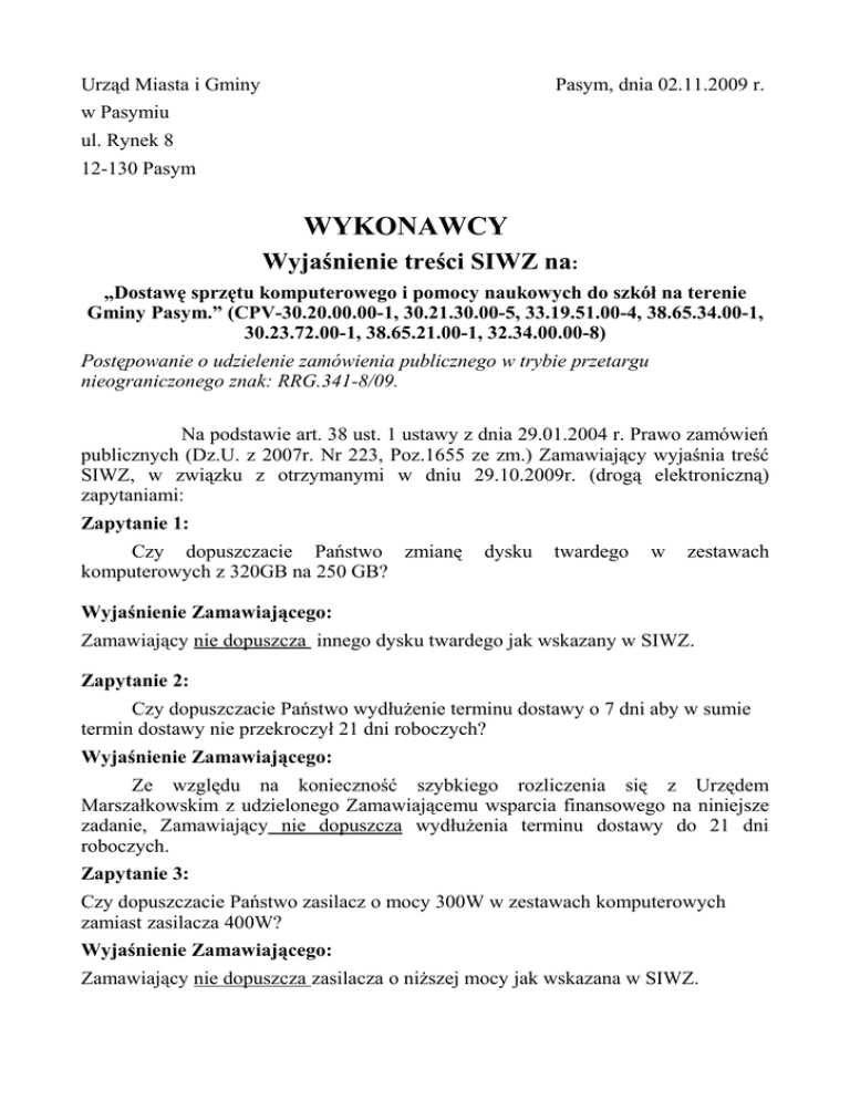 Urząd Miasta i Gminy Pasym, dnia 02.11.2009 r. w Pasymiu ul. Rynek 8 12-130 Pasym WYKONAWCY Wyjaśnienie treści SIWZ na: „Dostawę sprzętu komputerowego i pomocy naukowych do szkół na terenie Gminy Pasym.” (CPV-30.20.00.00-1, 30.21.30.00-5, 33.19.51.00-4, 38.65.34.00-1, 30.23.72.00-1, 38.65.21.00-1, 32.34.00.00-8) Postępowanie o udzielenie zamówienia publicznego w trybie przetargu nieograniczonego znak: RRG.341-8/09. Na podstawie art. 38 ust. 1 ustawy z dnia 29.01.2004 r. Prawo zamówień publicznych (Dz.U. z 2007r. Nr 223, Poz.1655 ze zm.) Zamawiający wyjaśnia treść SIWZ, w związku z otrzymanymi w dniu 29.10.2009r. (drogą elektroniczną) zapytaniami: Zapytanie 1: Czy dopuszczacie Państwo zmianę komputerowych z 320GB na 250 GB? dysku twardego w zestawach Wyjaśnienie Zamawiającego: Zamawiający nie dopuszcza innego dysku twardego jak wskazany w SIWZ. Zapytanie 2: Czy dopuszczacie Państwo wydłużenie terminu dostawy o 7 dni aby w sumie termin dostawy nie przekroczył 21 dni roboczych? Wyjaśnienie Zamawiającego: Ze względu na konieczność szybkiego rozliczenia się z Urzędem Marszałkowskim z udzielonego Zamawiającemu wsparcia finansowego na niniejsze zadanie, Zamawiający nie dopuszcza wydłużenia terminu dostawy do 21 dni roboczych. Zapytanie 3: Czy dopuszczacie Państwo zasilacz o mocy 300W w zestawach komputerowych zamiast zasilacza 400W? Wyjaśnienie Zamawiającego: Zamawiający nie dopuszcza zasilacza o niższej mocy jak wskazana w SIWZ. Zapytanie 4: „Oprogramowanie producenta komputera do zarządzania komputerem w sieci”. Co jest rozumiane pod tym stwierdzeniem? Wyjaśnienie Zamawiającego: - oprogramowanie w języku polskim, - zdalne blokowanie zasobów: portów (w tym USB) i FDD oraz COM, - zdalna aktualizacja BIOSu, - zdalny zapis i odtwarzanie ustawień CMOS, - zdalne ustawienie SETUP: czas, data, kolejność bootowania, hasło na BIOS, - zdalny monitoring sprzętowy: temp. procesora, temp. Systemu, prędkość obrotowa wentylatorów, - zdalny monitoring zainstalowanych aplikacji, - zdalny restart poszczególnych komputerów, - zdalne rozłączanie wszystkich lub pojedynczego użytkownika, - zdalny odczyt DMI: komputera, płyty głównej, obudowy, - ping podłączonego komputera, - informacja o użytkowniku: (m.in. wersja używanego OS, informacja o hardware: rodzaj HDD, rodzaj karty dźwiękowej, CPU, grafiki, LAN, ilości RAM, ilości zajętych i wolnych slotów PCI, wersja BIOS, rodzaj myszy, klawiatury i monitora, Wyjaśnienie stanowi integralną część SIWZ. BURMISTRZ MIASTA /-/ Bernard Piotr Mius