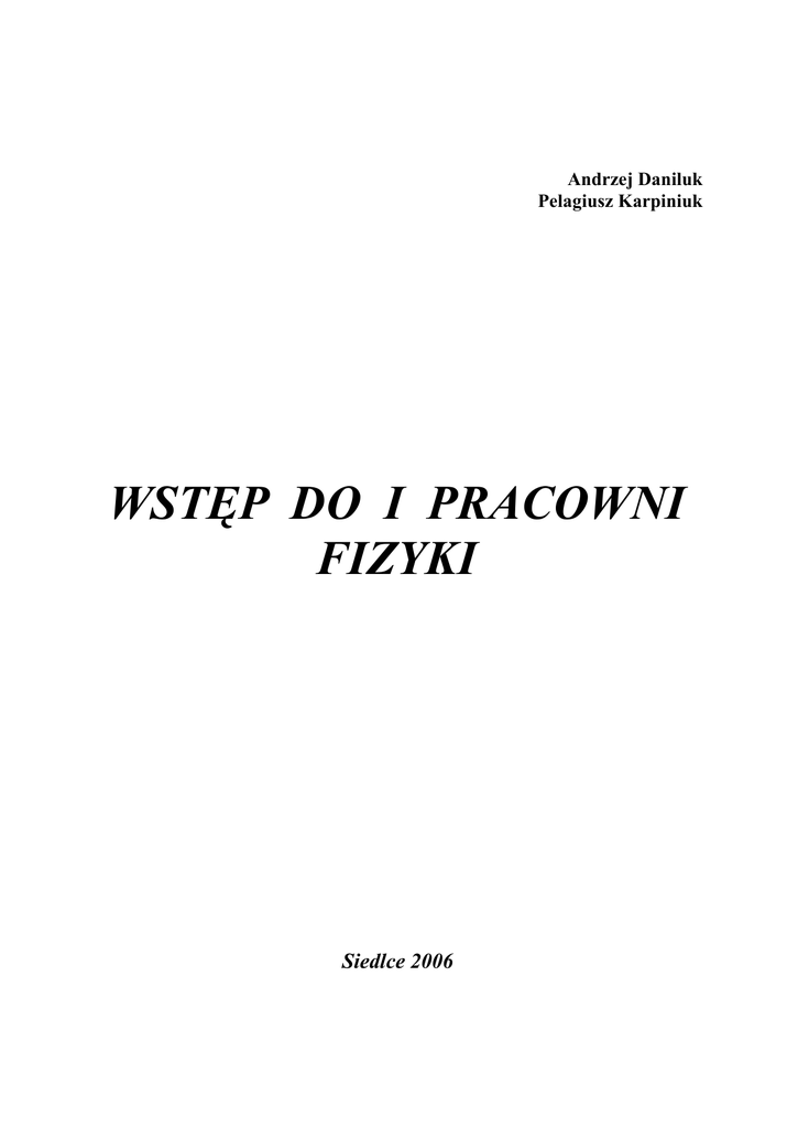 Andrzej Daniluk Pelagiusz Karpiniuk WSTĘP DO I PRACOWNI FIZYKI Siedlce 2006 Opracowanie techniczne: Krystyna Ługowska Mirosław Maś Wstęp 2 SPORZĄDZANIE SPRAWOZDANIA Z WYKONANEGO ĆWICZENIA LABORATORYJNEGO Każda osoba, wykonująca ćwiczenie laboratoryjne nawet w zespole dwu osobowym, wykonuje swoje sprawozdanie. Schemat tego sprawozdania jest następujący: I. Pieczęć pracowni. II. Temat ćwiczenia. III. Wyniki pomiarów. IV. Oszacowanie błędów wielkości mierzonych. V. Obliczenia: 1. wielkości szukanych, 2. błędu wielkości szukanych. VI. Wykres. VII. Wnioski. Punkty od I do IV są realizowane na zajęciach w pracowni, pozostałe w domu. I. Pieczęć pracowni przykładamy w lewym górnym rogu arkusza papieru, a następnie wypełniamy ją. II. Temat ćwiczenia piszemy w brzmieniu podanym w wykazie ćwiczeń przez prowadzącego zajęcia. III. Wyniki pomiarów należy zanotować tak, aby były one czytelne dla każdego. Najbardziej czytelne są wyniki pomiarów zanotowane w formie tabelki. Schemat tabelki jest następujący: Lp. Nazwa wielkości mierzonej i jej symbol jednostki Długość wahadła matematycznego (l) mm Masa kalorymetru (m) kg 1. 2. 3. Śr. Czytelność zanotowanych wyników pomiarów znakomicie ułatwia za mieszczenie przed tabelką schematu układu pomiarowego z zaznaczeniem na nim symboli wielkości mierzonych. IV.1. Podstawowe wiadomości o błędach pomiarowych i ich szacowaniu. Błędy wielkości mierzonych, ze względu na charakter ich występowania, dzielimy na przypadkowe, systematyczne i grube. Błędy przypadkowe spowodowane są dwoma głównymi przyczynami. Pierwsza przyczyna to niedokładność użytych do mierzenia przyrządów, druga to sposób mierzenia. Błędy systematyczne mogą wynikać również z winy przyrządów: np.: niedo kładne sporządzenie skali przyrządu, bądź niedokładne "ustawienie zera" np.: Wstęp 3 miernika elektrycznego, oraz z winy mierzącego np.: tzw. błąd paralaksy pope łniany systematycznie przez osobę siedzącą obok miernika i odczytującą wskazania. Przyczyną błędów systematycznych może być również niewłaściwie dobrana metoda pomiaru. Błędów systematycznych staramy się unikać przez wyeliminowanie przyczyn ich powstawania. Jeżeli błędów tych nie da się uniknąć, to staramy się oszacować ich wartość i uwzględnić w wynikach pomiarów. Błędy grube powstają w wyniku nieumiejętnego odczytywania wskazań przy rządów pomiarowych, błędnego zapisu wyniku pomiaru (np. pomylenia jedno stek) itp.. Błędy te zwykle znacznie przewyższają błędy pozostałych wyników pomiarów i łatwo je zauważyć. Błędy przypadkowe, zarówno bezwzględne jak i względne, mogą mieć war tość dodatnią i ujemną. Znaczy to, że prawdopodobieństwo tego, że wynik po miaru jest większy lub mniejszy od wartości rzeczywistej, jest jednakowe. Większość stosowanych jeszcze przyrządów pomiarowych jest tak skonstru owana, że odczytu wielkości zmierzonej dokonuje się na odpowiedniej skali. Wynik odczytu ze skali zaokrągla się na ogół do pewnej liczby działek i z tego względu powstaje tzw. błąd odczytu. Stosując zasadę zaokrąglania do pełnej liczby działek przyjmujemy tym samym, że błąd odczytu jest równy połowie wartości jednej działki. Jeżeli działki skali są bardzo małe (np.: na stoperze działki są tak małe, że wskazów ka pokrywa cała działkę), wtedy za błąd odczytu przyjmujemy wartość całej działki. W przypadku działek stosunkowo dużych, wynik odczytu zaokrąglamy do 0,5 działki, a za błąd odczytu przyjmujemy 0,25 działki. O wartości błędu, jak już było powiedziane, decyduje również sposób mierzenia. Zilustrujemy to na paru przykładach. I tak np.: przy pomiarze dłu gości linijką z podziałką milimetrową błąd 0,5 mm popełniamy przy ustawieniu początku skali na jednej krawędzi przedmiotu i 0,5 mm przy odczycie położenia na skali drugiej krawędzi przedmiotu. Tak więc łączny błąd pomiaru wyniesie 1 mm. Jeżeli długość mierzonego przedmiotu jest tak duża, że linijkę należy przy kładać do niego wielokrotnie, to za każdym przyłożeniem linijki popełniamy błąd 1 mm i łączny błąd będzie odpowiednio wielokrotnie większy. Przy pomiarze czasu stoperem na łączny błąd odczytu składa się nie tylko błąd odczytu (1 dz. = 0,2 sek.), ale również dwukrotny błąd związany z tzw. czasem reakcji na bodziec (podczas uruchomienia i zatrzymania stopera). Przyj muje się, że średnio czas reakcji na bodziec wynosi ok. 0,2 s. O błędzie pomiaru masy za pomocą wagi decyduje tzw. czułość wagi. Czułość wagi jest to masa najmniejszego odważnika, na który waga jeszcze reaguje. Czułość wagi laboratoryjnej wynosi 10 mg. Ciecz ważymy w odpowiednim naczyniu, znajdując uprzednio jego masę. Z tego względu błąd masy cieczy wyniesie 20 mg. Wstęp 4 Przyjęte wartości błędów dla poszczególnych mierzonych wielkości powinny być krótko uzasadnione. IV. 2. Podstawowe wiadomości o miernikach elektrycznych i błędach pope łnianych przy ich stosowaniu. Ze względu na wewnętrzną budowę i zasadę działania najczęściej spotykane mierniki elektryczne wskazówkowe dzielimy na: Mierniki magnetoelektryczne służą do pomiaru napięcia i natężenia prądu sta łego i w związku z tym ich zaciski wejściowe są oznaczone symbolami (+) i (-). Ponieważ amperomierze włączamy do obwodu szeregowo a więc zaciskiem oznaczonym (+) prąd powinien wpływać do miernika a zaciskiem (-) wypły wać. Woltomierz przyłączamy równolegle do elementu, na którego końcach chcemy zmierzyć różnicę potencjałów. W tym więc przypadku zacisk woltomierza oznaczony symbolem (+) dołącza my do tego końca elementu, który ma potencjał wyższy a zacisk (-) do punktu o potencjale niższym. Mierniki magnetoelektryczne z prostownikiem mogą służyć do pomiaru napi ęcia i natężenia również prądu zmiennego. Ich zaci