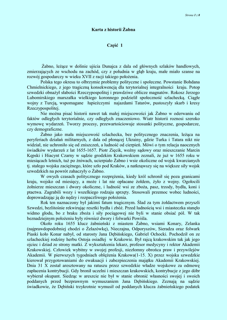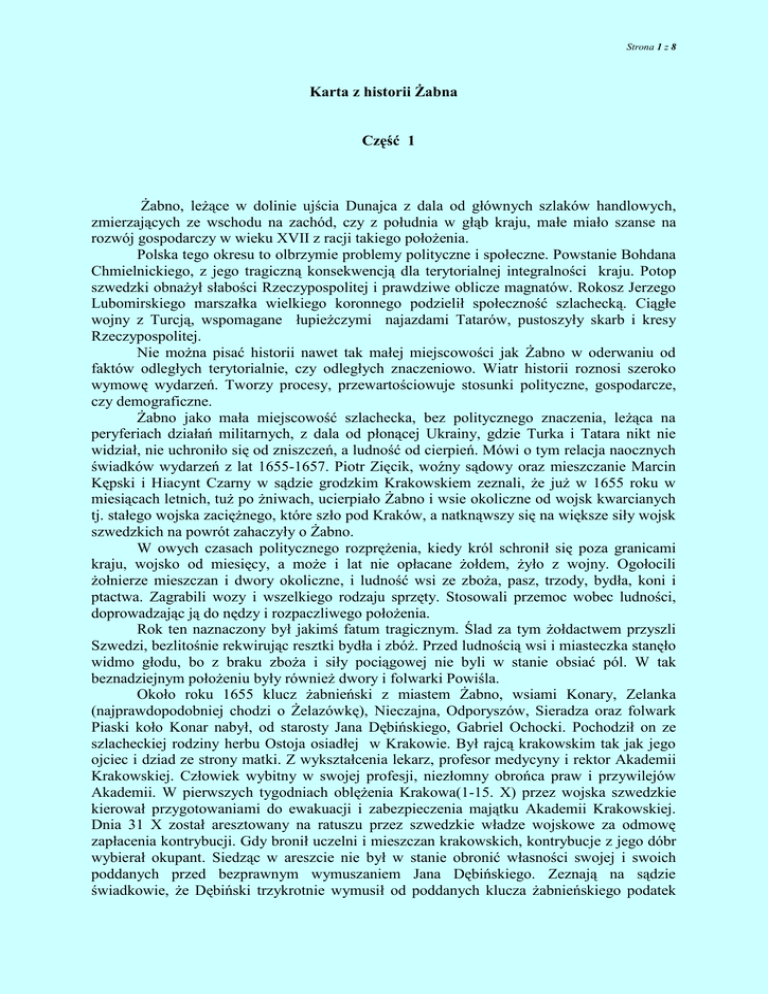 Strona 1 z 8 Karta z historii Żabna Część 1 Żabno, leżące w dolinie ujścia Dunajca z dala od głównych szlaków handlowych, zmierzających ze wschodu na zachód, czy z południa w głąb kraju, małe miało szanse na rozwój gospodarczy w wieku XVII z racji takiego położenia. Polska tego okresu to olbrzymie problemy polityczne i społeczne. Powstanie Bohdana Chmielnickiego, z jego tragiczną konsekwencją dla terytorialnej integralności kraju. Potop szwedzki obnażył słabości Rzeczypospolitej i prawdziwe oblicze magnatów. Rokosz Jerzego Lubomirskiego marszałka wielkiego koronnego podzielił społeczność szlachecką. Ciągłe wojny z Turcją, wspomagane łupieżczymi najazdami Tatarów, pustoszyły skarb i kresy Rzeczypospolitej. Nie można pisać historii nawet tak małej miejscowości jak Żabno w oderwaniu od faktów odległych terytorialnie, czy odległych znaczeniowo. Wiatr historii roznosi szeroko wymowę wydarzeń. Tworzy procesy, przewartościowuje stosunki polityczne, gospodarcze, czy demograficzne. Żabno jako mała miejscowość szlachecka, bez politycznego znaczenia, leżąca na peryferiach działań militarnych, z dala od płonącej Ukrainy, gdzie Turka i Tatara nikt nie widział, nie uchroniło się od zniszczeń, a ludność od cierpień. Mówi o tym relacja naocznych świadków wydarzeń z lat 1655-1657. Piotr Zięcik, woźny sądowy oraz mieszczanie Marcin Kępski i Hiacynt Czarny w sądzie grodzkim Krakowskiem zeznali, że już w 1655 roku w miesiącach letnich, tuż po żniwach, ucierpiało Żabno i wsie okoliczne od wojsk kwarcianych tj. stałego wojska zaciężnego, które szło pod Kraków, a natknąwszy się na większe siły wojsk szwedzkich na powrót zahaczyły o Żabno. W owych czasach politycznego rozprężenia, kiedy król schronił się poza granicami kraju, wojsko od miesięcy, a może i lat nie opłacane żołdem, żyło z wojny. Ogołocili żołnierze mieszczan i dwory okoliczne, i ludność wsi ze zboża, pasz, trzody, bydła, koni i ptactwa. Zagrabili wozy i wszelkiego rodzaju sprzęty. Stosowali przemoc wobec ludności, doprowadzając ją do nędzy i rozpaczliwego położenia. Rok ten naznaczony był jakimś fatum tragicznym. Ślad za tym żołdactwem przyszli Szwedzi, bezlitośnie rekwirując resztki bydła i zbóż. Przed ludnością wsi i miasteczka stanęło widmo głodu, bo z braku zboża i siły pociągowej nie byli w stanie obsiać pól. W tak beznadziejnym położeniu były również dwory i folwarki Powiśla. Około roku 1655 klucz żabnieński z miastem Żabno, wsiami Konary, Zelanka (najprawdopodobniej chodzi o Żelazówkę), Nieczajna, Odporyszów, Sieradza oraz folwark Piaski koło Konar nabył, od starosty Jana Dębińskiego, Gabriel Ochocki. Pochodził on ze szlacheckiej rodziny herbu Ostoja osiadłej w Krakowie. Był rajcą krakowskim tak jak jego ojciec i dziad ze strony matki. Z wykształcenia lekarz, profesor medycyny i rektor Akademii Krakowskiej. Człowiek wybitny w swojej profesji, niezłomny obrońca praw i przywilejów Akademii. W pierwszych tygodniach oblężenia Krakowa(1-15. X) przez wojska szwedzkie kierował przygotowaniami do ewakuacji i zabezpieczenia majątku Akademii Krakowskiej. Dnia 31 X został aresztowany na ratuszu przez szwedzkie władze wojskowe za odmowę zapłacenia kontrybucji. Gdy bronił uczelni i mieszczan krakowskich, kontrybucje z jego dóbr wybierał okupant. Siedząc w areszcie nie był w stanie obronić własności swojej i swoich poddanych przed bezprawnym wymuszaniem Jana Dębińskiego. Zeznają na sądzie świadkowie, że Dębiński trzykrotnie wymusił od poddanych klucza żabnieńskiego podatek Strona 2 z 8 łanowy od kmieci wskutek czego owi poddani „…nie mogąc ścierpieć ciężarów i nie mogąc się utrzymać, doprowadzeni do ostatecznej ruiny i nędzy, pouciekali z tych dóbr i rozproszyli się tak dalece, że zebrać ich i odzyskać już nie było możliwe.” Jeszcze w roku 1657 zajechał Dębiński dobra Ochockiego, spuścił wodę ze stawów rybnych powodując straty na cztery tysiące złotych. Jako, że nieszczęścia chodzą parami, to jeszcze w tym samym roku najechali „wrogowie sławnego tego królestwa, a mianowicie Szwedzi, Węgrzy, Rakoczanie, Wołosi, Mołdawianie i Kozacy…na wspomniane dobra miasta Żabna i wsi doń należących, które najpierw doszczętnie ogołocili, następnie zaś doszczętnie spalili, zabili znaczną liczbę mieszkańców płci obojga, a innych porwali i poturbowali,… zabrali wreszcie żywność, bydło, drób należące do dworów, mieszczan, włościan, zarazili bydło, pospuszczali stawy rybne.” Działo się to 22 marca, w którym to dniu nieszczęsnym kozacy z oddziałów Rakoczego kościół żabnieński ze wszystkich sprzętów okradli i podpalili. Szczęściem było, że wśród pożogi ostał się kościółek św. Krzyża, o którym Jan Długosz wspomina, z przyległem doń przytułkiem dla ubogich. Za miastem stała również drewniana kaplica św. Anny i ona szczęśliwie uniknęła pożogi. Inne oddziały Rakoczego splądrowały miasto powtórnie 27 marca. Szły te watahy w głąb Powiśla znacząc łunami pożarów swój pochód, rabując i mordując po drodze. W sąsiednim Otfinowie spalili starodawny około 400 letni kościół. Cała ta niesforna hałastra licząca w sumie 35 tysięcy wojska przemierzała południową Polskę wzdłuż i wszerz, kierując się na poleskie i mazowieckie równiny. Jerzy Lubomirski właściciel Dąbrowy, Otfinowa i wielu wsi Powiśla, otrzymał od króla Jana Kazimierza w Częstochowie buławę hetmana polnego koronnego. Książę Lubomirski dzielnie walczył z najazdem szwedzkim, a gdy dyplomatyczne jego zabiegi nie odwróciły zamiaru Rakoczego od połączenia się ze Szwedami, najechał ziemię siedmiogrodzką, a powróciwszy do Polski „samego Rakoczego różnymi podjazdami i bitwami do pokoju zmusił.” Do walnej rozprawy z wojskami Rakoczego doszło 11 lipca pod Magierowem