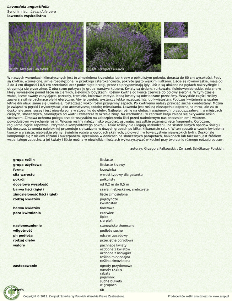 Lavandula angustifolia Synonim lac.: Lavandula vera lawenda wąskolistna W naszych warunkach klimatycznych jest to zimozielona krzewinka lub krzew o półkulistym pokroju, dorasta do 60 cm wysokości. Pędy są krótkie, wzniesione, silnie rozgałęzione, w przekroju czterokanciaste, pokryte gęsto wąskimi listkami. Liście są równowąskie, mają od 2 do 4 cm długości i 0,5 cm szerokości oraz podwinięte brzegi, przez co przypominają igły. Liście są ułożone na pędach nakrzyżlegle i utrzymują się przez zimę. Z obu stron pokrywa je gruba warstwa kutneru. Kwiaty są drobne, rurkowate, fioletowoniebieskie, zebrane w kłosy wyniesione ponad liście na cienkich, zielonych łodyżkach. Rośliny kwitną od końca czerwca do połowy sierpnia. W tym czasie wabią liczne owady zapylające, pszczoły, trzmiele, kolorowe motyle. Nocą kwiaty są odwiedzane przez ćmy. Wszystkie części rośliny zawierają silnie pachnące olejki eteryczne. Aby je uwolnić wystarczy lekko rozetrzeć liść lub kwiatostan. Podczas kwitnienia w upalne letnie dni olejki same się uwalniają, roztaczając wokół roślin przyjemny zapach. Po kwitnieniu należy przyciąć suche kwiatostany. Można je związać w pęczki i wykorzystać jako aromatyczną ozdobę mieszkania. Lawenda jest rośliną niezupełnie odporną na mróz, ale za to doskonale znosi suszę i jest niewybredna w stosunku do gleby. Najlepiej rośnie na glebach wapiennych, przepuszczalnych, w miejscach ciepłych, słonecznych, osłoniętych od wiatru zwłaszcza w okresie zimy. Na wschodzie i w centrum kraju zaleca się okrywanie roślin stroiszem. Zimowa ochrona polega przede wszystkim na zabezpieczeniu liści przed nadmiernym nasłonecznieniem i wiatrem, powodującym wysychanie roślin. Wiosną rośliny należy nisko przyciąć, usuwając wszystkie przemarznięte fragmenty. Coroczne, regularne cięcie zapewnia utrzymanie kompaktowego pokroju. Takie rośliny nie ulegają uszkodzeniu na skutek silnych opadów śniegu lub deszczu. Lawenda najpiękniej prezentuje się sadzona w dużych grupach po kilka, kilkanaście sztuk. W ten sposób w czasie kwitnienia tworzy wyraziste, niebieskie plamy. Świetnie rośnie w ogrodach skalnych, ziołowych, w towarzystwie niewysokich bylin. Doskonale komponuje się z niskimi różami i bukszpanem. Uprawiana w donicach na słonecznych parapetach, balkonach lub tarasach jest źródłem wspaniałego zapachu, a jej kwiaty i liście można w niewielkich ilościach wykorzystywać w kuchni przy tworzeniu różnego rodzaju potraw. autorzy: Grzegorz Falkowski; , Związek Szkółkarzy Polskich; grupa roślin liściaste grupa użytkowa liściaste krzewy forma krzewinka siła wzrostu wzrost typowy dla gatunku pokrój półkulisty docelowa wysokość od 0,2 m do 0,5 m barwa liści (igieł) szare, niebieskawe, srebrzyste zimozieloność liści (igieł) liście zimozielone rodzaj kwiatów pojedyncze kwiatostan barwa kwiatów fioletowe pora kwitnienia czerwiec lipiec sierpień nasłonecznienie stanowisko słoneczne wilgotność podłoże suche ph podłoża odczyn zasadowy rodzaj gleby przeciętna ogrodowa walory pachnące kwiaty ozdobne z kwiatów ozdobne z liści/igieł roślina miododajna roślina zimozielona zastosowanie ogrody przydomowe ogrody skalne rabaty pojemniki suche bukiety w grupach strefa 6b Copyright © 2013. Związek Szkółkarzy Polskich Wszelkie Prawa Zastrzeżone. Producentów roślin znajdziesz na www.zszp.pl autorzy: Grzegorz Falkowski; , Związek Szkółkarzy Polskich; Copyright © 2013. Związek Szkółkarzy Polskich Wszelkie Prawa Zastrzeżone. Producentów roślin znajdziesz na www.zszp.pl