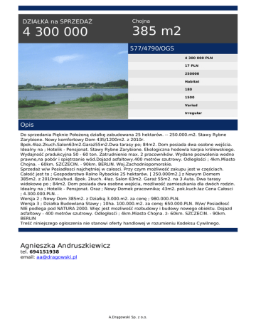 Chojna DZIAŁKA na SPRZEDAŻ 385 m2 4 300 000 577/4790/OGS 4 300 000 PLN 17 PLN 250000 Habitat 180 1500 Varied Irregular Opis Do sprzedania Pięknie Położoną działkę zabudowana 25 hektarów. -- 250.000.m2. Stawy Rybne Zarybione. Nowy komfortowy Dom 435/1200m2. z 2010r. 8pok.4łaz.2kuch.Salon63m2.Garaż55m2.Dwa tarasy po; 84m2. Dom posiada dwa osobne wejścia. Idealny na ; Hotelik - Pensjonat. Stawy Rybne Zarybione. Ekologiczna hodowla karpia królewskiego. Wydajność produkcyjna 50 - 60 ton. Zatrudnienie max. 2 pracowników. Wydane pozwolenia wodno prawne,na pobór i spiętrzanie wód.Dojazd asfaltowy.400 metrów szutrowy. Odległości ; 4km.Miasto Chojna. - 60km. SZCZECIN. - 90km. BERLIN. Woj.Zachodniopomorskie. Sprzedaż w/w Posiadłosci najchętniej w całosci. Przy czym możliwość zakupu jest w częściach. Całość jest to ; Gospodarstwo Rolno Rybackie 25 hektarów. [ 250.000m2.] z Nowym Domem 385m2. z 2010roku/bud. 8pok. 2kuch. 4łaz. Salon 63m2. Garaż 55m2. na 3 Auta. Dwa tarasy widokowe po ; 84m2. Dom posiada dwa osobne wejścia, możliwość zamieszkania dla dwóch rodzin. Idealny na ; Hotelik - Pensjonat. Oraz ; Nowy Domek pracownika; 43m2. pok.kuch.łaz Cena Całosci ; 4.300.000.PLN. . Wersja 2 ; Nowy Dom 385m2. z Działką 3.000.m2. za cenę ; 980.000.PLN. Wersja 3 ; Działka Budowlana Stawy ; 10ha. 100.000.m2. za cenę; 650.000.PLN. W/w/ Posiadłosć NIE podlega pod NATURA 2000. Więc jest mozliwość rozbudowy i budowy nowego obiektu. Dojazd asfaltowy - 400 metrów szutrowy. Odległosći ; 4km.Miasto Chojna. ż- 60km. SZCZECIN. - 90km. BERLIN Treść niniejszego ogłoszenia nie stanowi oferty handlowej w rozumieniu Kodeksu Cywilnego. Agnieszka Andruszkiewicz tel. 694151938 email: [email protected] A.Drągowski Sp. z o.o. Powered by TCPDF (www.tcpdf.org)
