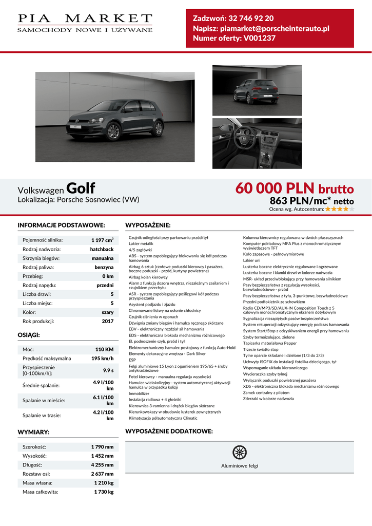 Zadzwoń: 32 746 92 20 Napisz: [email protected] Numer oferty: V001237 Volkswagen Golf 60 000 PLN brutto 863 PLN/mc* netto Lokalizacja: Porsche Sosnowiec (VW) Ocena wg. Autocentrum: INFORMACJE PODSTAWOWE: WYPOSAŻENIE: Pojemność silnika: 1 197 cm3 Czujnik odległości przy parkowaniu przód/tył Kolumna kierownicy regulowana w dwóch płaszczyznach Lakier metalik Rodzaj nadwozia: hatchback 4/5 zagłówki Komputer pokładowy MFA Plus z monochromatycznym wyświetlaczem TFT Skrzynia biegów: manualna Rodzaj paliwa: Przebieg: Rodzaj napędu: benzyna 0 km przedni ABS - system zapobiegający blokowaniu się kół podczas hamowania Koło zapasowe - pełnowymiarowe Airbag 6 sztuk (czołowe poduszki kierowcy i pasażera, boczne poduszki - przód, kurtyny powietrzne) Lusterka boczne elektrycznie regulowane i ogrzewane Airbag kolan kierowcy MSR- układ przeciwblokujący przy hamowaniu silnikiem Alarm z funkcją dozoru wnętrza, niezależnym zasilaniem i czujnikiem przechyłu Pasy bezpieczeństwa z regulacją wysokości, bezwładnościowe - przód Pasy bezpieczeństwa z tyłu, 3-punktowe, bezwładnościowe Liczba drzwi: 5 ASR - system zapobiegający poślizgowi kół podczas przyspieszania Liczba miejsc: 5 Asystent podjazdu i zjazdu Kolor: szary Rok produkcji: 2017 OSIĄGI: Moc: Prędkość maksymalna Przyspieszenie [0-100km/h]: Średnie spalanie: Spalanie w mieście: Spalanie w trasie: 110 KM 195 km/h 9.9 s 6.1 l/100 km 4.2 l/100 km Lusterka boczne i klamki drzwi w kolorze nadwozia Przedni podłokietnik ze schowkiem Chromowane listwy na osłonie chłodnicy Radio CD/MP3/SD/AUX-IN Composition Touch z 5 calowym monochromatycznym ekranem dotykowym Czujnik ciśnienia w oponach Sygnalizacja niezapiętych pasów bezpieczeństwa Dźwignia zmiany biegów i hamulca ręcznego skórzane System rekuperacji odzyskujący energię podczas hamowania EBV - elektroniczny rozdział sił hamowania System Start/Stop z odzyskiwaniem energii przy hamowaniu EDS - elektroniczna blokada mechanizmu różnicowego Szyby termoizolujące, zielone El. podnoszenie szyb, przód i tył Tapicerka materiałowa Pepper Elektromechaniczny hamulec postojowy z funkcją Auto-Hold Trzecie światło stop Elementy dekoracyjne wnętrza - Dark Silver Tylne oparcie składane i dzielone (1/3 do 2/3) ESP Uchwyty ISOFIX do instalacji fotelika dziecięcego, tył Felgi aluminiowe 15 Lyon z ogumieniem 195/65 + śruby antykradzieżowe Wspomaganie układu kierowniczego Fotel kierowcy - manualna regulacja wysokości 4.9 l/100 km Lakier uni Hamulec wielokolizyjny - system automatycznej aktywacji hamulca w przypadku kolizji Wycieraczka szyby tylnej Wyłącznik poduszki powietrznej pasażera XDS - elektroniczna blokada mechanizmu różnicowego Immobilizer Zamek centralny z pilotem Instalacja radiowa + 4 głośniki Zderzaki w kolorze nadwozia Kierownica 3-ramienna i drążek biegów skórzane Kierunkowskazy w obudowie lusterek zewnętrznych Klimatyzacja półautomatyczna Climatic WYPOSAŻENIE DODATKOWE: WYMIARY: Szerokość: 1 790 mm Wysokość: 1 452 mm Długość: 4 255 mm Rozstaw osi: 2 637 mm Masa własna: 1 210 kg Masa całkowita: 1 730 kg Aluminiowe felgi BEZPIECZEŃSTWO: ABS - system zapobiegający blokowaniu się kół podczas hamowania Airbag 6 sztuk (czołowe poduszki kierowcy i pasażera, boczne poduszki przód, kurtyny powietrzne) Airbag kolan kierowcy ESP Pasy bezpieczeństwa z regulacją wysokości, bezwładnościowe - przód Pasy bezpieczeństwa z tyłu, 3-punktowe, bezwładnościowe Wyłącznik poduszki powietrznej pasażera *Rata leasingu Niniejsza informacja oraz kalkulacja dotyczy produktów Porsche Inter Auto Polska Sp. z o.o. Niniejsza informacja nie stanowi oferty w rozumieniu kodeksu cywilnego. Kalkulacja ma jedynie charakter poglądowy i szacunkowy, oparta jest na wskazanych powyżej założeniach; zarówno wskazana cena produktu, jak i wyliczona rata leasingowa mogą ulec zmianie. Informacja nie stanowi gwarancji dostępności produktu. Ostateczne warunki, w tym cenę i wysokość raty leasingowej, określa umowa. Oferta ma charakter informacyjny, nie stanowi oferty handlowej w rozumieniu Art. 66. § 1 Kodeksu Cywilnego.