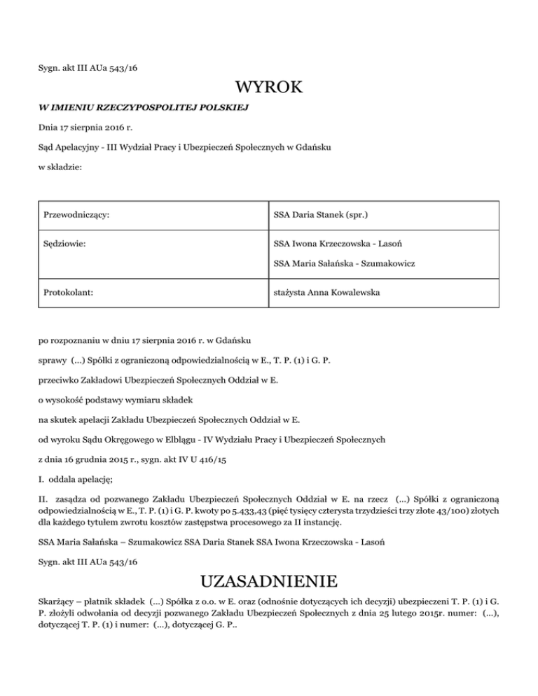 Sygn. akt III AUa 543/16 WYROK W IMIENIU RZECZYPOSPOLITEJ POLSKIEJ Dnia 17 sierpnia 2016 r. Sąd Apelacyjny - III Wydział Pracy i Ubezpieczeń Społecznych w Gdańsku w składzie: Przewodniczący: SSA Daria Stanek (spr.) Sędziowie: SSA Iwona Krzeczowska - Lasoń SSA Maria Sałańska - Szumakowicz Protokolant: stażysta Anna Kowalewska po rozpoznaniu w dniu 17 sierpnia 2016 r. w Gdańsku sprawy (...) Spółki z ograniczoną odpowiedzialnością w E., T. P. (1) i G. P. przeciwko Zakładowi Ubezpieczeń Społecznych Oddział w E. o wysokość podstawy wymiaru składek na skutek apelacji Zakładu Ubezpieczeń Społecznych Oddział w E. od wyroku Sądu Okręgowego w Elblągu - IV Wydziału Pracy i Ubezpieczeń Społecznych z dnia 16 grudnia 2015 r., sygn. akt IV U 416/15 I. oddala apelację; II. zasądza od pozwanego Zakładu Ubezpieczeń Społecznych Oddział w E. na rzecz (...) Spółki z ograniczoną odpowiedzialnością w E., T. P. (1) i G. P. kwoty po 5.433,43 (pięć tysięcy czterysta trzydzieści trzy złote 43/100) złotych dla każdego tytułem zwrotu kosztów zastępstwa procesowego za II instancję. SSA Maria Sałańska – Szumakowicz SSA Daria Stanek SSA Iwona Krzeczowska - Lasoń Sygn. akt III AUa 543/16 UZASADNIENIE Skarżący – płatnik składek (...) Spółka z o.o. w E. oraz (odnośnie dotyczących ich decyzji) ubezpieczeni T. P. (1) i G. P. złożyli odwołania od decyzji pozwanego Zakładu Ubezpieczeń Społecznych z dnia 25 lutego 2015r. numer: (...), dotyczącej T. P. (1) i numer: (...), dotyczącej G. P.. Decyzjami tymi ZUS ustalił wysokość podstawy wymiaru składek na ubezpieczenia społeczne i zdrowotne za okresy: od 01/2010 do 07/2014 z uwzględnieniem za poszczególne miesiące nie tylko przychodów z tytułu umów o pracę, ale i z tytułu sprawowania funkcji odpowiednio Prezesa i Wiceprezesa w Zarządzie skarżącej Spółki. Skarżący zarzucili naruszenie przepisów ustawy z dnia 13 października 1998r. o systemie ubezpieczeń społecznych, a w konsekwencji również bezpodstawne zastosowanie przepisów ustawy z dnia 27 sierpnia 2004r. o świadczeniach zdrowotnych finansowanych ze środków publicznych. Wskazując na powyższe zarzuty skarżący wnieśli o zmianę obu decyzji i ustalenie wysokości podstawy wymiaru składek w oparciu o wynagrodzenie wyłącznie z tytułu zatrudnienia na podstawie umowy o pracę. W uzasadnieniu odwołań wywodzono, że po przeprowadzeniu u płatnika składek kontroli okresowej pozwany ZUS stwierdził, iż wysokość podstawy wymiaru składek na ubezpieczenia T. P. (1), zatrudnionego na stanowisku Dyrektora Centrum Handlowo-Usługowego i pełniącego jednocześnie funkcję Prezesa Zarządu płatnika oraz G. P., zatrudnionej na stanowisku Kierownika Departamentu Tekstylia i pełniącej jednocześnie funkcję Wiceprezesa Zarządu, zostały wadliwie wyliczone. Następnie wskazano, że T. P. (1) wykonuje czynności członka organu zarządzającego spółki (Prezesa Zarządu), opisane w stosownych przepisach Kodeksu spółek handlowych i w akcie założycielskim Spółki. Czynności te wykonuje w oparciu o akt powołania go przez uprawniony organ. Po drugie T. P. (1) pełni obowiązki Dyrektora Centrum HandlowoUsługowego na podstawie umowy o pracę zawartej z nim w dniu 24 listopada 2004r. Zakres jego obowiązków określony został zgodnie z interesem wspólników i obejmuje bieżące zarządzanie jednostką organizacyjną Spółki, tj. C.. Do jego obowiązków należy między innymi współudział w tworzeniu i koordynacja realizacji długoterminowych planów strategicznych Centrum Handlowo-Usługowego. G. P. wykonuje czynności członka organu zarządzającego spółki (Wiceprezesa Zarządu) i obowiązki Kierownika Departamentu Tekstylia na podstawie umowy o pracę zawartej w dniu 24 listopada 2004r. Zakres jej obowiązków pracowniczych określony został zgodnie z interesem wspólników i obejmuje kierowanie pracą komórki wchodzącej w skład struktury organizacyjnej Spółki, tj. Departamentem Tekstylia. Zadania swoje realizuje między innymi we współpracy z Dyrektorem Finansowo-Administracyjnym i Dyrektorem Handlowym. Na dzień wydania zaskarżonych decyzji w obrocie prawnym funkcjonują po dwa tytuły prawne, na mocy, których ubezpieczeni wykonują swoje obowiązki (umowy o pracę i akty powołania), nieuprawnione jest łączne potraktowanie ubezpieczonych, jako pracowników, z wynikającymi z tego konsekwencjami w postaci uwzględnienia do podstawy wymiaru składek wynagrodzenia z obydwu tytułów, tj.: jako jednego wynagrodzenia ze stosunku pracy. W ocenie skarżących pozwany wskazał na przepisy ustawy systemowej dotyczące pracowników, gdyż nie ma odpowiedniego przepisu regulującego opłacanie składek na ubezpieczenia członków organu korporacyjnego, powołanych na stanowisko uchwałą stosownego organu. Według skarżących skoro pozwany twierdzi, że ubezpieczeni pobierali wynagrodzenie z dwóch tytułów za tę samą pracę, co wskazuje, iż jeden z tytułów jest pozorny, to tym samym organ rentowy miał obowiązek sprecyzowania, który z nich jest pozorny. Z uwagi na to, że stosunek korporacyjny wynika z Kodeksu spółek handlowych, należałoby uznać, iż pozorna jest umowa o pracę, czego konsekwencją byłby brak obowiązku ubezpieczenia z tego tytułu. Kolejną konsekwencją takiego ustalenia byłby obowiązek zwrotu Spółce uiszczonych składek. Skarżący powołali się ponadto na interpretacje (...) Oddział w G. w dwóch podobnych sprawach. W odpowiedzi na odwołania pozwany wniósł o ich oddalenie, podtrzymując twierdzenia z zaskarżonych decyzji. Za sporne przyjęto to, czy obowiązki wykonywane przez ubezpieczonych w ramach dwóch stosunków prawnych były tożsame. Pozwany nie kwestionował, iż to odpowiednie organy spółki władne są określić, czy uzasadnione jest interesem gospodarczym rozszerzenie, czy ograniczenie zakresu obowiązków dyrektora oraz czy obowiązki prezesa s