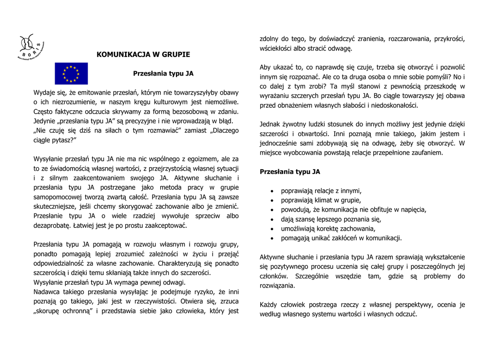 KOMUNIKACJA W GRUPIE Przesłania typu JA Wydaje się, że emitowanie przesłań, którym nie towarzyszyłyby obawy o ich niezrozumienie, w naszym kręgu kulturowym jest niemożliwe. Często faktyczne odczucia skrywamy za formą bezosobową w zdaniu. Jedynie „przesłania typu JA” są precyzyjne i nie wprowadzają w błąd. „Nie czuję się dziś na siłach o tym rozmawiać” zamiast „Dlaczego ciągle pytasz?” Wysyłanie przesłań typu JA nie ma nic wspólnego z egoizmem, ale za to ze świadomością własnej wartości, z przejrzystością własnej sytuacji i z silnym zaakcentowaniem swojego JA. Aktywne słuchanie i przesłania typu JA postrzegane jako metoda pracy w grupie samopomocowej tworzą zwartą całość. Przesłania typu JA są zawsze skuteczniejsze, jeśli chcemy skorygować zachowanie albo je zmienić. Przesłanie typu JA o wiele rzadziej wywołuje sprzeciw albo dezaprobatę. Łatwiej jest je po prostu zaakceptować. Przesłania typu JA pomagają w rozwoju własnym i rozwoju grupy, ponadto pomagają lepiej zrozumieć zależności w życiu i przejąć odpowiedzialność za własne zachowanie. Charakteryzują się ponadto szczerością i dzięki temu skłaniają także innych do szczerości. Wysyłanie przesłań typu JA wymaga pewnej odwagi. Nadawca takiego przesłania wysyłając je podejmuje ryzyko, że inni poznają go takiego, jaki jest w rzeczywistości. Otwiera się, zrzuca „skorupę ochronną” i przedstawia siebie jako człowieka, który jest zdolny do tego, by doświadczyć zranienia, rozczarowania, przykrości, wściekłości albo stracić odwagę. Aby ukazać to, co naprawdę się czuje, trzeba się otworzyć i pozwolić innym się rozpoznać. Ale co ta druga osoba o mnie sobie pomyśli? No i co dalej z tym zrobi? Ta myśl stanowi z pewnością przeszkodę w wyrażaniu szczerych przesłań typu JA. Bo ciągle towarzyszy jej obawa przed obnażeniem własnych słabości i niedoskonałości. Jednak żywotny ludzki stosunek do innych możliwy jest jedynie dzięki szczerości i otwartości. Inni poznają mnie takiego, jakim jestem i jednocześnie sami zdobywają się na odwagę, żeby się otworzyć. W miejsce wyobcowania powstają relacje przepełnione zaufaniem. Przesłania typu JA poprawiają relacje z innymi, poprawiają klimat w grupie, powodują, że komunikacja nie obfituje w napięcia, dają szansę lepszego poznania się, umożliwiają korektę zachowania, pomagają unikać zakłóceń w komunikacji. Aktywne słuchanie i przesłania typu JA razem sprawiają wykształcenie się pozytywnego procesu uczenia się całej grupy i poszczególnych jej członków. Szczególnie wszędzie tam, gdzie są problemy do rozwiązania. Każdy człowiek postrzega rzeczy z własnej perspektywy, ocenia je według własnego systemu wartości i własnych odczuć. Przesłania typu JA odnoszą się do własnej osoby i zaczynają się od „Ja ...”, „Wydaje mi się, że ...”. Na plan pierwszy wysuwa się tutaj punkt widzenia mówiącego. Zaletą przesłań typu JA jest z reguły akceptacja ich ze strony słuchającego, ponieważ stanowią one subiektywne wypowiedzi. Rozmówca może przedłożyć własny punkty widzenia i zasadniczo nie musi im się przeciwstawiać. Zwłaszcza w trudnych rozmowach przesłania te stają się bardzo pomocne, ponieważ stawiają w centrum wypowiedzi własne odczucia. W trakcie rozmów w grupach tego typu przesłania pozwalają wplatać w dialog różne perspektywy myślenia i różne zdania, które w tym momencie zyskują tę samą wartość. Jeśli rozmowa przebiega ciężko, za pomocą przesłania typu JA możesz poinformować swojego rozmówcę o tym, jak tę sytuację postrzegasz i jakie odczucia rodzą się u ciebie w związku z tym. Dowiaduje się on przy okazji, jakie odczucia czy myśli wywołuje u ciebie jego zachowanie albo wypowiedzi. Uświadamia sobie wówczas, że osoba naprzeciwko to człowiek z krwi i kości, niepozbawiony uczuć i mający własne potrzeby. Charakterystyczne dla przesłań typu JA są następujące oznaki: wyrażanie się w pierwszej osobie liczby pojedynczej, unikanie sformułowań w drugiej i trzeciej osobie liczby pojedynczej, także unikanie wypowiedzi w formie bezosobowej, bezpośrednie wyrażanie obserwacji albo życzeń. Istotę tych przesłań stanowią własne doznania. Opisują one ponadto sposób, w jaki odebrano zachowanie innych osób oraz jakie ewentualnie może to pociągnąć za sobą konsekwencje. Formułowanie przesłań typu JA Przesłania te formułowane są zazwyczaj w taki sposób, że zawierają zaimek „ja”. Jak widać na poniższych przykładach, przekazują informacje o tym, jak rozmówca odbiera aktualną sytuację, a także często równocześnie zawierają uzasadnienie takiego stanu: „Jestem już troszkę niecierpliwy (doznanie), bo od 15 minut nasza rozmowa toczy się ciągle wokół tego samego punktu (przyczyna).” „Czuję się przytłoczony przez ciebie (doznanie), bo dajesz mi takie krótkie terminy (przyczyna).” „Cieszę się (doznanie), że pozyskałeś tę osobę do naszej grupy (przyczyna).” Wykorzystywanie przesłań typu JA w rozmowach w grupie Przedstawiasz swój aktualny i jasny wizerunek jako człowieka. Inni członkowie grupy mają dokładniejsze zdanie o tobie. Łatwiej możesz poruszyć w rozmowie drażniące aspekty. Także łatwiej przychodzi poruszanie tematów dotyczących emocji i życzeń. Członkowie grupy otrzymują reakcje zwrotną o tym, jak ich zachowanie na ciebie wpływa. Krytykę i korekty można wyrażać ostrożniej. W dialogu łatwiej zaakceptować zróżnicowane punkty widzenia. Ludziom w ten sposób przychodzi łatwiej akceptowanie oceny swojego zachowania. Przesłania typu TY Poniższy przykład przybliża różnicę pomiędzy przesłaniem typu JA a przesłaniem typu TY: Przesłanie typu TY: „Ty w ogóle mnie nie słuchałeś.” Przesłanie typu JA: „Mam wrażenie, że mnie w ogóle nie słuchałeś.” Przesłania typu TY o