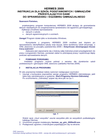 HERMES 2009 INSTRUKCJA DLA SZKÓŁ PODSTAWOWYCH / GIMNAZJÓW PRZESYŁAJĄCYCH DANE DO SPRAWDZIANU / EGZAMINU GIMNAZJALNEGO Szanowni Państwo, przekazujemy program komputerowy HERMES 2009 słuŜący do gromadzenia danych niezbędnych do zorganizowania sprawdzianu lub egzaminu gimnazjalnego. Aplikacja umoŜliwia wprowadzanie: • danych o szkole , • danych egzaminacyjnych o uczniach. Uwaga! Program działa tylko w środowisku Windows. Korzystanie z programu HERMES 2009 moŜliwe jest dopiero po wprowadzeniu identyfikatora szkoły oraz klucza, które dyrektorzy szkół otrzymają z OKE Jaworzno na początku października 2008 r. Dotychczas obowiązujące klucze tracą waŜność! Zalecane jest zapoznanie się z treścią całej instrukcji przed przystąpieniem do pracy z programem Hermes, poniewaŜ ułatwi to późniejszą pracę i wyeliminuje błędy podczas wprowadzania danych. 1 POBRANIE PORGRAMU Instalator programu moŜna pobrać z serwisu dla dyrektorów podstawowych i gimnazjów OKE Jaworzno (zakładka Hermes 2009). 2 szkół INSTALACJA PROGRAMU W celu poprawnej instalacji naleŜy wykonać następujące czynności: 1. Usunąć z komputera poprzednie wersje programu HERMES (deinstalacja), jeśli takie były zainstalowane w systemie: Start-Programy-Hermes-Odinstaluj Po uruchomieniu „Odinstaluj” pojawi się okno jak na rys.1. rys. 1 Wybór opcji „Usuń wszystko” usunie wszystkie pliki ze wszystkich podkatalogów katalogu Hermes. 2. Uruchomić program instalacyjny hermes_sp_gim_2009w00.exe. 3. Postępować zgodnie z instrukcjami pojawiającymi się na ekranie. OKE Jaworzno Instrukcja obsługi aplikacji Hermes 2009 – wersja dla szkół podstawowych i gimnazjów 1 4. Program instaluje się w podanej na ekranie (rys. 2) lokalizacji. W celu wskazania innej lokalizacji naleŜy przycisnąć przycisk „Wybierz”. 5. Aby kontynuować instalację, naleŜy kliknąć przycisk „Dalej” (rys. 2). rys. 2 6. Po pomyślnej instalacji naleŜy kliknąć przycisk „Zakończ”, aby uruchomić aplikację (rys. 3). rys. 3 OKE Jaworzno Instrukcja obsługi aplikacji Hermes 2009 – wersja dla szkół podstawowych i gimnazjów 2 3 URUCHAMIANIE I TWORZENIE PLIKU Z DANYMI Kliknij opcję „Uruchom aplikację Hermes_sp_gimn_ 2009” (Start-ProgramyHermes-Uruchom aplikację Hermes_sp_gimn_2009) – pojawi się okno rozpoczynające pracę w programie (rys. 4). rys. 4 Tworzenie nowego pliku Kliknij: Plik-Nowy... (rys. 4), a następnie wprowadź identyfikator szkoły i klucz otrzymany z OKE (rys. 5). W programie sprawdzana jest poprawność identyfikatora i klucza. JeŜeli identyfikator lub klucz kodowy jest niepoprawny, wyświetlany jest w kolorze czerwonym. Po prawidłowym wprowadzeniu identyfikatora i klucza (wyświetlą się one na czarno) uaktywni się przycisk „OK.”. rys. 5 Praca z programem Wprowadzanie danych moŜna prowadzić etapami. Po wprowadzeniu danych, gdy chcemy zakończyć pracę i zamknąć okno programu HERMES, się okno informujące o niekompletności danych (rys. 6). Wybierając opcję wprowadzanie danych zostanie zakończone, a dane zapisane na twardym komputera. OKE Jaworzno Instrukcja obsługi aplikacji Hermes 2009 – wersja dla szkół podstawowych i gimnazjów części pojawi „Tak”, dysku 3 rys. 6 W przyszłości po ponownym uruchomieniu programu moŜemy kontynuować wprowadzanie kolejnych danych. Trzeba wtedy uruchomić program HERMES 2009, podświetlić nazwę pliku w lewym dolnym oknie i kliknąć myszką w przycisk „Otwórz” lub dwukrotnie kliknąć w nazwę pliku. Przy ponownym otwarciu zapisanego wcześniej pliku ukazuje się wypełnione juŜ automatycznie pole „Plik zapisano w Hermesie” z podaną pełną datą i godziną zapisu tego pliku w Hermesie 2009 (rys. 7). Przy ponownym zamykaniu programu, podczas jego zapisywania, zostanie do pliku wprowadzona nowa data, informująca, kiedy wprowadzono ostatnie zmiany danych. rys. 7 Dane w programie są automatycznie zapisywane podczas kończenia pracy, ale korzystanie z przycisku (Zapisz) jeszcze podczas pracy pozwoli uniknąć przykrej niespodzianki, gdy nagle komputer zostanie wyłączony np. z powodu awarii zasilania. OKE Jaworzno Instrukcja obsługi aplikacji Hermes 2009 – wersja dla szkół podstawowych i gimnazjów 4 4 WPROWADZANIE DANYCH Podstawowe zasady wprowadzania danych 1. Dane wprowadzamy z uwzględnieniem wielkości liter. 2. Wprowadzamy nazwy własne szkół , organów prowadzących w pełnym brzmieniu. 3. Ze szczególną starannością wprowadzamy dane osobowe uczniów, poniewaŜ będą wydrukowane na zaświadczeniach. 4. Szczegółowe instrukcje na temat aktualnie wprowadzanych danych pojawiają się w dolnej części okna po lewej stronie (na rys 8 podpowiedź dotyczy wprowadzenia nazwy szkoły). rys. 8 Zakładka Szkoła Zawiera informacje dotyczące danej jednostki, m.in. takie jak: nazwa i rodzaj placówki, dane teleadresowe, nazwisko dyrektora oraz rodzaj i nazwę organu prowadzącego. NaleŜy wprowadzać oficjalną nazwę szkoły w pełnym brzmieniu. Zakładka Oddziały Zawiera informacje o liczbie oddziałów oraz liczbie zdających w poszczególnych oddziałach. Pole oddział z wpisem istnieje pozostawia się bez zmian, chyba Ŝe w danej placówce nie ma ciągłości symboli oddziałów: np. jest: A, B, D, wówczas oddział C zaznaczamy jako nieistniejący (nie istnieje). Zakładka Uczniowie Zawiera informacje o uczniach (dane osobowe i egzaminacyjne) zaleŜne od rodzaju egzaminu (sprawdzian jest jednoczęściowy, egzamin gimnazjalny. składa się z 3 części). W tabeli przed kolumną Nazwisko znajduje się pole „!”. W polu tym naleŜy pozostawić „+” jeŜeli pod danym numerem w dzienniku jest wpisany uczeń albo wybrać „-”, jeśli pod danym numerem w dzienniku uczeń został wykreślony. OKE Jaworzno Instrukcja obsługi aplikacji Hermes 2009 – wersja dla szkół podstawowych i gimnazjów 5 W poszczególnych zakładkach naleŜy wypełniać pola w kolejnych grupach dany