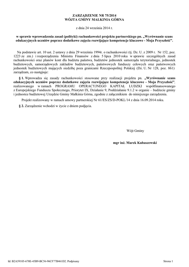 ZARZĄDZENIE NR 75/2014 WÓJTA GMINY MAŁKINIA GÓRNA z dnia 24 września 2014 r. w sprawie wprowadzenia zasad (polityki) rachunkowości projektu partnerskiego pn. „Wyrównanie szans edukacyjnych uczniów poprzez dodatkowe zajęcia rozwijające kompetencje kluczowe - Moja Przyszłość”. Na podstawie art. 10 ust. 2 ustawy z dnia 29 września 1994r. o rachunkowości (tj. Dz. U. z 2009 r. Nr 152, poz. 1223 ze zm.) i rozporządzenia Ministra Finansów z dnia 5 lipca 2010 roku w sprawie szczególnych zasad rachunkowości oraz planów kont dla budżetu państwa, budżetów jednostek samorządu terytorialnego, jednostek budżetowych, samorządowych zakładów budżetowych, państwowych funduszy celowych oraz państwowych jednostek budżetowych mających siedzibę poza granicami Rzeczpospolitej Polskiej (Dz. U. Nr 128, poz. 861) zarządzam, co następuje: § 1. Wprowadza się zasady rachunkowości stosowane przy realizacji projektu pn. „Wyrównanie szans edukacyjnych uczniów poprzez dodatkowe zajęcia rozwijające kompetencje kluczowe - Moja Przyszłość”, realizowanego w ramach PROGRAMU OPERACYJNEGO KAPITAŁ LUDZKI współfinansowanego z Europejskiego Funduszu Społecznego, Priorytet IX, Działanie 9, Poddziałanie 9.1.2 w organie – budżecie gminy i jednostce budżetowej Urzędzie Gminy Małkinia Górna, zgodnie z załącznikiem do niniejszego zarządzenia. Projekt realizowany w ramach umowy partnerskiej Nr 61/ES/ZS/D-POKL/14 z dnia 16.09.2014 roku. § 2. Zarządzenie wchodzi w życie z dniem podjęcia. Wójt Gminy mgr inż. Marek Kubaszewski Id: B2A59105-678E-45B9-BC56-96CF77B461D2. Podpisany Strona 1 Załącznik do zarządzenia nr 75/2014 Wójta Gminy Małkinia Górna z dnia 24.09.2014 r. POLITYKA RACHUNKOWOŚCI dla Projektu „Wyrównanie szans edukacyjnych uczniów poprzez dodatkowe zajęcia rozwijające kompetencje kluczowe - Moja Przyszłość ” w organie – budżecie gminy i jednostce budżetowej Urzędzie Gminy Małkinia Górna. I. Podstawę prowadzenia rachunkowości w w organie – budżecie gminy i jednostce budżetowej Urzędzie Gminy Małkinia Górna stanowi dokumentacja przyjętych zasad opracowanych na podstawie : 1. art.10 i art.13 ustawy z dnia 29 września 1994 roku o rachunkowości (tekst jednolity: Dz. U. z 2009 r. Nr 152 poz. 1223 ze zm.) 2. Ustawie o finansach publicznych z dnia 27 sierpnia 2009 r. ( Dz. U Nr 157, poz. 1240) , Rozporządzeniu Ministra Finansów z dnia 5 lipca 2010 r. w sprawie szczególnych zasad rachunkowości oraz planów kont dla budżetu państwa, budżetów jednostek samorządu terytorialnego, jednostek budżetowych, samorządowych zakładów budżetowych, państwowych funduszy celowych oraz państwowych jednostek budżetowych mających siedzibę poza granicami Rzeczypospolitej Polskiej ( Dz. U. z 2010r, Nr 128, poz. 861). 3. Rozporządzeniu Ministra Finansów z dnia 2 marca 2010 r. w sprawie szczegółowej klasyfikacji dochodów, wydatków, przychodów i rozchodów oraz środków pochodzących ze źródeł zagranicznych ( Dz. U. Nr 38, poz.207 ). Celem prowadzenia rachunkowości jest wierne i rzetelne przedstawienie sytuacji majątkowej i finansowej Projektu współfinansowanego ze środków Europejskiego Funduszu . Cel, zadanie, a zarazem znaczenie rachunkowości jest wyrażone w zasadzie jasnego i rzetelnego obrazu (art. 4, ust. 1 ustawy o rachunkowości) wykorzystania i zarządzania funduszami pomocowymi oraz uzyskami w wyniku realizacji programu pomocowego efektami. Dla osiągnięcia tych celów stosuje się również: - zasadę istotności wyrażoną w art. 4, ust. 4 ustawy o rachunkowości stanowiącą, że stosuje się uproszczenia , jeżeli nie wywierają one istotnie ujemnego wpływu na realizację zasady jasnego, rzetelnego i wiernego przedstawienia sytuacji finansowej, - zasadę kasy wyrażoną w art.40, ust. 2 pkt 1 ustawy o finansach publicznych , która stanowi, iż dochody i wydatki budżetu są ujmowane w terminie ich zapłaty (rachunkowości budżetu), - zasadę memoriału wyrażonej w art. 6, ust.1 ustawy o rachunkowości , która stanowi, że koszty i przychody ujmowane są w danym roku obrotowym, niezależnie od ich zapłaty (w rachunkowości jednostki), - zasadę ciągłości zawartą w art. 5, ust. 1 ustawy o rachunkowości polegającą na tym, że zasady przyjęte stosuje się w sposób ciągły, - zasadę ostrożnej wyceny zawartej w art. 7 ust.1 ustawy o rachunkowości stanowiącej , że poszczególne składniki aktywów i pasywów wycenia się według cen nabycia zachowując wytyczne z memorandum finansowym, - zasadę współmierności zawartej w art. 6, ust. 2 ustawy o rachunkowości wyrażającej, że Id: B2A59105-678E-45B9-BC56-96CF77B461D2. Podpisany Strona 2 zachowuje się zapewnienie współmierności przychodów i związanych z nimi kosztów danego okresu sprawozdawczego, - zasadę przewagi materii nad formą wyrażoną w art. 4,ust. 2 ustawy o rachunkowości, oznaczającą iż zdarzenia, w tym operacje gospodarcze, ujmowane są w księgach rachunkowych i wykazywane są w sprawozdaniach finansowych zgodnie z ich treścią ekonomiczną. II. Zakres ustaleń objętych zakładowym planem kont obejmuje: Ustala się następujące techniki dokumentowania zapisów księgowych: 1. Rokiem obrotowym jest rok kalendarzowy, który biegnie od l stycznia do 31 grudnia. 2. Okresem sprawozdawczym - rozliczeniowym jest kolejno: miesiąc , kwartał, półrocze i rok w zależności od wymagań ustawowych i umownych . 3. Księgi rachunkowe prowadzi się w języku polskim. 4. Podstawę zapisów w księgach rachunkowych stanowią dowody księgowe stwierdzające dokonanie operacji gospodarczej, zwane dowodami źródłowymi . Zapisy zdarzeń gospodarczych w księgach rachunkowych ujmuje się chronologicznie. 5. Wykazane w księgach rachunkowych na dzień ich zamknięcia stany aktywów i pasywów, ujmuje się w tej samej wysokości w bilansie otwarcia następnego roku obrotowego. 6. Księgi rachunkowe prowadzi się w siedzibie