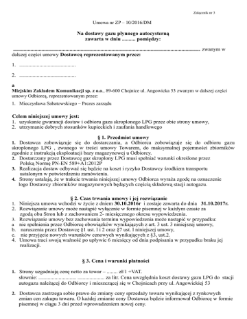 Załącznik nr 3 Umowa nr ZP – 10/2016/DM Na dostawy gazu płynnego autocysterną zawarta w dniu .......... pomiędzy: ........................................................................................................................................... zwanym w dalszej części umowy Dostawcą reprezentowanym przez: 1. .......................................... 2. .......................................... a Miejskim Zakładem Komunikacji sp. z o.o., 89-600 Chojnice ul. Angowicka 53 zwanym w dalszej części umowy Odbiorcą, reprezentowanym przez: 1. Mieczysława Sabatowskiego – Prezes zarządu Celem niniejszej umowy jest: 1. uzyskanie gwarancji dostaw i odbioru gazu skroplonego LPG przez obie strony umowy, 2. utrzymanie dobrych stosunków kupieckich i zaufania handlowego § 1. Przedmiot umowy 1. Dostawca zobowiązuje się do dostarczania, a Odbiorca zobowiązuje się do odbioru gazu skroplonego LPG , zwanego w treści umowy Towarem, do maksymalnej pojemności zbiorników zgodnie z instrukcją eksploatacji bazy magazynowej u Odbiorcy. 2. Dostarczany przez Dostawcę gaz skroplony LPG musi spełniać warunki określone przez Polską Normę PN-EN 589+A1:2012P 3. Realizacja dostaw odbywać się będzie na koszt i ryzyko Dostawcy środkiem transportu ustalonym w potwierdzeniu zamówienia. 4. Strony ustalają, że w trakcie trwania niniejszej umowy Odbiorca wyraża zgodę na oznaczenie logo Dostawcy zbiorników magazynowych będących częścią składową stacji autogazu. § 2. Czas trwania umowy i jej rozwiązanie 1. Niniejsza umowa wchodzi w życie z dniem 30.10.2016r i zostaje zawarta do dnia 31.10.2017r. 2. Rozwiązanie umowy może nastąpić wyłącznie w formie pisemnej w każdym czasie za zgodą obu Stron lub z zachowaniem 2- miesięcznego okresu wypowiedzenia. 3. Rozwiązanie umowy bez zachowania terminu wypowiedzenia może nastąpić w przypadku: a nie spełnienia przez Odbiorcę obowiązków wynikających z art. 3 ust. 3 niniejszej umowy, b. naruszenia przez Dostawcę §1 ust. l i 2 oraz §7 ust. l niniejszej umowy, c. nie przyjęcie nowych warunków cenowych wynikających z §3, ust.2. 4. Umowa traci swoją ważność po upływie 6 miesięcy od dnia podpisania w przypadku braku jej realizacji. § 3. Cena i warunki płatności 1. Strony uzgadniają cenę netto za towar – ........ zł/1 +VAT. słownie: ............................ .................... za litr. Cena uwzględnia koszt dostawy gazu LPG do stacji autogazu należącej do Odbiorcy i mieszczącej się w Chojnicach przy ul. Angowickiej 53 2. Dostawca zastrzega sobie prawo do zmiany ceny sprzedaży towaru wynikającej z rynkowych zmian cen zakupu towaru. O każdej zmianie ceny Dostawca będzie informował Odbiorcę w formie pisemnej w ciągu 3 dni przed wprowadzeniem nowej ceny. 3. 4. 5. 6. 7. Zmiana ceny może nastąpić tylko w przypadku udokumentowanej zmiany cen u producenta oraz akceptacji przez zainteresowane strony. Cena kalkulowana będzie w oparciu o notowania cenowe hurtowych cen autogazu firmy ORLEN Paliwa, umieszczonych na stronie internetowej: www.orlenpaliwa.com.pl. Formuła według, której obliczana będzie cena autogazu kształtuje się następująco: od notowań z danego dnia firmy ORLEN Paliwa dla województwa pomorskiego odejmowany będzie stały upust w wysokości – .......... zł/l. Zapłata za dostarczony towar będzie następowała na podstawie faktur VAT wystawianych przez Dostawcę. Dostawca posiada nr NIP ........................ Strony ustalają następujący termin płatności w ciągu 21 dni od daty dostawy. Odbiorca zobowiązuje się do przekazywania należności za towar na następujące konto bankowe Dostawcy: .......................................................................................... W przypadku niedotrzymania terminu płatności Dostawca, oprócz naliczenia należnych ustawowych odsetek, ma prawo wstrzymać dostawy towaru do momentu uregulowania przez Odbiorcę należności finansowych lub zastosować rygor przedpłaty w wysokości gwarantującej spłatę zobowiązań Odbiorcy. Odbiorca jest podatnikiem podatku od towarów i usług i posiada nr NIP 555-000-64-76, upoważnia Dostawcę do wystawiania faktur VAT bez jego podpisu. Strony dopuszczają zastosowanie odpowiednich zabezpieczeń należności wynikających z realizacji niniejszej umowy według odrębnych uregulowań. Zabezpieczenie należności wynikających z niniejszej umowy oraz innych należności handlowych zostanie uregulowane przez strony w odrębnym trybie. § 4. Terminy i warunki dostaw 1. Dostawy towaru realizowane będą na żądanie Odbiorcy w terminie l dnia roboczego od daty zgłoszenia zamówienia Dostawcy. 2. Odbiorca zobowiązuje się do bieżącego kontrolowania stanu zapasu gazu skroplonego LPG w zbiornikach obsługiwanych przez Dostawcę. 3. Dostawca nie ponosi odpowiedzialności za opóźnienie w dostawie towaru wynikające z faktu: - złożenia zamówienia z opóźnieniem, - zaniedbania Odbiorcy w bieżącym kontrolowaniu stanu zapasu gazu skroplonego LPG w zbiornikach. § 5. Jakość towaru 1. Jakość towaru dostarczanego zgodnie z mniejszą umową musi spełniać Polską Normę dla gazu skroplonego (LPG) – PN-EN 589+A1:2012P 2. Jeśli jakość dostarczonego towaru nie odpowiada PN-EN 589+A1:2012P roszczenia co do jakości towaru mogą być zgłaszane Dostawcy w natychmiastowym terminie w formie pisemnej. 3. Roszczenia, zgłaszane w odniesieniu do oddzielnej partii towaru stanowią podstawę do wstrzymania następnych dostaw gazu do czasu pobrania próbek gazu. § 6. Siła wyższa 1. W przypadku powstania okoliczności, które stanowią przeszkodę dla całkowitego lub częściowego wykonania przez jakąkolwiek stronę zobowiązań wynikających z umowy, a mianowicie: pożaru, klęski żywiołowej lub innych przeszkód, wojny, działań wojennych o jakimkolwiek charakterze, blokady, a także innych okoliczności pozostających poza kontrolą stron, termin wykonania zobowiązań wyn