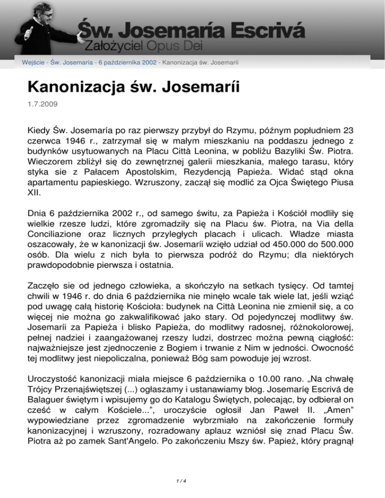 Wejście - Św. Josemaría - 6 października 2002 - Kanonizacja św. Josemaríi Kanonizacja św. Josemaríi 1.7.2009 Kiedy Św. Josemaría po raz pierwszy przybył do Rzymu, późnym popłudniem 23 czerwca 1946 r., zatrzymał się w małym mieszkaniu na poddaszu jednego z budynków usytuowanych na Placu Città Leonina, w pobliżu Bazyliki Św. Piotra. Wieczorem zbliżył się do zewnętrznej galerii mieszkania, małego tarasu, który styka sie z Pałacem Apostolskim, Rezydencją Papieża. Widać stąd okna apartamentu papieskiego. Wzruszony, zaczął się modlić za Ojca Świętego Piusa XII. Dnia 6 października 2002 r., od samego świtu, za Papieża i Kościół modliły się wielkie rzesze ludzi, które zgromadziły się na Placu św. Piotra, na Via della Conciliazione oraz licznych przyległych placach i ulicach. Władze miasta oszacowały, że w kanonizacji św. Josemaríi wzięło udział od 450.000 do 500.000 osób. Dla wielu z nich była to pierwsza podróż do Rzymu; dla niektórych prawdopodobnie pierwsza i ostatnia. Zaczęło sie od jednego człowieka, a skończyło na setkach tysięcy. Od tamtej chwili w 1946 r. do dnia 6 października nie minęło wcale tak wiele lat, jeśli wziąć pod uwagę całą historię Kościoła: budynek na Città Leonina nie zmienił się, a co więcej nie można go zakwalifikować jako stary. Od pojedynczej modlitwy św. Josemaríi za Papieża i blisko Papieża, do modlitwy radosnej, różnokolorowej, pełnej nadziei i zaangażowanej rzeszy ludzi, dostrzec można pewną ciągłość: najważniejsze jest zjednoczenie z Bogiem i trwanie z Nim w jedności. Owocność tej modlitwy jest niepoliczalna, ponieważ Bóg sam powoduje jej wzrost. Uroczystość kanonizacji miała miejsce 6 października o 10.00 rano. „Na chwałę Trójcy Przenajświętszej (...) ogłaszamy i ustanawiamy błog. Josemaríę Escrivá de Balaguer świętym i wpisujemy go do Katalogu Świętych, polecając, by odbierał on cześć w całym Kościele...”, uroczyście ogłosił Jan Paweł II. „Amen” wypowiedziane przez zgromadzenie wybrzmiało na zakończenie formuły kanonizacyjnej i wzruszony, rozradowany aplauz wzniósł się znad Placu Św. Piotra aż po zamek Sant'Angelo. Po zakończeniu Mszy św. Papież, który pragnął 1/4 pozdrowić uczestników kanonizacji, przejechał papamobile w towarzystwie Prałata Opus Dei przez Plac i Via della Conciliazione. Podczas tego przejazdu dziesiątki małych dzieci otrzymały od Ojca Świętego błogosławieństwo i pocałunek w czoło. Dnia 7 października rano „ w święto Najświętszej Maryi Panny Różańcowej “ Ojciec Święty przyjął na audiencji uczestników kanonizacji. Jan Paweł II odniósł się w swym przemówieniu do bezwarunkowej postawy służby wszystkim duszom, jakiej przykład dał nowy Święty, “ta postawa służby widoczna jest w jego oddaniu się posłudze kapłańskiej oraz w wielkoduszności, z której zrodziło się tak wiele dzieł na rzecz ewangelizacji oraz poprawy warunków życia najuboższych”. Biskup Javier Echevarría, Prałat Opus Dei, odprawił Mszę świętą dziękczynną na tym samym Placu św. Piotra. Na zakończenie audiencji Patriarcha Teoctist, głowa rumuńskiego kościoła prawosławnego, oficjalnie pozdrowił Ojca Świętego. Uczestnicy audiencji poprzez wielokrotne oklaski wyrazili miłość tak wielu katolików z całego świata oraz ich wspólne pragnienie jedności. Msze św. Dziękczynne W dniach 8 i 9 października, w wielu bazylikach i kościołach Rzymu, miały miejsce Msze św. dziękczynne w 18 językach: angielskim, arabskim, czeskim, chińskim, fińskim, francuskim, hiszpańskim, holenderskim, indonezyjskim, japońskim, litewskim, łacińskim, niemieckim, polskim, portugalskim, szwedzkim, węgierskim i włoskim. Wielu biskupów zwracało uwagę na uniwersalność myśli głoszonej przez nowego świętego. Tak więc wyrażali swą radość, że św. Josemaría Escrivá został włączony w poczet świętych, stając się tym samym dziedzictwem całego Kościoła. Około 200 wiernych przybyłych z Hongkongu uczestniczyło we Mszy św. sprawowanej przez ks. Josepha Ti-Kang, arcybiskupa Taipei (Tajwan), która miała miejsce w kościele San Girolamo della Caritŕ. Mówiąc o życiu nowego świętego, abp Ti-Kang podkreślił, że “Miał on Daleki Wschód w swym sercu od najwcześniejszej młodości”. Ponadto przypomniał, że wartości pracy i miłości do rodziny głoszone przez św. Josemaríę są wartościami głęboko zakorzenionymi w kulturze chińskiej. Bazylika Trinitŕ dei Monti stała się miejscem celebracji Mszy świętej dziękczynnej w obrządku maronickim. Mszę świętą koncelebrowali abp Paul Youssef Matar z Bejrutu i abp Bechara Rai z Byblos (Liban). Na zakończenie uroczystości abp 2/4 Matar poprosił nowego świętego o łaskę “uświęcenia życia naszego i wszystkich ludzi”. Abp Byblos podkreślił, że słowo głoszone przez założyciela Opus Dei, powszechne powołanie do świętości, nie jest wezwaniem skierowanym “wyłącznie do nielicznych wybrańców”, lecz do całego świata. Msza św. dziękczynna w języku holenderskim odbyła się w bazylice Sant’Apollinare i przewodniczył jej nuncjusz papieski w Holandii, bp François Bacqué. Ponad 9.000 osób wzięło udział w uroczystości, jaka miała miejsce w bazylice Św. Pawła za Murami, dla pielgrzymów przybyłych z Hiszpanii. Mszy św. przewodniczył kardynał Madrytu Antonio María Rouco Varela wraz z abp Toledo i prymasem Hiszpanii Francisco Álvarez Martínez. Msza św. była koncelebrowana przez ok. trzydziestu arcybiskupów i biskupów oraz prawie stu kapłanów. W swej homilii kard. Rouco Varela podkreślił, że św. Josemaría był świętym Hiszpanem z uniwersalną duszą. Kardynał Poupard, przewodniczący Papieskiej Rady ds Kultury, przewodniczył jednej ze Mszy św. w języku francuskim w bazylice Santa Maria in Trastevere. Kardynał wyjaśnił, że wezwanie d
