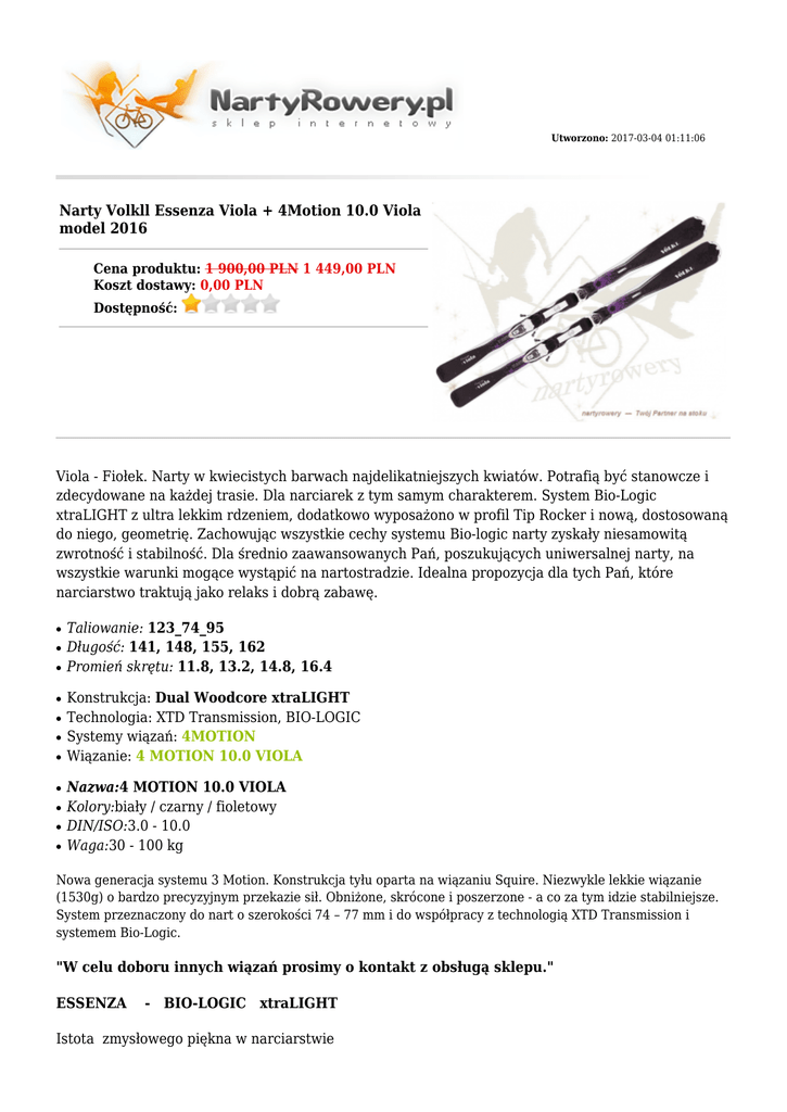 Utworzono: 2017-03-04 01:11:06 Narty Volkll Essenza Viola + 4Motion 10.0 Viola model 2016 Cena produktu: 1 900,00 PLN 1 449,00 PLN Koszt dostawy: 0,00 PLN Dostępność: Viola - Fiołek. Narty w kwiecistych barwach najdelikatniejszych kwiatów. Potrafią być stanowcze i zdecydowane na każdej trasie. Dla narciarek z tym samym charakterem. System Bio-Logic xtraLIGHT z ultra lekkim rdzeniem, dodatkowo wyposażono w profil Tip Rocker i nową, dostosowaną do niego, geometrię. Zachowując wszystkie cechy systemu Bio-logic narty zyskały niesamowitą zwrotność i stabilność. Dla średnio zaawansowanych Pań, poszukujących uniwersalnej narty, na wszystkie warunki mogące wystąpić na nartostradzie. Idealna propozycja dla tych Pań, które narciarstwo traktują jako relaks i dobrą zabawę. ● ● ● ● ● ● ● ● ● ● ● Taliowanie: 123_74_95 Długość: 141, 148, 155, 162 Promień skrętu: 11.8, 13.2, 14.8, 16.4 Konstrukcja: Dual Woodcore xtraLIGHT Technologia: XTD Transmission, BIO-LOGIC Systemy wiązań: 4MOTION Wiązanie: 4 MOTION 10.0 VIOLA Nazwa:4 MOTION 10.0 VIOLA Kolory:biały / czarny / fioletowy DIN/ISO:3.0 - 10.0 Waga:30 - 100 kg Nowa generacja systemu 3 Motion. Konstrukcja tyłu oparta na wiązaniu Squire. Niezwykle lekkie wiązanie (1530g) o bardzo precyzyjnym przekazie sił. Obniżone, skrócone i poszerzone - a co za tym idzie stabilniejsze. System przeznaczony do nart o szerokości 74 – 77 mm i do współpracy z technologią XTD Transmission i systemem Bio-Logic. "W celu doboru innych wiązań prosimy o kontakt z obsługą sklepu." ESSENZA - BIO-LOGIC xtraLIGHT Istota zmysłowego piękna w narciarstwie Nowa, wspaniała linia dla Pań. System Bio-Logic xtraLIGHT z ultra lekkim rdzeniem, dodatkowo wyposażono w profil Tip Rocker i nową, dostosowaną do niego, geometrię. Zachowując wszystkie cechy systemu Bio-logic narty zyskały niesamowitą zwrotność i stabilność. Większa dynamika jazdy, mniejsze zmęczenie, łatwiejsze skręty, nieograniczona radość z jazdy i lepsze zabezpieczenie przed kontuzjami – oto esencja systemu BIO-LOGIC. Wszystkie te elementy tworzą niezwykły konsonans w nowej linii nart Völkl dla kobiet – ESSENZA. Projektując nową linię, konstruktorzy korzystali z doświadczeń zdobytych przy pracy nad modelami z linii VWerks, przy której głównymi celami było osiągnięcie najniższej wagi, stosując najwyższej jakości nowoczesne materiały przy najwyższej jakości wykonania. Dzięki temu, w porównaniu z linią Attiva, otrzymano narty szersze, a mimo to lżejsze. Zastosowanie nowej geometrii umożliwiło wprowadzenie profilu Tip Rocker, przy zachowaniu wszystkich elementów systemu BIO-LOGIC. Firma Völkl jeszcze raz udowodniła, że technologia Rocker nie polega wyłącznie na wygięciu nart, lecz stanowi niezwykle trudny proces w ich tworzeniu. Do każdego modelu linii ESSENZA wprowadzono Tip Rocker i, uwzględniając ten profil, bardzo starannie dobrano geometrię. Dzięki czemu, w połączeniu z ultra lekkim rdzeniem, uzyskano niebywale harmonijną całość. Nowe modele z linii ESSENZA są zwrotne, lekkie i stabilne. Od modelu Charisma do modelu Adora, nowa linia swoim spektrum obejmuje wszystkie, nawet najbardziej wysublimowane potrzeby nowoczesnych i dynamicznych, współczesnych narciarek. Dopełnieniem, jest wspaniała szata graficzna symbolizująca wszystkie, najwspanialsze „aromaty” świata. Płeć Zaawansowanie Damskie Amatorskie, Średniozaawansowane Rdzeń Dual Woodcore xTRA Light Kształt Tip Rocker Kolekcja Producent Długości Taliowanie (mm) zima 2015/16 Volkl 155 cm, 162 cm, 148 cm, 141 cm 123_74_95 Promień skrętu (m) 11.8, 13.2, 14.8, 16.4 Struktura XTD Transmission, BIO-LOGIC Wiązanie 4Motion 10.0 Viola Adres: http://nartyrowery.pl/ Telefon: 34 365 66 09 Email: [email protected] Gadu-Gadu: Skype: