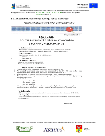 Projekt współfinansowany przez Unię Europejską w ramach Europejskiego Funduszu Społecznego Przygotowanie i wdrożenie PRAKTYK STUDENCKICH w mieście Białystok bialystok.epraktyka.eu 5.2. 2 Regulamin „Rodzinnego Turnieju Tenisa Stołowego” SZKOŁA PODSTAWOWA NR 26 w BIAŁYMSTOKU Białystok; 22.02.2011 r. REGULAMIN RODZINNY TURNIEJ TENISA STOŁOWEGO o PUCHAR DYREKTORA SP 26 I. Cel zawodów: Wzbogacenie programu wychowania fizycznego i zajęć pozalekcyjnych w szkole, upowszechnianie konkursu „ Sport dla Wszystkich ”, integracja środowiska. II. Organizator: Organizatorem zawodów jest SP 26 w Białymstoku dyrekcja nauczyciele wf - III. Termin i miejsce: 12 marca 2011r. (sobota) godzina 9.00 Sala gimnastyczna SP 26 w Białymstoku IV. Reguły ogólne i uczestnictwo: 1. 2. 3. 4. Turniej odbywa się w konkurencji drużynowej systemem pucharowym. W zawodach uczestniczyć mogą uczniowie naszej szkoły z klas IV – VI oraz osoby z nimi spokrewnione (brat, siostra, mama, tata, ciocia, wujek, babcia, dziadek itd.) Drużyna składa się z dwóch osób: ucznia naszej szkoły i osoby z nim spokrewnionej. W wyniku losowania będą ustalone pary drużyn. Mecze pomiędzy drużynami odbywają się według następującego klucza: 1 gra dziecko – dziecko 2 gra kuzyn - kuzyn 3 gra gra podwójna O wyniku meczu decyduje suma wyników poszczególnych gier. Mecze rozgrywane są do momentu zdobycia przez jedną z drużyn 2 punktów. Mecz rozgrywany jest na jednym stole. V. Zgłoszenia: Zgłoszenia przyjmowane są w sekretariacie szkoły, lub u nauczycieli wf do dnia 11.03. 2011r. VI. Nagrody: Zwycięzcy otrzymują pamiątkowe dyplomy, a najlepsze drużyny puchary ufundowany przez dyrektora szkoły. Organizator Biuro projektu: Wyższa Szkoła Wychowania Fizycznego i Turystyki w Białymstoku, ul. Mickiewicza 49, tel. 85 713 15 91, e-mail: [email protected] Miasto Białystok
