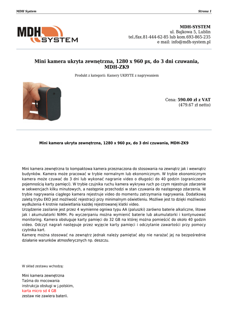 MDH System Strona 1 MDH-SYSTEM ul. Bajkowa 5, Lublin tel./fax.81-444-62-85 lub kom.693-865-235 e mail: [email protected] Mini kamera ukryta zewnętrzna, 1280 x 960 px, do 3 dni czuwania, MDH-ZK9 Produkt z kategorii: Kamery UKRYTE z nagrywaniem Cena: 590.00 zł z VAT (479.67 zł netto) Mini kamera ukryta zewnętrzna, 1280 x 960 px, do 3 dni czuwania, MDH-ZK9 Mini kamera zewnętrzna to kompaktowa kamera przeznaczona do stosowania na zewnątrz jak i wewnątrz budynków. Kamera może pracować w trybie normalnym lub ekonomicznym. W trybie ekonomicznym kamera może czuwać do 3 dni lub wykonać nagranie video o długości do 40 godzin (ograniczenie pojemnością karty pamięci). W trybie czujnika ruchu kamera wykrywa ruch po czym rejestruje zdarzenie w sekwencjach kilku minutowych, a następnie przechodzi w stan czuwania do następnego zdarzenia. W trybie nagrywania ciągłego kamera rejestruje video do momentu zatrzymania nagrywania. Dodatkową zaletą trybu EKO jest możliwość rejestracji przy minimalnym oświetleniu. Możliwe jest to dzięki możliwości wydłużenia 4 krotnie naświetlania każdej rejestrowanej klatki video. Urządzenie zasilanie jest przez 4 wymienne ogniwa typu AA (paluszki) zarówno baterie alkaliczne, litowe jak i akumulatorki NiMH. Po wyczerpaniu można wymienić baterie lub akumulatorki i kontynuować monitoring. Kamera obsługuje karty pamięci do 32 GB na której można pomieścić do około 40 godzin video. Odczyt nagrań następuje przez wyjęcie karty pamięci i odczytanie zawartości przy pomocy czytnika kart. Kamerę można stosować na zewnątrz jednak należy pamiętać aby nie narażać jej na bezpośrednie działanie warunków atmosferycznych np. deszczu. W skład zestawu wchodzą: Mini kamera zewnętrzna Taśma do mocowania instrukcja obsługi w j.polskim, karta micro sd 4 GB zestaw nie zawiera baterii. MDH System Strona 2 Specyfikacja: Rozdzielczość video 1280x960, kolor Format pliku video AVI Tryb normalny - 30fps Tryb Eko - 8 fps Bit rate Tryb normalny - 6-9 Mb/s Tryb Eko - 1,5- 2,5 Mb/s Wyświetlanie daty oraz godziny Tak - w trybie normalnym Nie - w trybie Eko Tryb dzień-noc (nagrywanie w ciemności) Nie W trybie EKO możliwa rejestracja przy słabym świetle Tryb aparatu Tak Mikrofon Tak – rejestracja dźwięku wraz z obrazem Tryb dyktafonu (rejestracja samego dźwięku) Tak Czułość mikrofonu obszar do 40 m2 Wykrywanie ruchu Tak Rodzaj wykrywania ruchu Motion detection, zasięg w zależności od wielkości poruszającego się obiektu nawet do kilkudziesięciu metrów Tryb rejestracji video Nagrywanie ciągłe lub z czujnikiem ruchu Nagrywanie w pętli Nie MDH System Strona 3 Czas pracy Tryb normalny - czuwanie do 40 godzin lub 10 godzin nagrania video Tryb Eko - czuwanie 3 doby lub 40 godzin nagrania video. Zasilanie 4 x ogniwa typu AA, baterie alkaliczne, litowe, akumulatorki NiMH ( baterie należy dokupic oddzielnie) Pamięć Max karta microSD do 32 GB ( w komplecie karta 4 GB) Złącza microSD Odczyt danych czytnik kart System operacyjny WINDOWS98/98SE/ME/2000/XP/VISTA/7/8/MAC OS/ LINUX system - odtwarzanie video Temperatura pracy - 20 stopni C do + 50 stopni C Ochrona IP44 wymiary wysokość 75 mm, szerokość 36 mm, grubość 47 mm waga 45 g - bez baterii Zapraszamy do naszego sklepu internetowego www.mdh-system.pl Dokument wygenerowany 2017-03-04 o godzinie 01:11
