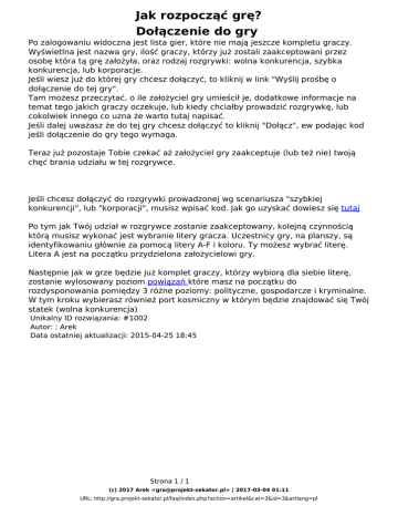 Jak rozpocząć grę? Dołączenie do gry Po zalogowaniu widoczna jest lista gier, które nie mają jeszcze kompletu graczy. Wyświetlna jest nazwa gry, ilość graczy, którzy już zostali zaakceptowani przez osobę która tą grę założyła, oraz rodzaj rozgrywki: wolna konkurencja, szybka konkurencja, lub korporacje. Jeśli wiesz już do której gry chcesz dołączyć, to kliknij w link "Wyślij prośbę o dołączenie do tej gry". Tam możesz przeczytać, o ile założyciel gry umieścił je, dodatkowe informacje na temat tego jakich graczy oczekuje, lub kiedy chciałby prowadzić rozgrywkę, lub cokolwiek innego co uzna że warto tutaj napisać. Jeśli dalej uważasz że do tej gry chcesz dołączyć to kliknij "Dołącz", ew podając kod jeśli dołączenie do gry tego wymaga. Teraz już pozostaje Tobie czekać aż założyciel gry zaakceptuje (lub też nie) twoją chęć brania udziału w tej rozgrywce. Jeśli chcesz dołączyć do rozgrywki prowadzonej wg scenariusza "szybkiej konkurencji", lub "korporacji", musisz wpisać kod. Jak go uzyskać dowiesz się tutaj Po tym jak Twój udział w rozgrywce zostanie zaakceptowany, kolejną czynnością którą musisz wykonać jest wybranie litery gracza. Uczestnicy gry, na planszy, są identyfikowaniu głównie za pomocą litery A-F i koloru. Ty możesz wybrać literę. Litera A jest na początku przydzielona założycielowi gry. Następnie jak w grze będzie już komplet graczy, którzy wybiorą dla siebie literę, zostanie wylosowany poziom powiązań które masz na początku do rozdysponowania pomiędzy 3 różne poziomy: polityczne, gospodarcze i kryminalne. W tym kroku wybierasz również port kosmiczny w którym będzie znajdować się Twój statek (wolna konkurencja) Unikalny ID rozwiązania: #1002 Autor: : Arek Data ostatniej aktualizacji: 2015-04-25 18:45 Strona 1 / 1 (c) 2017 Arek <[email protected]> | 2017-03-04 01:11 URL: http://gra.projekt-sekator.pl/faq/index.php?action=artikel&cat=3&id=3&artlang=pl Powered by TCPDF (www.tcpdf.org)