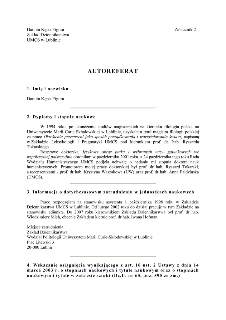 Danuta Kępa-Figura Zakład Dziennikarstwa UMCS w Lublinie Załącznik 2 AUTOREFERAT 1. Imię i nazwisko Danuta Kępa-Figura 2. Dyplomy i stopnie naukowe W 1994 roku, po ukończeniu studiów magisterskich na kierunku filologia polska na Uniwersytecie Marii Curie Skłodowskiej w Lublinie, uzyskałam tytuł magistra filologii polskiej za pracę Określenia przestrzeni jako sposób porządkowania i wartościowania świata, napisaną w Zakładzie Leksykologii i Pragmatyki UMCS pod kierunkiem prof. dr. hab. Ryszarda Tokarskiego. Rozprawę doktorską Językowy obraz ptaka i wybranych nazw gatunkowych we współczesnej polszczyźnie obroniłam w październiku 2001 roku, a 24 października tego roku Rada Wydziału Humanistycznego UMCS podjęła uchwałę o nadaniu mi stopnia doktora nauk humanistycznych. Promotorem mojej pracy doktorskiej był prof. dr hab. Ryszard Tokarski, a recenzentkami - prof. dr hab. Krystyna Waszakowa (UW) oraz prof. dr hab. Anna Pajdzińska (UMCS). 3. Informacje o dotychczasowym zatrudnieniu w jednostkach naukowych Pracę rozpoczęłam na stanowisku asystenta 1 października 1998 roku w Zakładzie Dziennikarstwa UMCS w Lublinie. Od lutego 2002 roku do dzisiaj pracuję w tym Zakładzie na stanowisku adiunkta. Do 2007 roku kierownikiem Zakładu Dziennikarstwa był prof. dr hab. Włodzimierz Mich, obecnie Zakładem kieruje prof. dr hab. Iwona Hofman. Miejsce zatrudnienia: Zakład Dziennikarstwa Wydział Politologii Uniwersytetu Marii Curie-Skłodowskiej w Lublinie Plac Litewski 3 20-080 Lublin 4. Wskazanie osiągnięcia wynikającego z art. 16 ust. 2 U stawy z dnia 14 marca 2003 r. o stopniach naukowych i tytule naukowym oraz o stopniach naukowym i tytule w zakresie sztuki (Dz.U. nr 65, poz. 595 ze zm.) a) Cykl artykułów naukowych opatrzony tytu łem Intencjonalność przekazu medialnego (ujęcie językoznawcze) b) Artykuły wchodzące w skład cyklu (w kolejności uwzględniającej problemowe ujęcie zagadnienia, zgodnie ze sposobem omówienia zaproponowanym w punkcie c) autoreferatu) 1. Relatywizm języka – pułapka bezczynności czy szansa aktywności poznawczej, [w:] Relatywizm w języku i kulturze, red. A. Pajdzińska, R. Tokarski, Wydawnictwo UMCS, Lublin 2010, s. 217-236. 2. Świat w informacji dziennikarskiej – informacja czy interpretacja. Analiza językoznawcza, „Zeszyty Prasoznawcze” 2013, z. 3, s. 350-363. 3. Gatunek mowy „informacja” – czy to możliwe?, [w:] Komunikacja. Tradycja i innowacje, red. M. Karwatowska i A. Siwiec, GRASP Drukarnia, Chełm 2013, s. 222-236. 4. Kulturowe aspekty gatunku mowy *„informacja”, [w:] Dialog kultur VII, red. O. Richterek, M. Půža, Wydawnictwo Garamon, Hrádec Kralové 2013, s. 104-110. 5. Narracja na płaszczyźnie werbalnej (na przykładzie przekazu medialnego), [w:] Narracyjność języka i kultury, t. 1, Literatura i media, red. D. Filar, D. Piekarczyk, Wydawnictwo UMCS, Lublin 2013, s. 167-184. 6. Gry językowe w mediach tradycyjnych i Internecie, [w:] Beiträge der Europäischen Slavistischen Linguistik (POLYSLAV) Band 10, red. B. Brehmer, V. Ždanowa, R. Zimny, Verlag Otto Sagner, München 2007, s. 65-70. 7. Gry językowe we współczesnej komunikacji medialnej – semantyczna i pragmatyczna analiza języka mediów, „Prace Językoznawcze Uniwersytetu WarmińskoMazurskiego” 2009, z. 11, s. 95-113. 8. Intencje (czy intencja) nadawców medialnych, czyli fatyczność współczesnej komunikacji medialnej, [w:] Współczesne media – status, aksjologia, funkcjonowanie, red. I. Hofman, D. Kępa-Figura, Wydawnictwo UMCS, Lublin 2009, s. 416-425. 9. Istota fatyczności a komunikacja medialna, [w:] Teorie komunikacji i mediów 3, red. M. Graszewicz i J. Jastrzębski, Oficyna Wydawnicza Atut – Wrocławskie Wydawnictwo Oświatowe, Wrocław 2010, s. 89-100. 10. Pragmatyka komunikacji medialnej – wybrane zagadnienia, [w:] Obraz človeka v jazyku, red. J. Vaňko, Wydawnictwo EQUILIBRIA, Košice-Nitra 2014, s. 266-281. 11. „Mówię, więc jestem” – problem intencjonalności w programach informacyjnych, [w:] Komunikowanie się w mediach elektronicznych – język, semiotyka, edukacja, red. M. Filiciak, G. Ptaszek, Wydawnictwa Akademickie i Profesjonalne, Warszawa 2009, s. 146-166. 12. Tusk-Kaczyński – językowe środki perswazji w kampanii wyborczej 2005, [w:] Media dawne i współczesne, t. 4, red. B. Kosmanowa, Wydawnictwo Naukowe INPD UAM, Poznań 2008, s. 151-162. 13. Unia Europejska oczami Radia Maryja (analiza Medioznawcze” 2003, numer 5 specjalny, s. 173-190. 2 językoznawcza), „Studia 14. OBCY pilnie poszukiwany, czyli „obcy” w języku polityków PiS – magia czy rzeczywistość, [w:] Język IV RP, red. M. Czerwiński, P. Nowak, Wydawnictwo UMCS, Lublin 2010, s. 223-239. 15. Performatywność komunikacji medialnej, [w:] Performatywne wymiary kultury, red. K. Skowronek, K. Leszczyńska, Wydawnictwo Libron, Kraków 2012, s. 243-257. 16. Co czynią wypowiedzi pełniące funkcję sprawczą?, „Prace Językoznawcze Uniwersytetu Warmińsko-Mazurskiego” 2012, z. 4, Olsztyn, s. 121-136. c) Omówienie pozycji wskazanej w punkcie a) I. Cel, przedmiot analizy. Inspiracje badawcze Celem cyklu było, po pierwsze, zbadanie struktury intencjonalnej przekazów należących do komunikacji medialnej, a po drugie – zastanowienie się nad istotą typów intencji uznanych za najważniejsze dla wypowiedzi mieszczących się w ramach tej komunikacji. Celem operacyjnym stało się w związku z tym zmierzenie się z przekonaniem o informacyjności komunikacji w ogóle, w tym z przekonaniem o informacyjności komunikacji medialnej. Zakreślenie celu badawczego wpłynęło na wybór przedmiotu analizy. Przedmiotem analiz były wypowiedzi umieszczone w przestrzeni komunikacji masowej zachodzącej za pośrednictwem mediów. W prowadzonych przeze mnie badaniach analizie poddane zostały zarówno wypowiedzi nadawców instytucjonalnie związanych z mediami, odpowiedzialnych za formalne ukształtowanie komuni