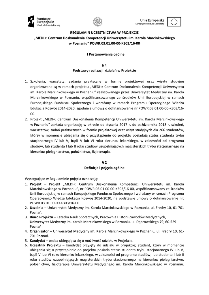 REGULAMIN UCZESTNICTWA W PROJEKCIE „MEDI+: Centrum Doskonalenia Kompetencji Uniwersytetu im. Karola Marcinkowskiego w Poznaniu” POWR.03.01.00-00-K303/16-00 I Postanowienia ogólne §1 Podstawy realizacji działań w Projekcie 1. Szkolenia, warsztaty, zadania praktyczne w formie projektowej oraz wizyty studyjne organizowane są w ramach projektu „MEDI+: Centrum Doskonalenia Kompetencji Uniwersytetu im. Karola Marcinkowskiego w Poznaniu” realizowanego przez Uniwersytet Medyczny im. Karola Marcinkowskiego w Poznaniu, współfinansowanego ze środków Unii Europejskiej w ramach Europejskiego Funduszu Społecznego i wdrażany w ramach Programu Operacyjnego Wiedza Edukacja Rozwój 2014-2020, zgodnie z umową o dofinansowanie nr POWR.03.01.00-00-K303/1600. 2. Projekt „MEDI+: Centrum Doskonalenia Kompetencji Uniwersytetu im. Karola Marcinkowskiego w Poznaniu” zakłada organizację w okresie od stycznia 2017 r. do października 2018 r. szkoleń, warsztatów, zadań praktycznych w formie projektowej oraz wizyt studyjnych dla 266 studentów, którzy w momencie ubiegania się o przystąpienie do projektu posiadają status studenta trybu stacjonarnego IV lub V, bądź V lub VI roku kierunku lekarskiego, w zależności od programu studiów; lub studenta I lub II roku studiów uzupełniających magisterskich trybu stacjonarnego na kierunku: pielęgniarstwo, położnictwo, fizjoterapia. §2 Definicje i pojęcia ogólne Występujące w Regulaminie pojęcia oznaczają: 1. Projekt – Projekt „MEDI+: Centrum Doskonalenia Kompetencji Uniwersytetu im. Karola Marcinkowskiego w Poznaniu”, nr POWR.03.01.00-00-K303/16-00, współfinansowany ze środków Unii Europejskiej w ramach Europejskiego Funduszu Społecznego i wdrażany w ramach Programu Operacyjnego Wiedza Edukacja Rozwój 2014-2020, na podstawie umowy o dofinansowanie nr: POWR.03.01.00-00-K303/16-00. 2. Uczelnia – Uniwersytet Medyczny im. Karola Marcinkowskiego w Poznaniu, ul. Fredry 10, 61-701 Poznań. 3. Biuro Projektu – Katedra Nauk Społecznych, Pracownia Historii Zawodów Medycznych, Uniwersytet Medyczny im. Karola Marcinkowskiego w Poznaniu, ul. Dąbrowskiego 79, 60-529 Poznań 4. Organizator – Uniwersytet Medyczny im. Karola Marcinkowskiego w Poznaniu, ul. Fredry 10, 61701 Poznań. 5. Kandydat – osoba ubiegająca się o możliwość udziału w Projekcie. 6. Uczestnik Projektu – kandydat przyjęty do udziału w projekcie; student, który w momencie ubiegania się o przystąpienie do projektu posiada status studenta trybu stacjonarnego IV lub V, bądź V lub VI roku kierunku lekarskiego, w zależności od programu studiów; lub studenta I lub II roku studiów uzupełniających magisterskich trybu stacjonarnego na kierunku: pielęgniarstwo, położnictwo, fizjoterapia Uniwersytetu Medycznego im. Karola Marcinkowskiego w Poznaniu. Uczestnik Projektu uzyskał pozytywną ocenę w procesie rekrutacyjnym i został zakwalifikowany do udziału w Projekcie oraz podpisał Umowę. 7. Opiekun Projektu – osoba wyznaczona do opieki merytorycznej nad Uczestnikami Projektu oraz sprawowania nadzoru nad organizacją i przebiegiem projektu. 8. Umowa uczestnictwa w Projekcie – umowa zawarta pomiędzy Organizatorem i Uczestnikiem Projektu, określająca szczegółowe zasady projektu. 9. Szkolenia – praktyczne formy kształcenia organizowane w ramach projektu z zakresu kompetencji zawodowych i komunikacyjnych. 10.Warsztaty z przedstawicielami przedsiębiorców - praktyczne formy kształcenia organizowane w ramach projektu z udziałem praktyków – prowadzonych przez ekspertów w dziedzinach rozwijanych w projekcie tj. pracowników naukowych UMP i innych szkół wyższych, praktyków, współpracujących na stałe z Wnioskodawcą. 11.Dokumenty aplikacyjne – komplet dokumentów niezbędnych do zarejestrowania Kandydata do udziału w Projekcie. 12.Student – osoba posiadająca status studenta Uniwersytetu Medycznego im. Karola Marcinkowskiego w Poznaniu. 13.Regulamin – niniejszy dokument określający cel i ogólne zasady realizacji działań w Projekcie. §3 Cel szkoleń, warsztatów, zadań praktycznych w formie projektowej oraz wizyt studyjnych w ramach Projektu Celem szkoleń, warsztatów, zadań praktycznych w formie projektowej oraz wizyt studyjnych w Projekcie jest przygotowanie studentów Uniwersytetu Medycznego im. Karola Marcinkowskiego w Poznaniu, do wejścia na rynek pracy poprzez nabycie unikatowej wiedzy i umiejętności oraz zdobycie doświadczenia zawodowego, poznanie branży oraz możliwości budowania kariery zawodowej. §4 Czas trwania Projektu Realizacja zadań w Projekcie przewidziana jest w okresie pomiędzy styczniem 2017 roku, a październikiem 2018 roku. §5 Organizacja szkoleń, warsztatów, zadań praktycznych w formie projektowej oraz wizyt studyjnych W ramach Projektu przewidziana jest organizacja szkoleń i warsztatów, zadań projektowych w formie praktycznej, prowadzonych przez ekspertów w dziedzinach rozwijanych w projekcie tj. pracowników naukowych UMP i innych szkół wyższych, praktyków, współpracujących na stałe z Uczelnią), oraz wyjazdów studyjnych w okresie pomiędzy styczniem 2017 roku, a październikiem 2018 roku. Uczestnik Projektu bierze udział w wybranych szkoleniach i warsztatach, w zadeklarowanych terminach z dostępnych. II. Zasady udziału w Projekcie §6 Zgłoszenie do Projektu Kandydat ubiegający się o udział w Projekcie musi spełniać poniższe warunki: a. być studentem trybu stacjonarnego IV lub V, bądź V lub VI roku kierunku lekarskiego, w zależności od programu studiów; być studentem I lub II roku studiów uzupełniających magisterskich trybu stacjonarnego na kierunku: pielęgniarstwo, położnictwo, fizjoterapia czyli posiadać status Studenta Uniwersytetu Medycznego im. Karola Marcinkowskiego w Poznaniu w chwili zgłoszenia się do Projektu; b. wypełnić Formularz Osobowy Uczestnika Projektu (załącznik nr 1) w terminie rekrutacji oraz podpisać Oświadcze