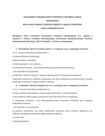 OGŁOSZENIE O ZMIANIE SKRÓTU PROSPEKTU INFORMACYJNEGO UNIFUNDUSZE SPECJALISTYCZNEGO FUNDUSZU INWESTYCYJNEGO OTWARTEGO Z DNIA 4 WRZEŚNIA 2012 R. Niniejszym, Union Investment Towarzystwo Funduszy Inwestycyjnych S.A., ogłasza o zmianach w Skrócie Prospektu Informacyjnego UniFundusze Specjalistycznego Funduszu Inwestycyjnego Otwartego („Skrót Prospektu”). Zmiany są następujące: 1) W Rozdziale I Skrótu Prospektu ppkt 8.1.2. otrzymuje nowe, następujące brzmienie: „8.1.2. Fundusz lokuje Aktywa Subfunduszu w: a) Instrumenty Rynku Pieniężnego, b) dłużne papiery wartościowe, c) kwity depozytowe i listy zastawne, d) Instrumenty Pochodne, w tym Niewystandaryzowane Instrumenty Pochodne, - pod warunkiem że są zbywalne, e) depozyty w bankach krajowych, bankach zagranicznych lub instytucjach kredytowych, f) jednostki uczestnictwa, certyfikaty inwestycyjne oraz tytuły uczestnictwa emitowane przez instytucje wspólnego inwestowania mające siedzibę za granicą.”; 2) w Rozdziale I Skrótu Prospektu pkt 14.1.2. otrzymuje nowe, następujące brzmienie: „14.1.2. Fundusz lokuje Aktywa Subfunduszu w: a) akcje, warranty subskrypcyjne, prawa do akcji, prawa poboru, kwity depozytowe, b) listy zastawne, dłużne papiery wartościowe oraz Instrumenty Rynku Pieniężnego, c) Instrumenty Pochodne, w tym Niewystandaryzowane Instrumenty Pochodne oraz Towarowe Instrumenty Pochodne, - pod warunkiem, że są zbywalne, d) jednostki uczestnictwa oraz tytuły uczestnictwa emitowane przez fundusze zagraniczne lub instytucje wspólnego inwestowania mające siedzibę za granicą, e) waluty obce, f) depozyty bankowe.” 3) w Rozdziale I Skrótu Prospektu, w pkt 14.1.5. otrzymuje nowe, następujące brzmienie: „14.1.5. Fundusz może dokonywać Krótkiej Sprzedaży papierów wartościowych wchodzących w skład Aktywów Subfunduszu. Łączna wartość Papierów Wartościowych będących przedmiotem Krótkiej Sprzedaży nie może przekroczyć 40% wartości Aktywów Subfunduszu. Łączna wartość papierów wartościowych jednego emitenta będących przedmiotem Krótkiej Sprzedaży nie może przekroczyć 20% wartości Aktywów Subfunduszu. Przy wyliczaniu limitów inwestycyjnych wynikających z Ustawy oraz z niniejszego rozdziału Statutu, uwzględnia się instrumenty finansowe będące przedmiotem Krótkiej Sprzedaży w odpowiednich limitach inwestycyjnych wynikających z przepisów Ustawy oraz z niniejszego rozdziału Statutu w ten sposób, że ustala się dla każdego instrumentu odrębnie różnicę między wartością instrumentów finansowych będących w portfelu inwestycyjnym Subfunduszu a wartością takich samych instrumentów finansowych będących przedmiotem Krótkiej Sprzedaży, a następnie wartość bezwzględną z tak otrzymanej wielkości traktuje jako zaangażowanie wynikające z określonego instrumentu.”; 4) w Rozdziale I Skrótu Prospektu, pkt 26.1.2. otrzymuje nowe, następujące brzmienie: ”26.1.2. Fundusz lokuje Aktywa Subfunduszu w: a) akcje, warranty subskrypcyjne, prawa do akcji, prawa poboru, kwity depozytowe – od 0% do 30% wartości Aktywów Subfunduszu, b) listy zastawne, dłużne papiery wartościowe oraz Instrumenty Rynku Pieniężnego – od 0% do 100% wartości Aktywów Subfunduszu, c) Instrumenty Pochodne, w tym Niewystandaryzowane Instrumenty Pochodne oraz Towarowe Instrumenty Pochodne – na zasadach określonych w ppkt 26.3. oraz w Statucie, - pod warunkiem, że są zbywalne, d) jednostki uczestnictwa oraz tytuły uczestnictwa emitowane przez fundusze zagraniczne lub instytucje wspólnego inwestowania mające siedzibę za granicą – od 0% do 50% wartości Aktywów Subfunduszu, e) waluty obce – od 0% do 100% wartości Aktywów Subfunduszu, f) depozyty bankowe – od 0% do 100% wartości Aktywów Subfunduszu.”; 5) w Rozdziale I Skrótu Prospektu pkt 26.1.5. otrzymuje nowe, następujące brzmienie: „26.1.5. Fundusz może dokonywać Krótkiej Sprzedaży papierów wartościowych wchodzących w skład Aktywów Subfunduszu. Łączna wartość Papierów Wartościowych będących przedmiotem Krótkiej Sprzedaży nie może przekroczyć 40% wartości Aktywów Subfunduszu. Łączna wartość papierów wartościowych jednego emitenta będących przedmiotem Krótkiej Sprzedaży nie może przekroczyć 20% wartości Aktywów Subfunduszu. Przy wyliczaniu limitów inwestycyjnych wynikających z Ustawy oraz z niniejszego rozdziału Statutu, uwzględnia się instrumenty finansowe będące przedmiotem Krótkiej Sprzedaży w odpowiednich limitach inwestycyjnych wynikających z przepisów Ustawy oraz z niniejszego rozdziału Statutu w ten sposób, że ustala się dla każdego instrumentu odrębnie różnicę między wartością instrumentów finansowych będących w portfelu inwestycyjnym Subfunduszu a wartością takich samych instrumentów finansowych będących przedmiotem Krótkiej Sprzedaży, a następnie wartość bezwzględną z tak otrzymanej wielkości traktuje jako zaangażowanie wynikające z określonego instrumentu.”; 6) w Rozdziale III Skrótu Prospektu pkt 5 otrzymuje nowe, następujące brzmienie: „5. Data i miejsce sporządzenia Skrótu Prospektu oraz data ostatniej aktualizacji Skrótu Prospektu Data sporządzenia ostatniego tekstu jednolitego skrótu prospektu informacyjnego: 4 września 2012 r.”. Pozostałe postanowienia Skrótu Prospektu pozostają bez zmian. Ww. zmiany w Skrócie Prospektu wchodzą w życie w dniu ukazania się niniejszego ogłoszenia.