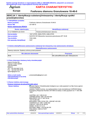 Spełnia wymogi określone w rozporządzeniu (WE) nr 1907/2006 (REACH), załącznik II, ze zmianami wprowadzonymi przez rozporządzenie Komisji (UE) 2015/830 KARTA CHARAKTERYSTYKI Fosforanu diamonu Granulowane 18-46-0 SEKCJA 1: Identyfikacja substancji/mieszaniny i identyfikacja spółki/ przedsiębiorstwa 1.1 Identyfikator produktu Nazwa produktu : Fosforanu diamonu Granulowane 18-46-0 Numer WE : 231-987-8 Numer rejestracyjny REACH Numer rejestracyjny Identyfikacja substancji 01-2119490974-22-XXXX Wodoroortofosforanem diamonu Typ produktu : 1527-27976; 3826-27976; 4466-27976 : NAWÓZ WE Mieszanka nawozowa granulowany NP 18-46 : Ciało stałe. Inne sposoby identyfikacji : DAP Kod produktu Opis produktu 1.2 Istotne zidentyfikowane zastosowania substancji lub mieszaniny oraz zastosowania odradzane Zidentyfikowane zastosowania Nawozy sztuczne. Systemy ochrony przed pożarem. Nie zalecane stosowanie Przyczyna Brak. Nie zakwalifikowane jako niebezpieczne 1.3 Dane dotyczące dostawcy karty charakterystyki Agrium Europe SA Avenue Louise 326/36 1050 Bruxelles Belgium Tel : +32 (0)2 646 70 00 Fax : +32 (0)2 646 68 60 [email protected] Adres e-mail osoby odpowiedzialnej za tą kartę charakterystyki : [email protected] 1.4 Numer telefonu alarmowego Krajowa instytucja doradcza/Ośrodek zatruć Numer telefonu : Arkusze Agrium Charakterystyki dostępne są w wielu językach na http://www.agrium. com/products/ae Lekarze, Centra trucizna, czy społeczeństwo może skontaktować AGRIUM Global Emergency Response Number 24/7/365 do służby w wielu językach na +1 303 389 1654 AUSTRIA +43 1 406 43 43 AZERBEJDŻAN +994 125 979 924 BIAŁORUŚ +375 17 287 00 92 +32 70 245 245 BUŁGARIA +359 2 9154 378; +359 887 435 325 CHORWACJA +358 1 2348 342 CZECHY +420 22 49 195 93 DANIA +45 82 12 12 12 ESTONIA 16662; +372 62 69 379 FINLANDIA +358 9 471977 FRANCJA Data wydania/Data aktualizacji : 8/24/2016 Data poprzedniego wydania : 9/22/2015 Wersja : 3.2 1/13 Spełnia wymogi określone w rozporządzeniu (WE) nr 1907/2006 (REACH), załącznik II, ze zmianami wprowadzonymi przez rozporządzenie Komisji (UE) 2015/830 Fosforanu diamonu Granulowane 18-46-0 SEKCJA 1: Identyfikacja substancji/mieszaniny i identyfikacja spółki/ przedsiębiorstwa Angers +33 (0) 2 41 48 21 21 Bordeaux +33 (0) 5 56 96 40 80 Lille 0800 59 59 59 (dzwoniący krajowe) Lyon +33 (0) 4 72 11 69 11 Marseille +33 (0) 4 91 75 25 25 Nancy +33 (0) 3 83 22 50 50 Paris +33 (0) 1 40 05 48 48 Rennes +33 (0) 2 99 59 22 22 Strasbourg +33 (0) 3 88 37 37 37 Toulouse +33 (0) 5 61 77 74 47 GRUZJA +995 99 53 33 20 NIEMCY Berlin +49 30 192 40 Bonn +49 228 192 40 Erfurt +49 361 730 730 Freiburg +49 761 192 40 Goettingen +49 551 192 40 Homburg (Saar) +49 6841 192 40 Mainz +49 6131 192 40 Monachium +49 89 192 40 GRECJA +30 21 07 79 37 77 WĘGRY +36 80 20 11 99 ISLANDIA +354 543 22 22 IRLANDIA +353 1 837 9964 (lekarzy) +353 1 809 2166 (publiczne) IZRAEL +972 4 854 19 00 WŁOCHY Bergamo +39 800 883 300 Firenze +39 55 794 7819 Foggia +39 881 732 326 Genua +39 10 563 62 45 Milan +39 02 6610 1029 Padova +39 49 827 50 78 Pawia +39 38 224 444 Rzym +39 06 305 43 43 Turyn +39 011 663 7637 KAZACHSTAN +7 3272 925 868 LITWA +370 5 236 20 52; +370 687 533 78 HOLANDIA +31 30 274 88 88 NORWEGIA +47 22 59 13 00 POLSKA Gdańsk +48 58 682 04 04 Kraków +48 12 411 99 99 ŁÓDŹ +48 42 63 14 724 Sosnowiec +48 32 266 11 45 Warszawa +48 22 619 66 54 Wrocław +48 71 343 30 08 PORTUGALIA 808 250 143 (dzwoniący krajowe) RUMUNIA +402 212 106 282 FEDERACJA ROSYJSKA Jekaterynburg +7 343 229 98 57 Moskwa +7 495 628 1687 Saint-Petersburg +7 921 757 3228 SERBIA +381 11 3608 440 SŁOWACJA +421 2 5477 4166 SŁOWENIA +386 41 635 500 HISZPANIA +34 91 562 0420 SZWECJA 112 (dzwoniący krajowe); +46 (0) 10 456 6700 SZWAJCARIA +41 44 251 51 51 (w Szwajcarii numerem 145) Byłej Jugosławii +38 923 147 635 TURCJA +90 0312 433 70 01 lub 0 800 314 7900 ZJEDNOCZONE KRÓLESTWO Belfast 844 892 0111 Birmingham 844 892 0111 Edynburg 844 892 0111 Data wydania/Data aktualizacji : 8/24/2016 Data poprzedniego wydania : 9/22/2015 Wersja : 3.2 2/13 Spełnia wymogi określone w rozporządzeniu (WE) nr 1907/2006 (REACH), załącznik II, ze zmianami wprowadzonymi przez rozporządzenie Komisji (UE) 2015/830 Fosforanu diamonu Granulowane 18-46-0 SEKCJA 1: Identyfikacja substancji/mieszaniny i identyfikacja spółki/ przedsiębiorstwa Newcastle Upon Tyne +44 191 2606182; +44 191 2606180 Penarth 844 892 0111 Dostawca Numer telefonu Godziny pracy : Agrium Europe SA PRZECIWAWARYJNY TELEFON LICZBY: Przewóz: 00-1-303-389-1654 Medyczny: 00-1-303-389-1654 : 24/7/365 Klasyfikacja według rozporządzenia (EC) Nr 1272/2008 [CLP/GHS] Nie sklasyfikowany. SEKCJA 2: Identyfikacja zagrożeń 2.1 Klasyfikacja substancji lub mieszaniny Definicja produktu : Substancja jednoskładnikowa Klasyfikacja według rozporządzenia (EC) Nr 1272/2008 [CLP/GHS] Nie sklasyfikowany. 2.2 Elementy oznakowania Piktogramy zagrożeń : Hasło ostrzegawcze : Brak hasła ostrzegawczego. Zwroty wskazujące rodzaj : Nie dotyczy. zagrożenia Zwroty wskazujące środki ostrożności Ogólne : Przed użyciem przeczytać etykietę. Chronić przed dziećmi. W razie konieczności zasięgnięcia porady lekarza należy pokazać pojemnik lub etykietę. Zapobieganie : Unikać uwolnienia do środowiska. : Zebrać wyciek. : Nie dotyczy. : Zawartość pojemnika jak i pojemnik utylizować zgodnie z lokalnymi, regionalnymi, narodowymi oraz międzynarodowymi przepisami. Specjalne wymagania dotyczące pakowania Pojemniki powinny być : Nie dotyczy. wyposażone w zamknięcia uniemożliwiające otworzenie ich przez dzieci Dotykowe ostrzeżenia : Nie dotyczy. przed niebezpieczeństwem Reagowanie Przechowywanie Usuwanie 2.3 Inne zagrożenia Inne zagrożenia nie odzwierciedlone w klasyfikacji Data wydania/Data aktualizacji : Niedostępne. : 8/24/2016 Data poprzedniego wydania : 9/22/2015 Wersja : 3.2 3/13 Spełnia wymogi określone w rozporządzeniu (WE) nr 1907/2006 (REACH), załącznik I