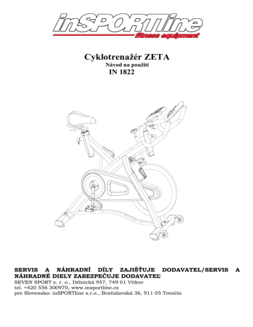 Cyklotrenažér ZETA ávod na použití I 1822 SERVIS A NÁHRADNÍ DÍLY ZAJIŠŤUJE DODAVATEL/SERVIS NÁHRADNÉ DIELY ZABEZPEČUJE DODAVATEĽ SEVEN SPORT s. r. o., Dělnická 957, 749 01 Vítkov tel. +420 556 300970, www.insportline.cz pre Slovensko: inSPORTline s.r.o., Bratislavská 36, 911 05 Trenčín A VAROVÁNÍ Cvičení může představovat zdravotní riziko. Poraďte se s lékařem před zahájením jakéhokoli cvičebního programu na tomto zařízení. Pokud máte pocit na omdlení nebo závratě, okamžitě přerušte užívání tohoto zařízení. Mohou nastat vážná zranění, pokud toto zařízení není správně smontované a používané. K vážným poraněním může dojí také v případě, že nejsou správně dodržovány všechny instrukce. Udržujte děti a domácí zvířata z dosahu tohoto zařízení, pokud je v provozu. Vždy před každým použitím se ujistěte, že všechny šrouby a matice jsou dotáhnuty.Dodržujte všechny bezpečnostní pokyny v této příručce. BEZPEČOSTÍ SMĚRICE 1. Jakmile kolo plně složíte, prosím zkontrolujte a ujistěte se, že všechny části jako šrouby, matice a podložky jsou umístěny a stabilní. 2. Vždy zkontrolujte kryt řetězu, který chrání pohybující se části kolo, je-li v dobrém stavu. 3. Vždy před použitím cyklotrenažéru prohlédněte tyč sedadla, jezdce sedadla, pedály a řídítka a ujistěte se, že jsou stabilní a v dobrém stavu. 4. Je odporučeno promazávat všechny pohybující se části jedenkrát do měsíce. 5. Nenoste volné oděvy, abyste se vyhnuli jejich zachytnutí v pohybujících se částech kola. 6. Nesundávejte nohy z pedálu, pokud jsou v pohybu. 7. Běžecké boty nebo boty na aerobic jsou doporučeny pro jízdu na cyklotrenažéru. 8. Po každém použití cyklotrenažér utřete do sucha, abste odstranili pot nebo vlhkost. Otírejte toto zařízení pravidelně se slabým čističem, který nepoškozuje povrch a vodou. Aby nedošlo k poškození zevnějšku kola, nikdy nepoužívejte při čištění rozpouštědlo s ropným základem. 9. Držte prosím děti dále od kola, během jeho provozu. Nedovolte dětem používat tento cyklotrenažér. Ten je určeno pro dospělé, ne děti. 10. Nesesedejte z kola, dokud pedály nezastaví úplně. 11. Jestliže cítíte jakoukoliv bolest nebo napětí v hrudníku, nepravidelný srdeční tep, jste bez dechu, cítíte mdloby nebo máte jakékoliv potíže při cvičení, ZASTAVTE! 12. Neumísťujte prsty nebo jiné předměty do pohybující se části cvičícího zařízení. 13. Před zahájením jakéhokoliv cvičebního programu, nejprve se poraďte se svým lékařem o frekvenci cvičení, času a vhodné intenzitě, zejména s ohledem na váš věk a kondici. 14. Po cvičení prosím otočte kliku pro napětí ve směru hodinových ručiček (+), abyste zvýšili napětí a pedály se dále volně neotáčely a někoho nezranily. OBECÁ ZPRÁVA O ZAŘÍZEÍ Tato jednotka patří k aerobním cvičebním zařízením. Jejím cílem je zvýšit množství vdechnutého kyslíku a recirkulaci krve díky dlouhému tréninku, aktivovat vaše srdce, krevní oběh a dýchací systém tak, aby veškeré orgány vašeho těla dostaly dostatek kyslíku a výživy, a tím se celé tělo udržuje v dobré fyzické kondici. Tato jednotka je navržena v souladu s teorií řízení kola, teorií tření a odporu. Odpor nastavíte ták, že pootočíte kliku napětí. Toto zařízení je během výkonu bezpečné. Je vhodné pro použití v domácnosti, v kancelářích i v klubu. Poznámka: • Před zahájením cvičení se ujistěte, že zařízení je stabilní. Pokud není zem plochá, upravte prosím nástavce úrovně (25) do správné výšky. • Pro úpravu tyče sedadla (19) posuňte jezdce sedadla (20) tak aby bylo sedlo (21) v patřičné pozici, a poté nastavte výšku tyče řidítek (8) v souladu s velikostí vašeho těla. • Nastavte správný odpor pomocí kliky napětí (26). Můžete cvičit třikrát týdně, vždy po jedné hodině, nejlepší cvičební účinek je HBF 110-150krát/min. • Zařízení pro hnací režim je dvousměrné. Stiskněte prosím kliku napětí (26) pro brzdění, jestliže chcete cvičení ukončit. Neopouštějte sedátko (21) dokud všechny části úplně nezastaví. SCHÉMATICKÁ KRESBA HP-SP0810-2A SEZAM ČÁSTÍ Číslo 1 2 3 4 5 6 7 8 9 10 11 12 13 14 15 16 17 18 19 20 21 ČÍSLO SÉRIE HP-SP0810-2A-01-00A HP-SP0810-1-10-00A HP-SP0810-1-09-00A HP-SP0810-2-02-00A HP-SP0810-1-07-00A HP-SP0810-1-13-23A HP-SP0810-1-08-00A HP-SP0810-1-11-06A HP-SP0810-2-04-00A HP-SP0810-1-06-00A 22 23 24 25 26 27 28 29 HP-SP0810-1-13-23A HP-0708PKS-10-02A HP-SP0810-1-12-09A HP-SP0810-1-12-01A SP-0708-04-09A 30 31 32 33 34 35 36 37 38 39 40 41 42 43 HP-SP0810-1-13-17A HP-SP0810-2-05-01A HP-SP0810-1-13-18A SP0708-06-04A HP-SP0810-1-13-21A SP0708-06-03A HP-AE-0703AZ-1503A POPIS Hlavní rám Zadní základna Šroub se čtvercovou hlavičkou Plochá podložka Koncová matice (Tětiva: 17) Přední základna Pedál Podpěra řidítek Řidítka Násada Plochá podložka Řidítka ve tvaru U Šestihranná matice Oblouková vycpávka Šroubovací uzávěr Deska pro elektronický měřič Šroub s křížovou hlavičkou Elektronický měřič Sedadlová trubka Sedlový jezdec Sedátko Klíč Klika Šestihranný klíč Nástavec úrovně Klika napětí Brzdová destička Šroub s křížovou hlavičkou Řemenice Šroub s šestihrannou plochou hlavičkou Šestihranný dutý šroub SPECIFIKACE Plochý ovál 40*80*1.5T*498L M10*55L, 30L φ20*φ10*1.5T M10 Plochý ovál 40*80*1.5T*498L 9/16“-20UNF □40*40*1.5T*250L φ25*2T*1320L M10*25L(Iron) φ10*φ25*3T φ25*2T*855L M8*35L (Šestihranná hlava:5) φ8 M8 3T M5*8L HP1566 □40*40*1.5T*250L 13#15#17 Otevřený + křížový šroubovák M10*25L(Železný materiál) 5mm φ52*M10*47L M10 110*30*10T M4*10L φ15xφ71.5xW23 M6*12L φ8*M6*30 Vhodné pro ploc