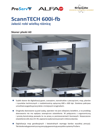 ProServ ScannTECH 600i-fb Jakość robi wielką różnicę Skaner płaski A0 Szybki skaner do digitalizacji gazet, czasopism, starodruków z pieczęciami, map, planów i rysunków technicznych z rozdzielczością optyczną 600 x 600 dpi. Dzielona pokrywa umożliwia wygodną pracę także z mniejszymi oryginałami. Oryginały skanowane są pod szybą, operator nie jest oślepiany światłem, a na przebieg skanowania nie ma wpływu zewnętrzne oświetlenie. W połączeniu z ergonomiczną i prostą konstrukcją pozwala to na pracę w pomieszczeniach biurowych. Nowoczesne oświetlenie LED, bez UV i IR, zapewnia wykonanie ponad 1 miliona skanów. Digitalizacja map geodezyjnych i katastralnych wymaga bardzo wysokiej precyzji. Tak doskonałą geometryczną precyzję gwarantują wszystkie systemy ProServ. ProServ *dane techniczne mogą ulec zmianie Firma Alfa-Copy jest autoryzowanym przedstawicielem firmy ProServ w Polsce. Jakość robi wielką różnicę Wszystkie skanery ProServ charakteryzują się: najwyższą jakością po same brzegi oryginałów – ostrość, kontrast, rozdzielczość optymalnym odwzorowaniem szczegółów najwyższą dokładnością (polecane do katastrów i zastosowań GIS) brakiem wpływu zewnętrznego oświetlenia na rezultaty skanów, co umożliwia wygodną pracę przy świetle dziennym W ofercie ProServ znajdują się ponadto skanery do książek w formatach A2, A1 i A0, o rozdzielczości 400, 600 i 800 dpi. Skanery mogą być wyposażone w stoły do książek do grubości 35 cm. ProServ to także doskonałe kamery hybrydowe i kamery mikrofilmowe.