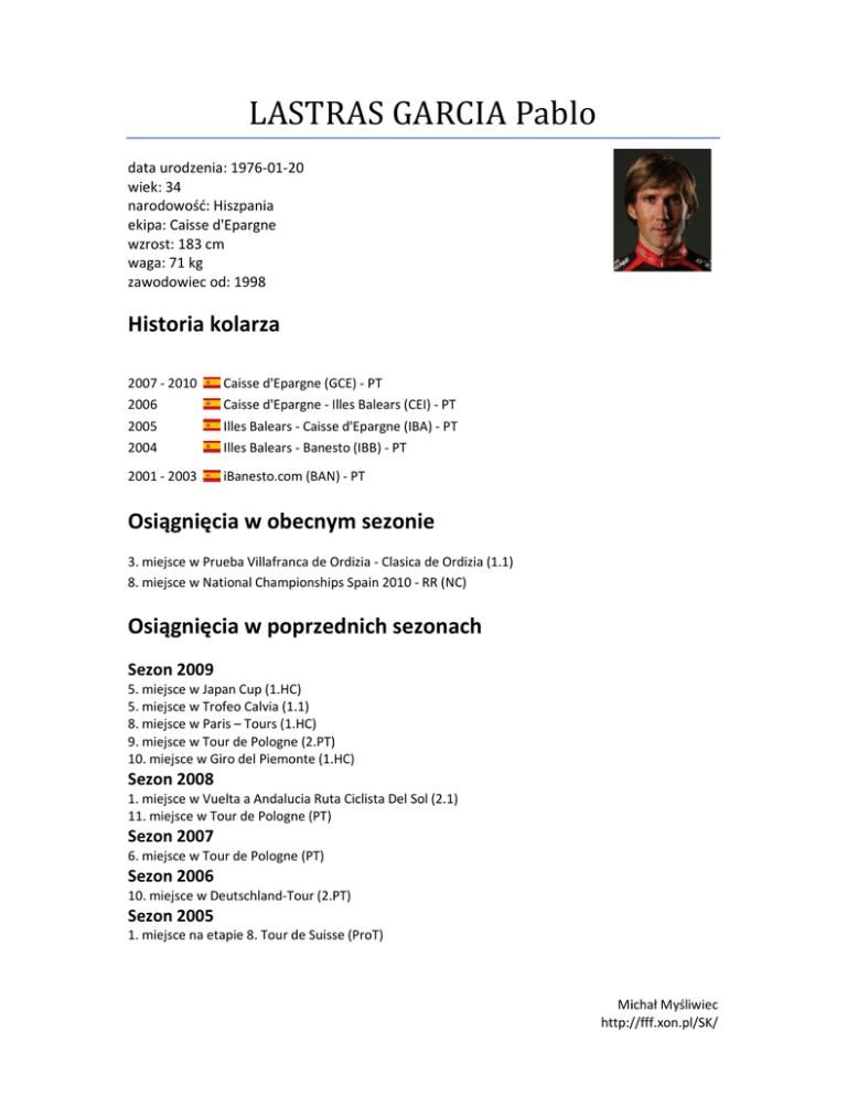 LASTRAS GARCIA Pablo data urodzenia: 1976-01-20 wiek: 34 narodowość: Hiszpania ekipa: Caisse d'Epargne wzrost: 183 cm waga: 71 kg zawodowiec od: 1998 Historia kolarza 2007 - 2010 2006 2005 2004 Caisse d'Epargne (GCE) - PT Caisse d'Epargne - Illes Balears (CEI) - PT Illes Balears - Caisse d'Epargne (IBA) - PT Illes Balears - Banesto (IBB) - PT 2001 - 2003 iBanesto.com (BAN) - PT Osiągnięcia w obecnym sezonie 3. miejsce w Prueba Villafranca de Ordizia Ordi - Clasica de Ordizia (1.1) 8. miejsce w National Championships Spain 2010 - RR (NC) Osiągnięcia w poprzednich sezonach Sezon 2009 5. miejsce w Japan Cup (1.HC) 5. miejsce w Trofeo Calvia (1.1) 8. miejsce w Paris – Tours (1.HC) 9. miejsce w Tour de Pologne (2.PT) 10. miejsce w Giro del Piemonte (1.HC) Sezon 2008 1. miejsce w Vuelta a Andalucia ia Ruta Ciclista Del Sol (2.1) 11. miejsce w Tour de Pologne (PT) Sezon 2007 6. miejsce w Tour de Pologne (PT) Sezon 2006 10. miejsce w Deutschland-Tour (2.PT) Sezon 2005 1. miejsce na etapie 8. Tour de Suisse (ProT) Michał Myśliwiec http://fff.xon.pl/SK/